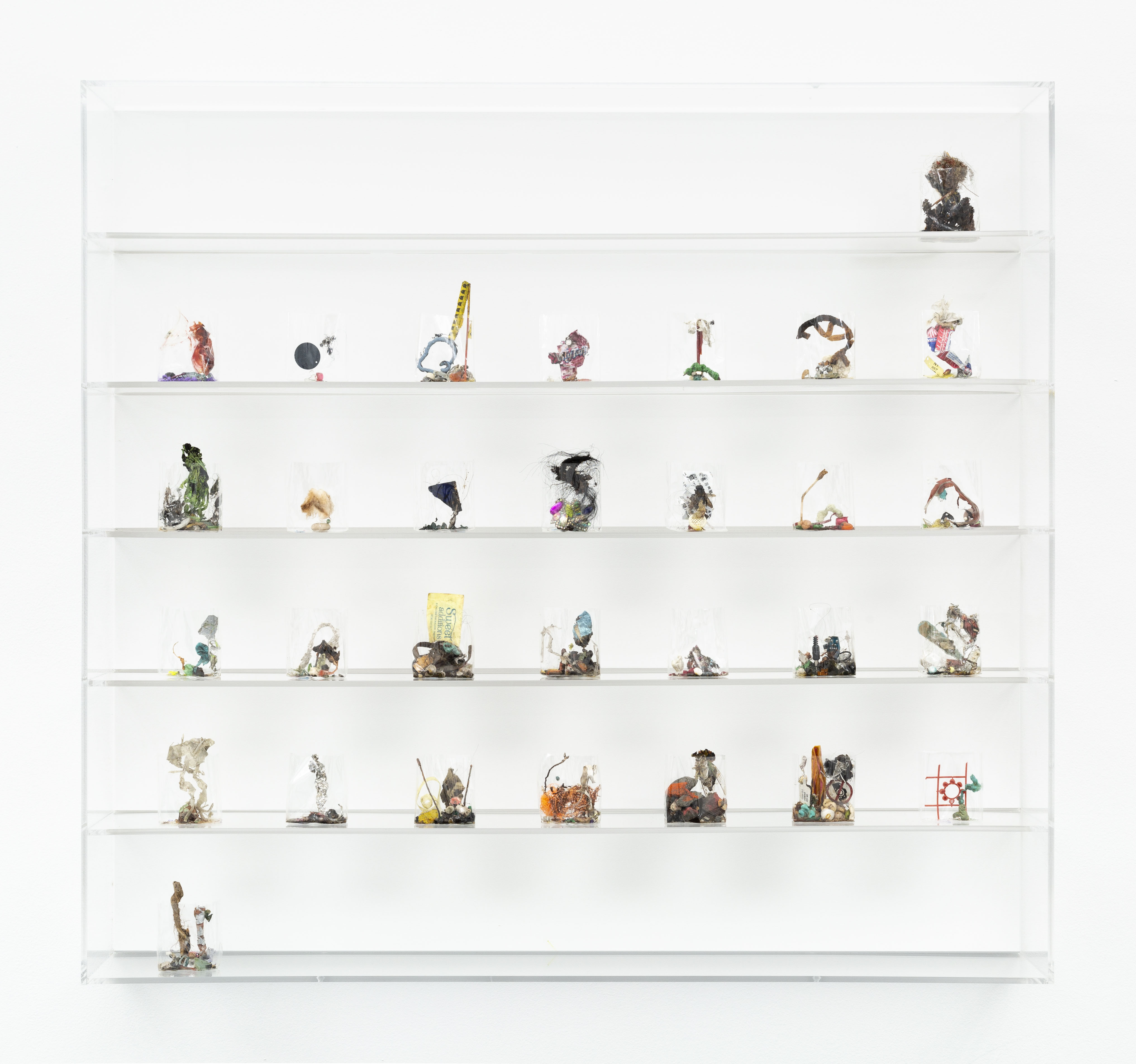 Mixed media in cigarette pack cellophane wrappers (30 units) on wood backed acrylic shelf, latex paint