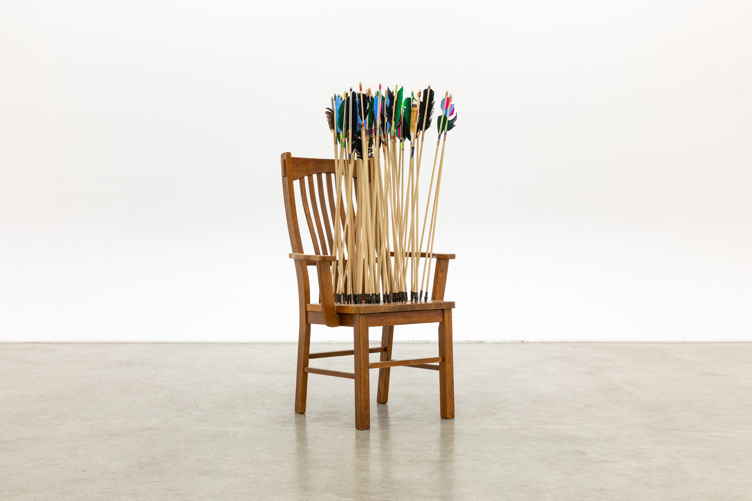 Oak chair, wood arrows, carbon steel points, feathers, artificial sinew
