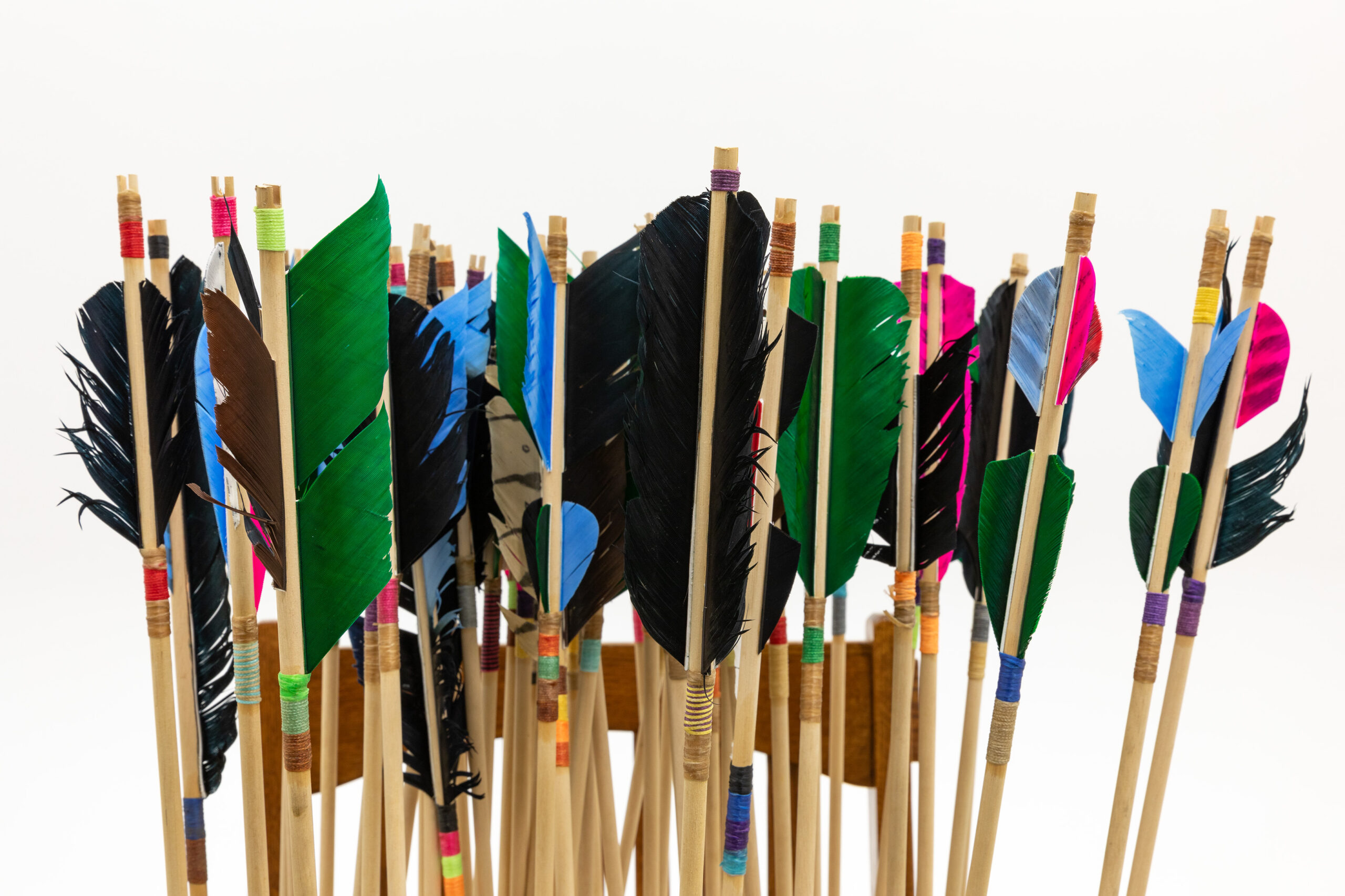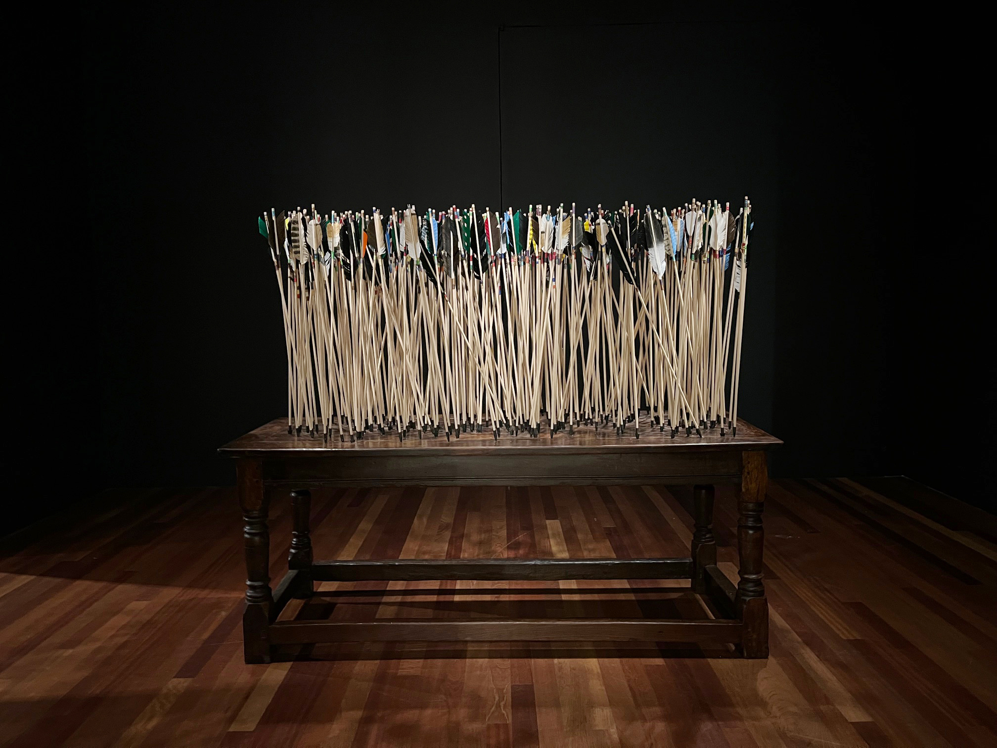 Brian Jungen, The way of the world is to bloom and to flower and die but in the affairs of men there is no waning and the noon of his expression signals the onset of night, 2024, 250-year-old French colonial oak table from Baton Rouge, wood arrows, carbon steel points, feather, artificial sinew, on view at the Ogden Museum of Southern Art for the Prospect.6 Triennial.