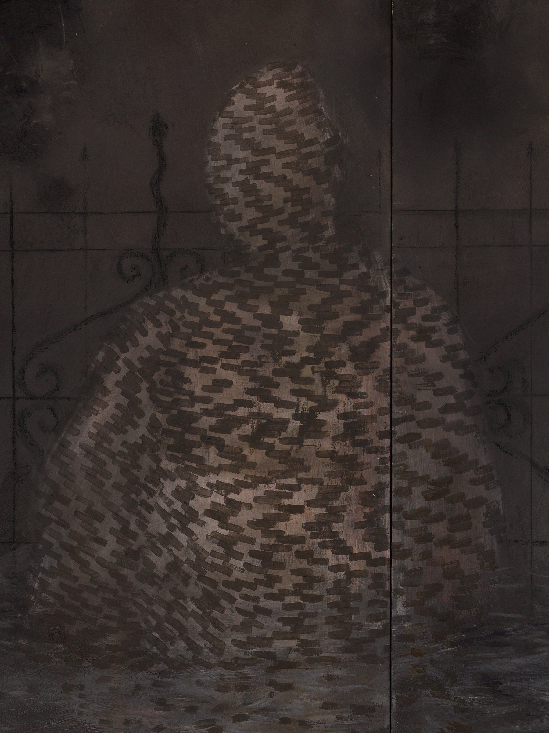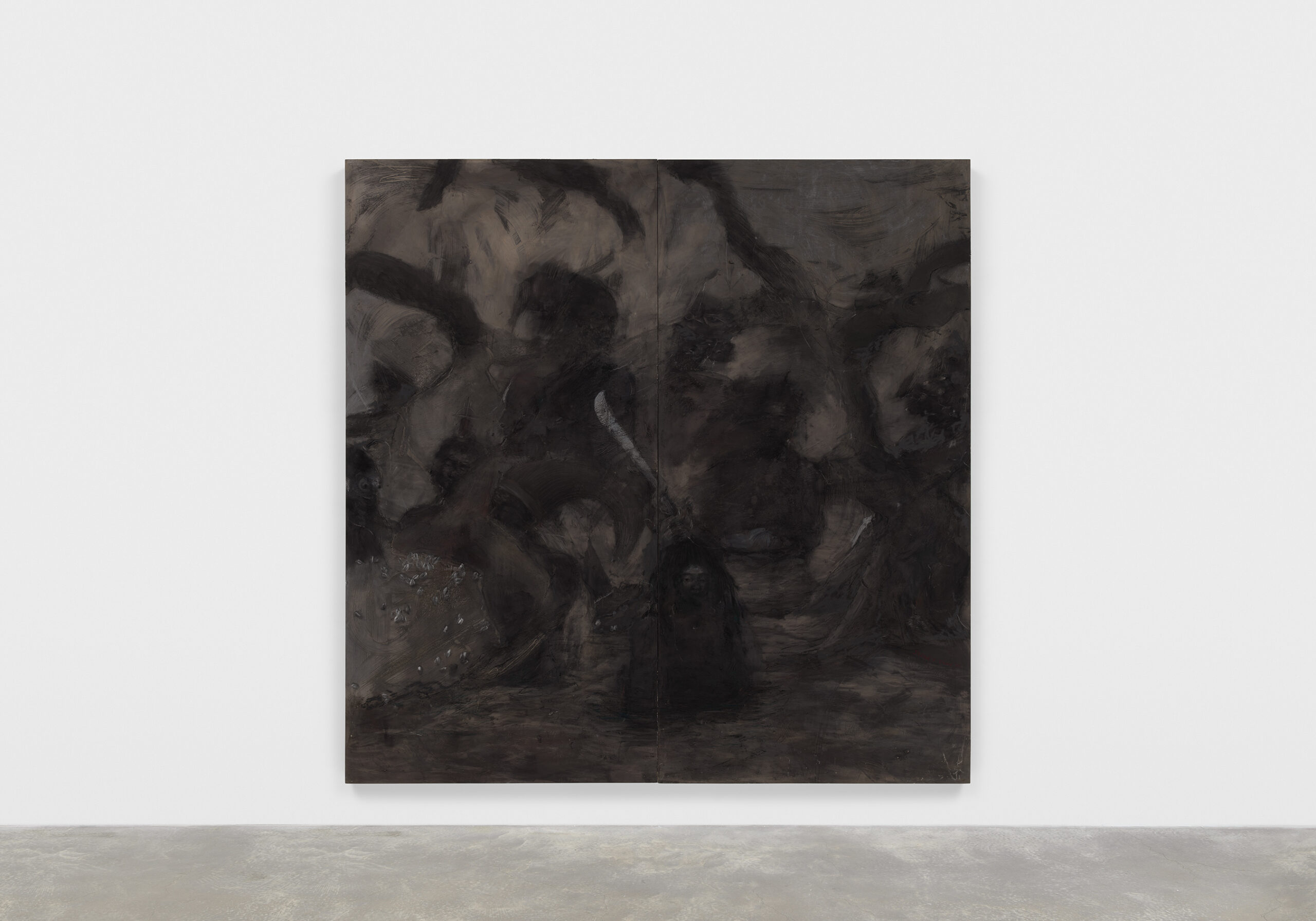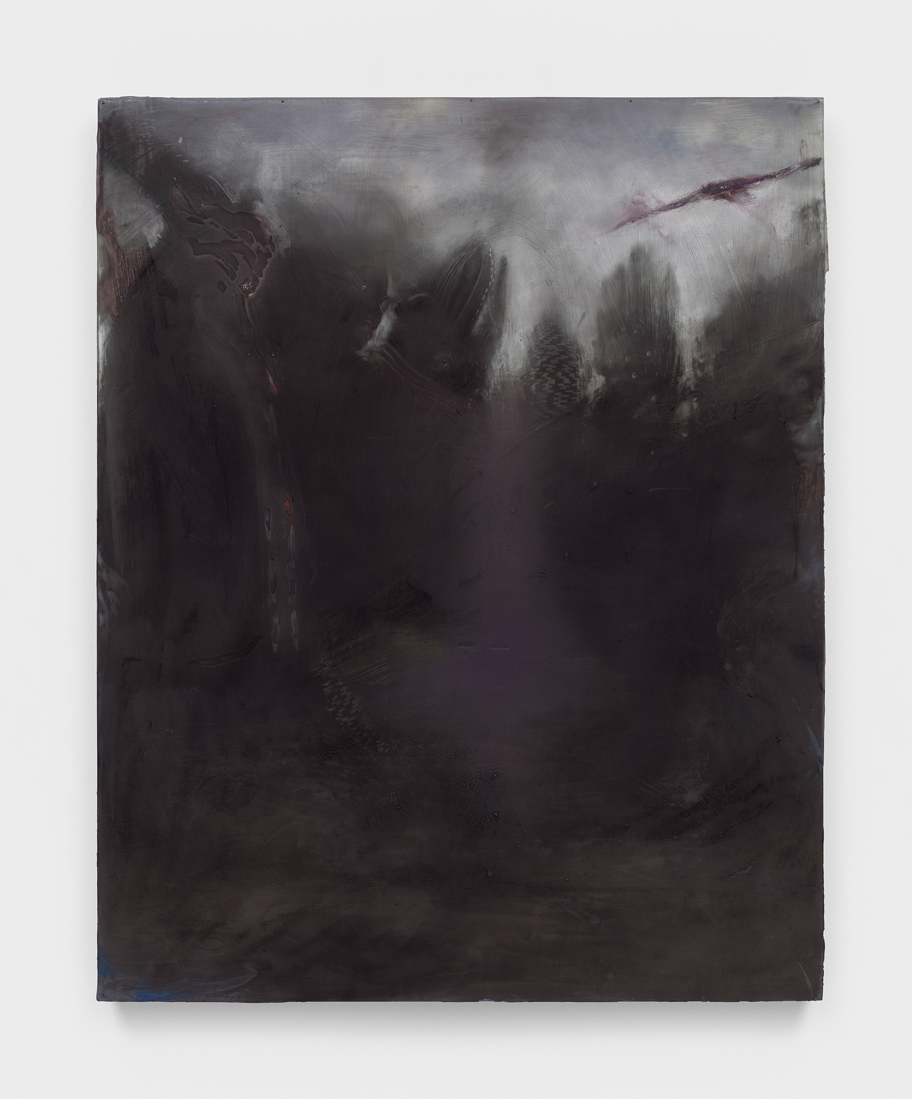 Acrylic, iron oxide, steel, charcoal, and graphite on wood