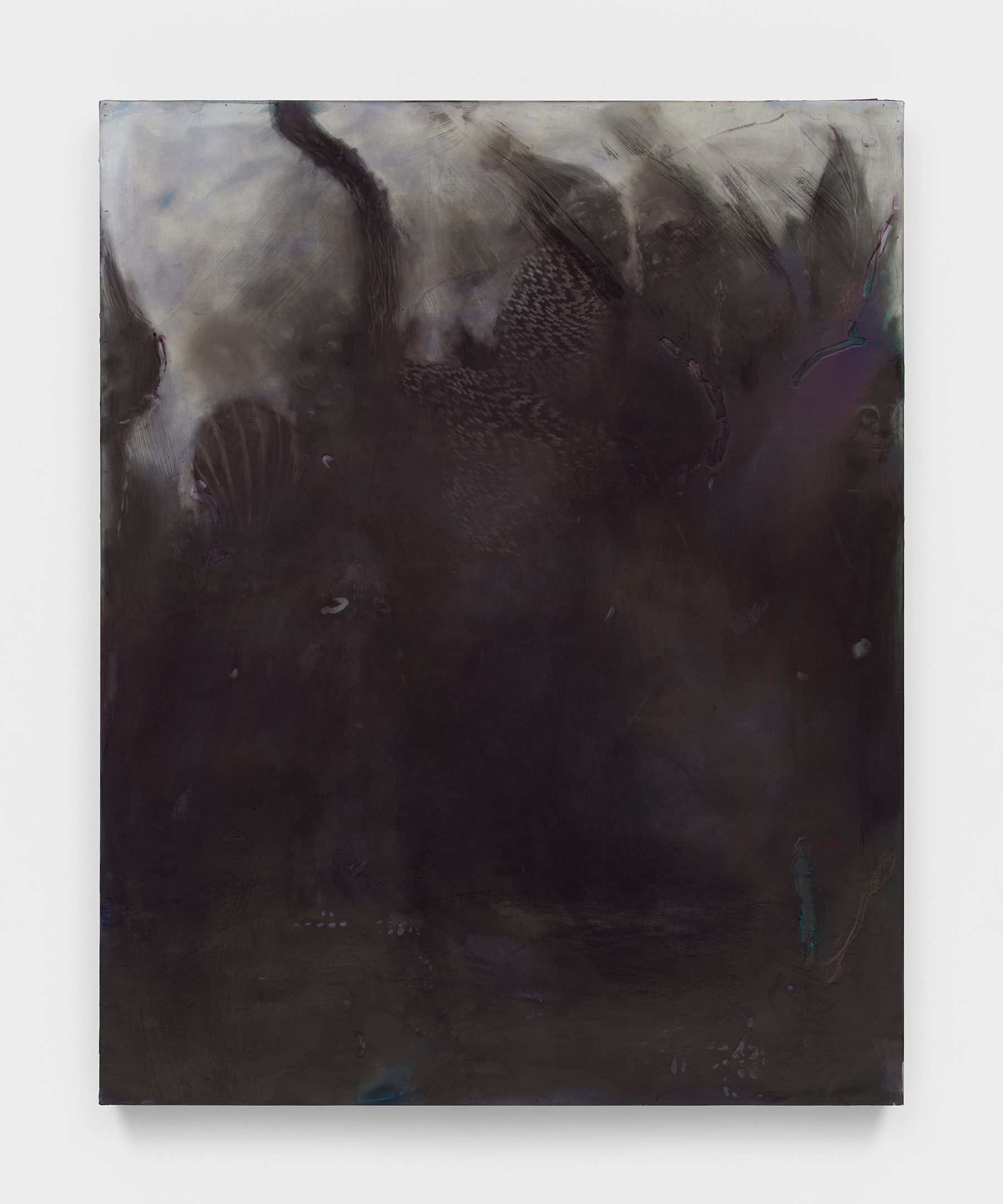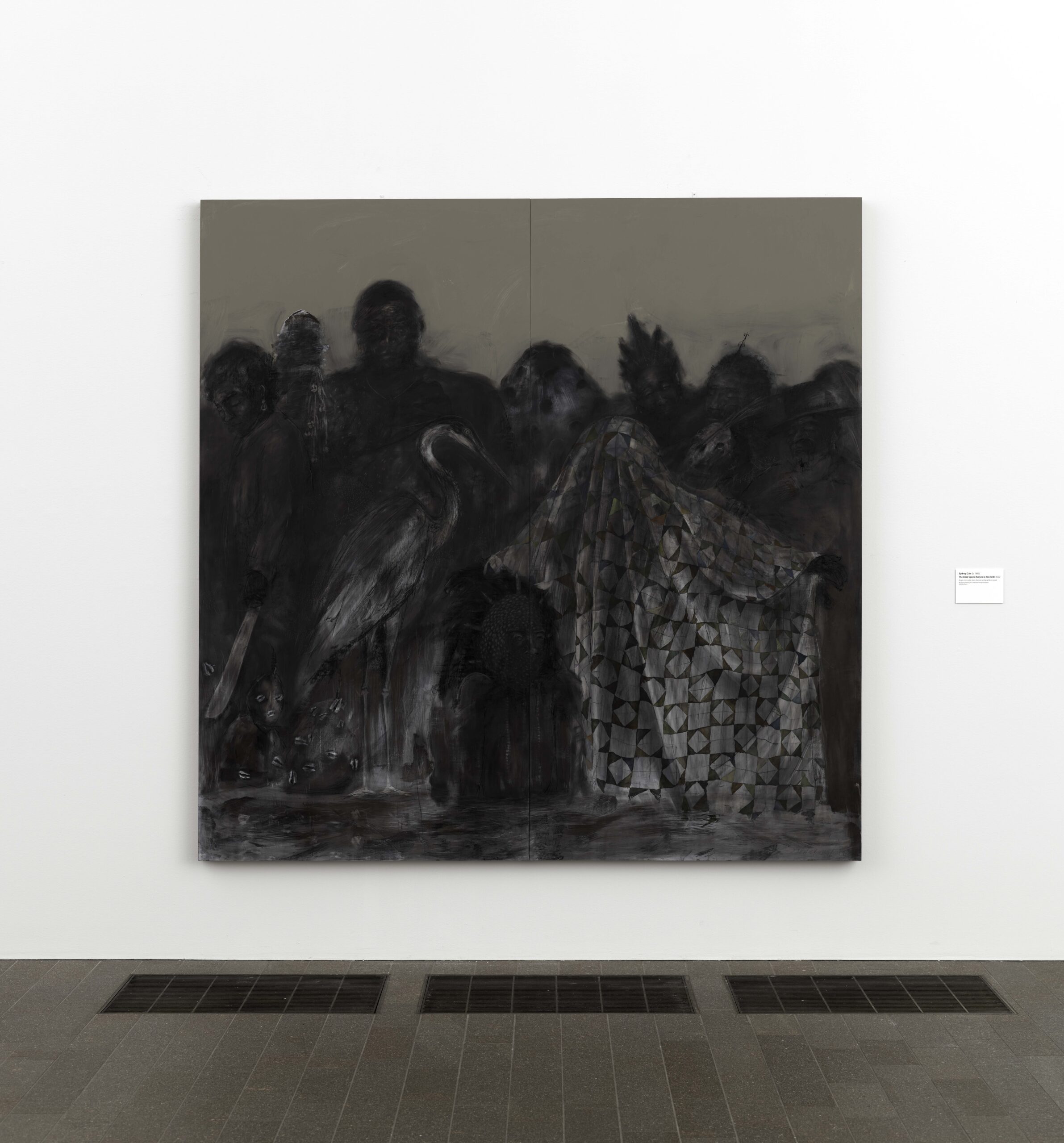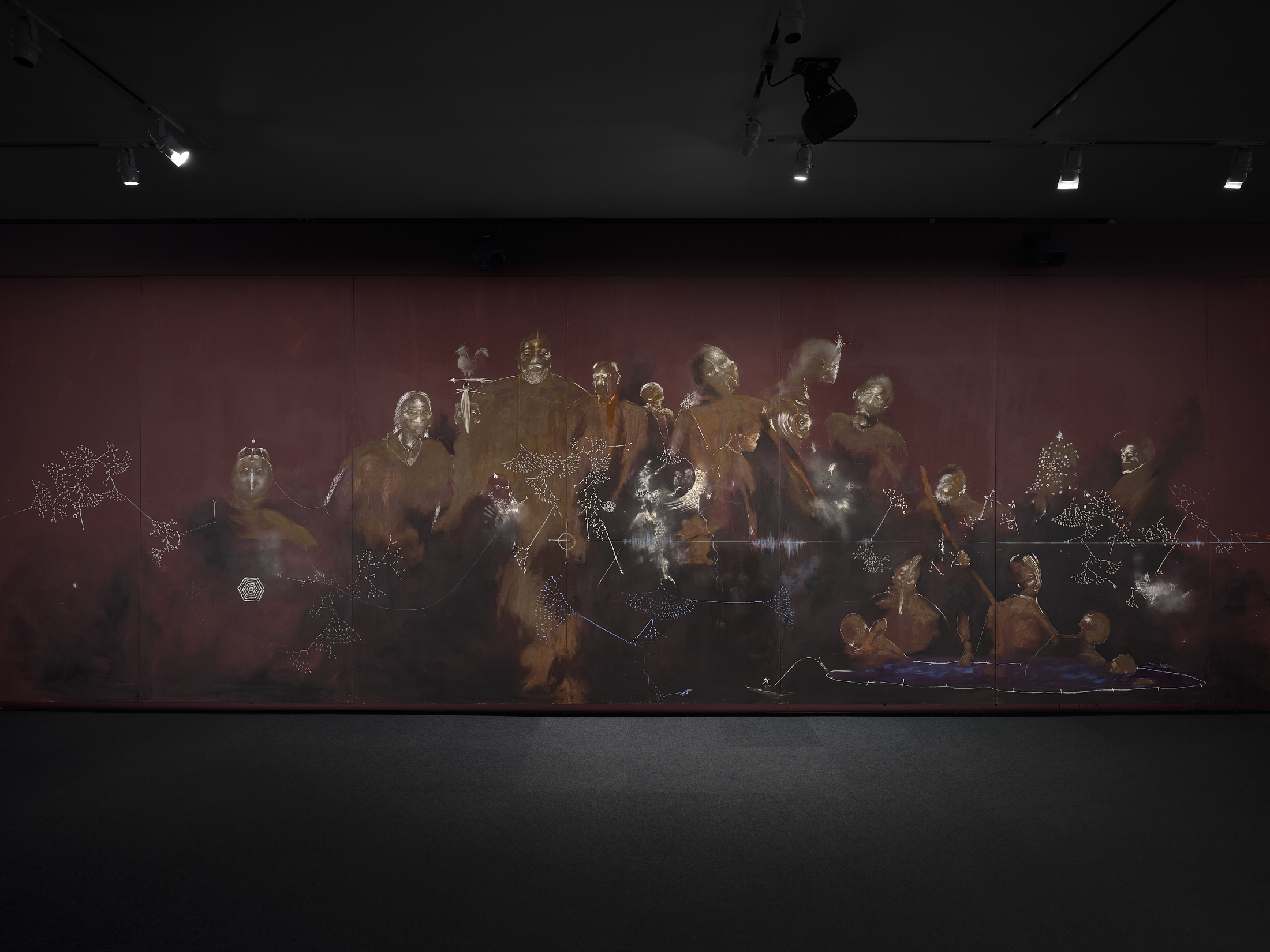 Acrylic, iron oxide, steel, charcoal, and graphite on wood