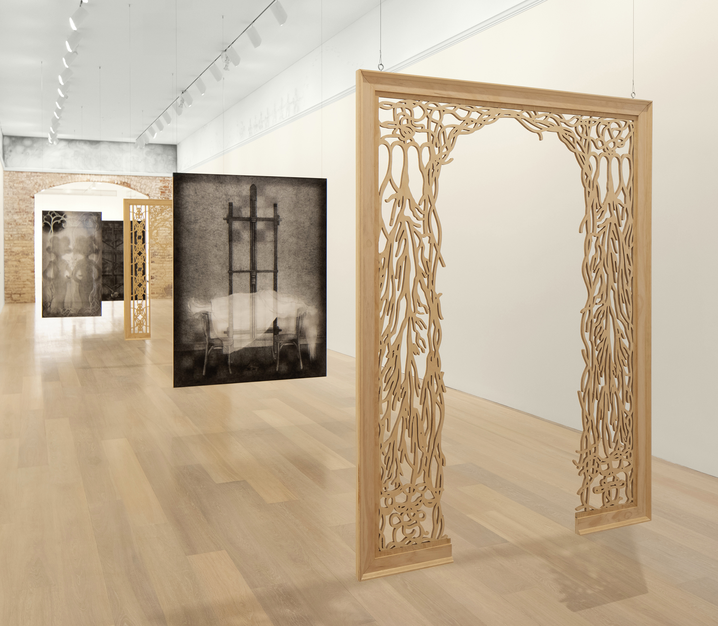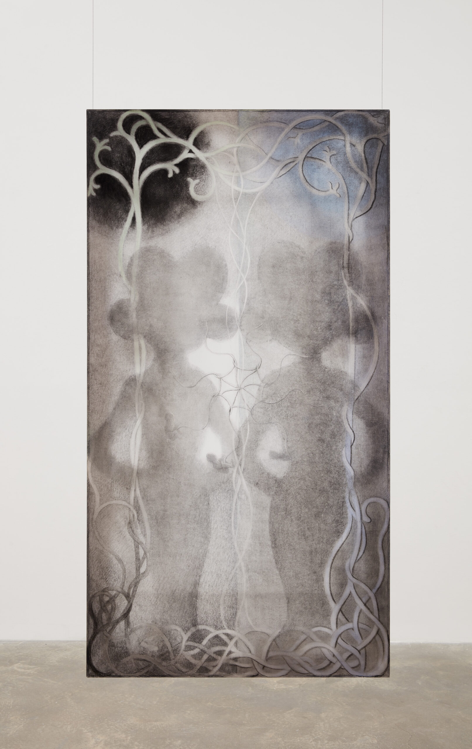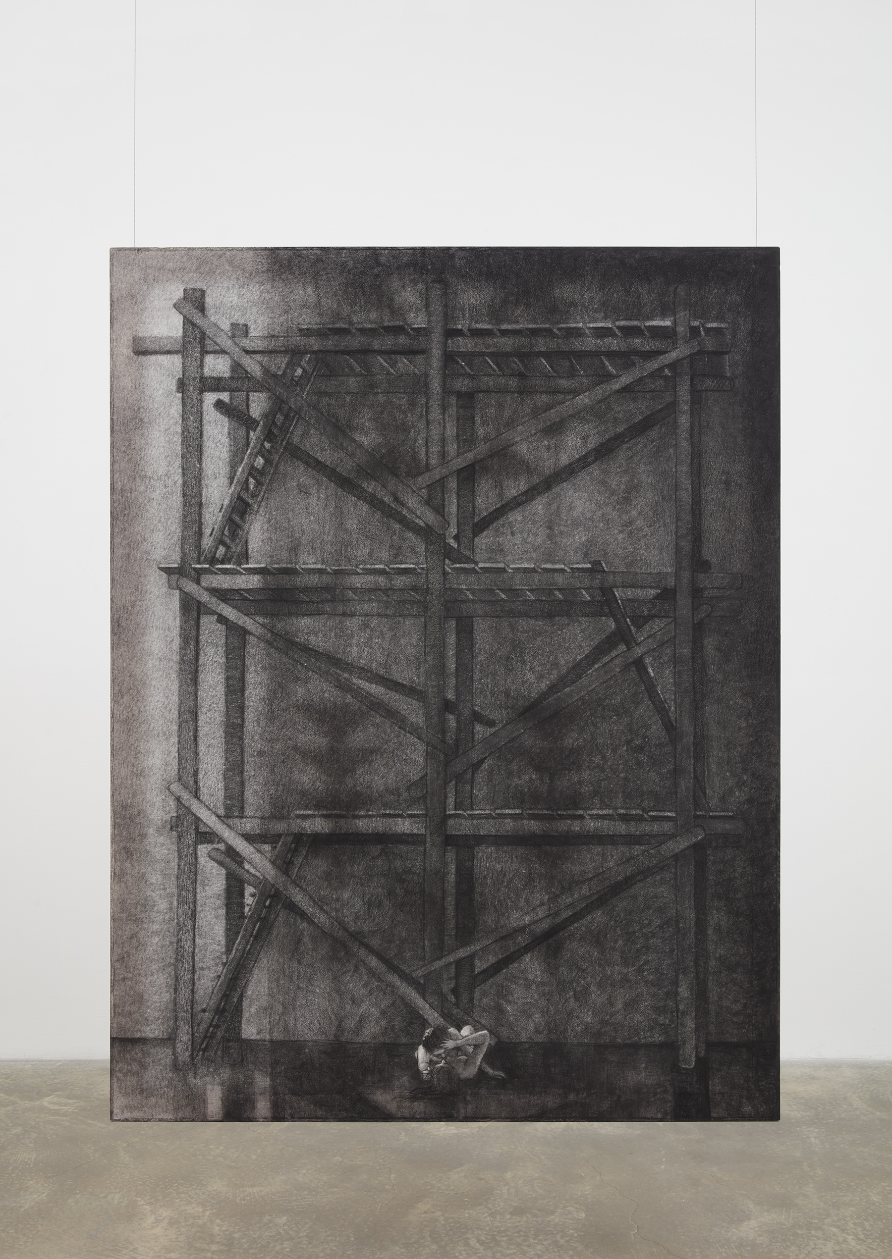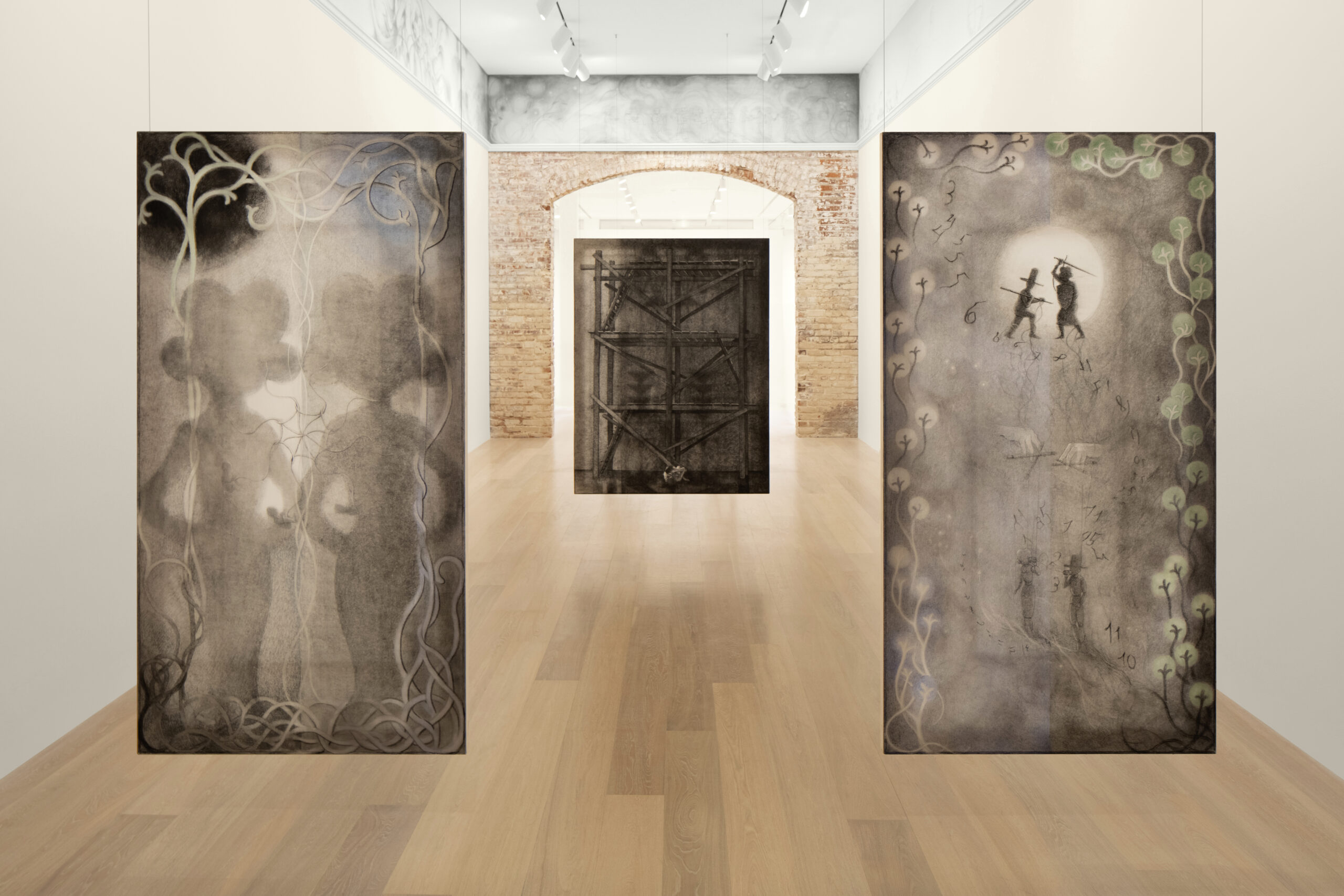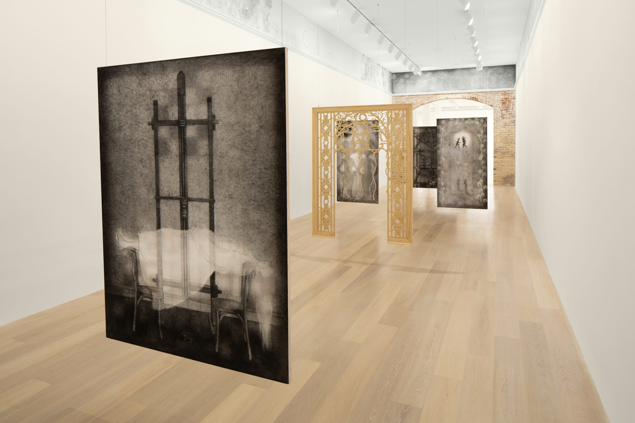 Kim’s spectral paintings are created on translucent silk, revealing the silhouettes of their intricately shaped stretchers on the opposite side. These paintings are suspended from the ceiling alongside carved wooden archways, creating paths to be navigated by viewers, while simultaneously presenting enigmatic images that slip between tangible and obscure. Executed predominately in softly rendered shades of gray with subtle touches of color, they depict human figures in relation to support systems like scaffolding and artist’s easels — structures that function similarly to stretcher bars: skeletal, ghostlike, and often overlooked yet integral to the act of creation.