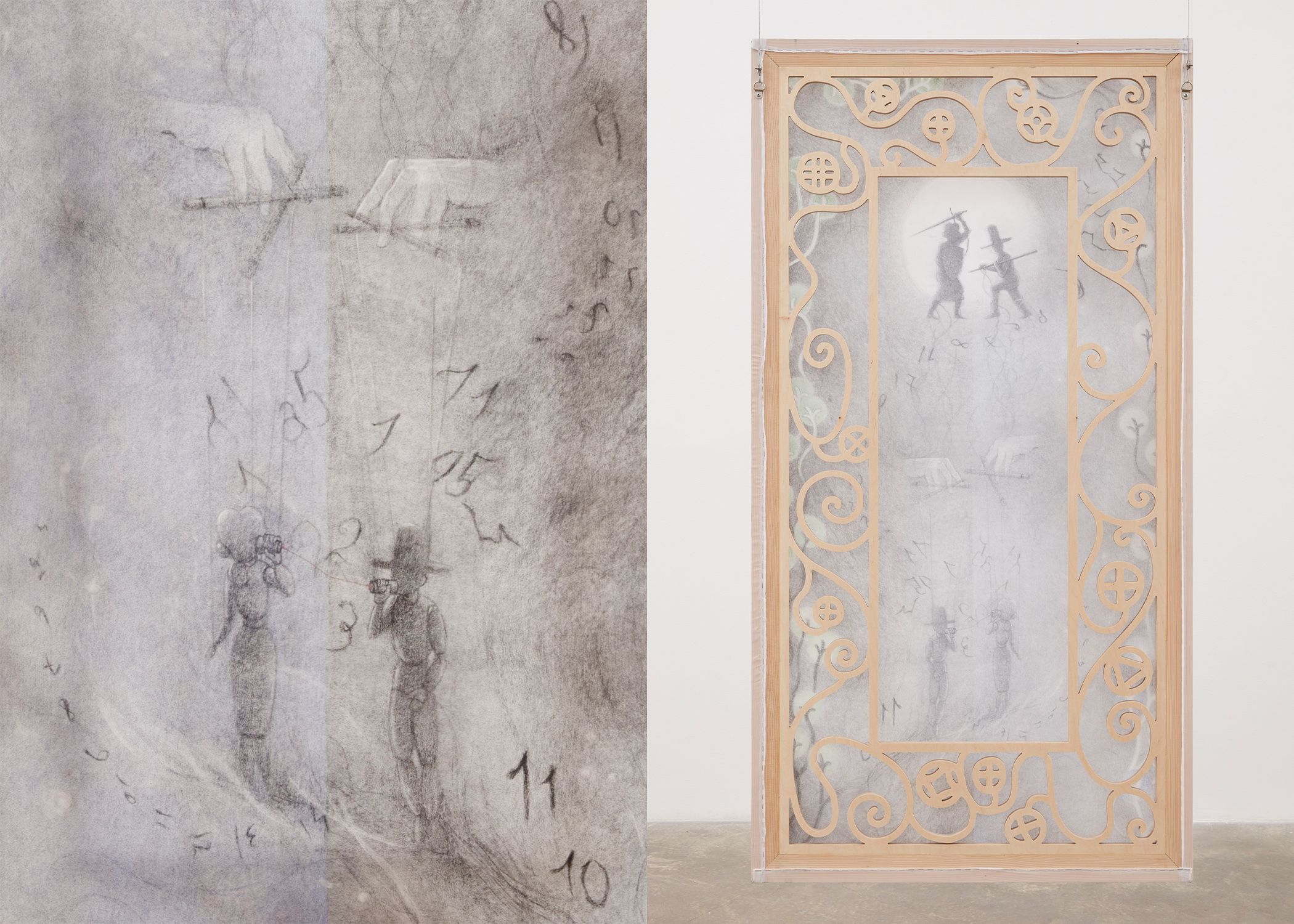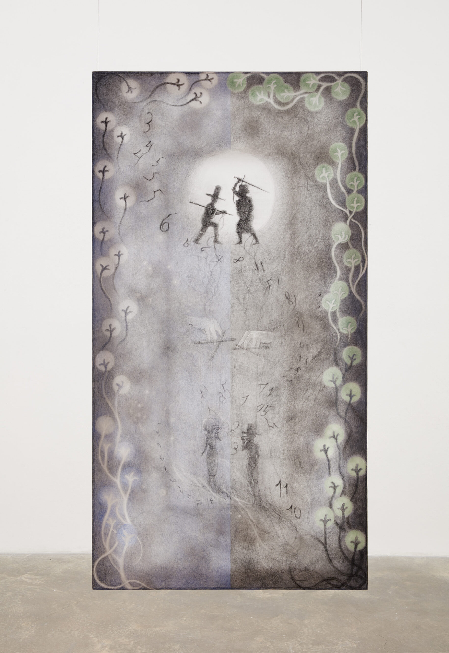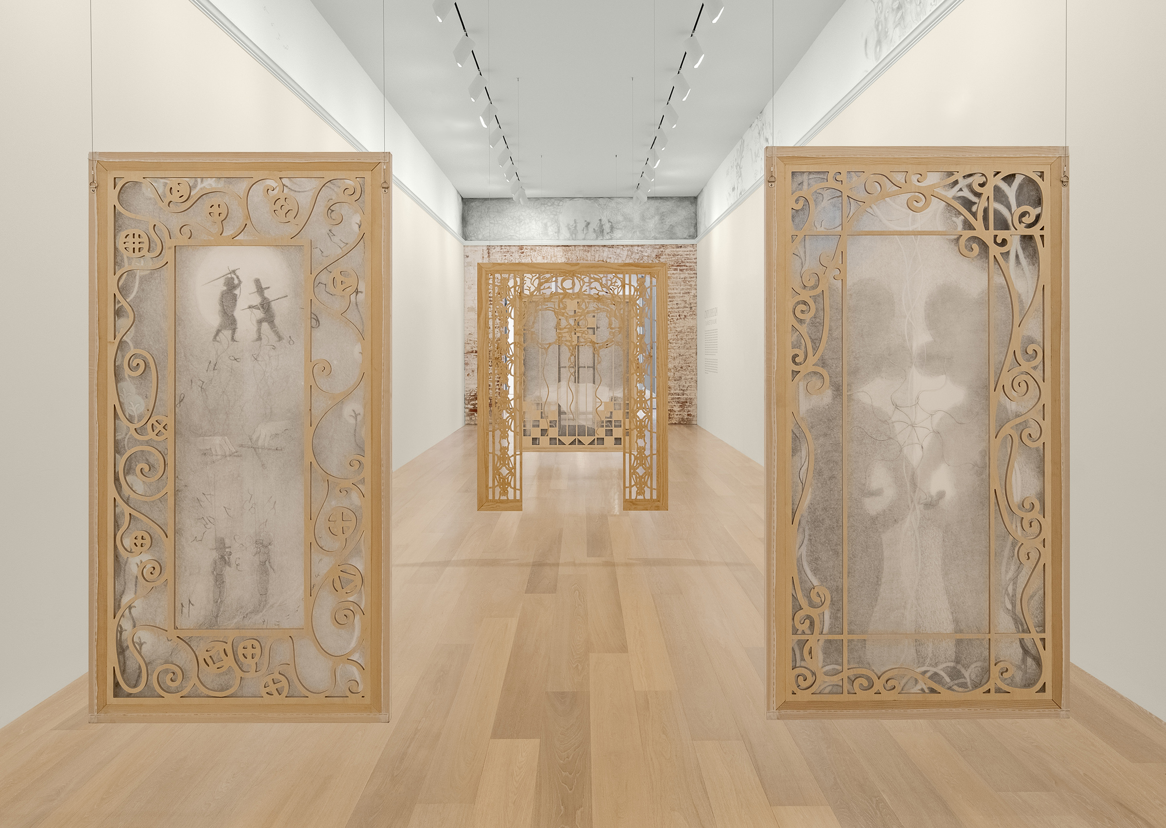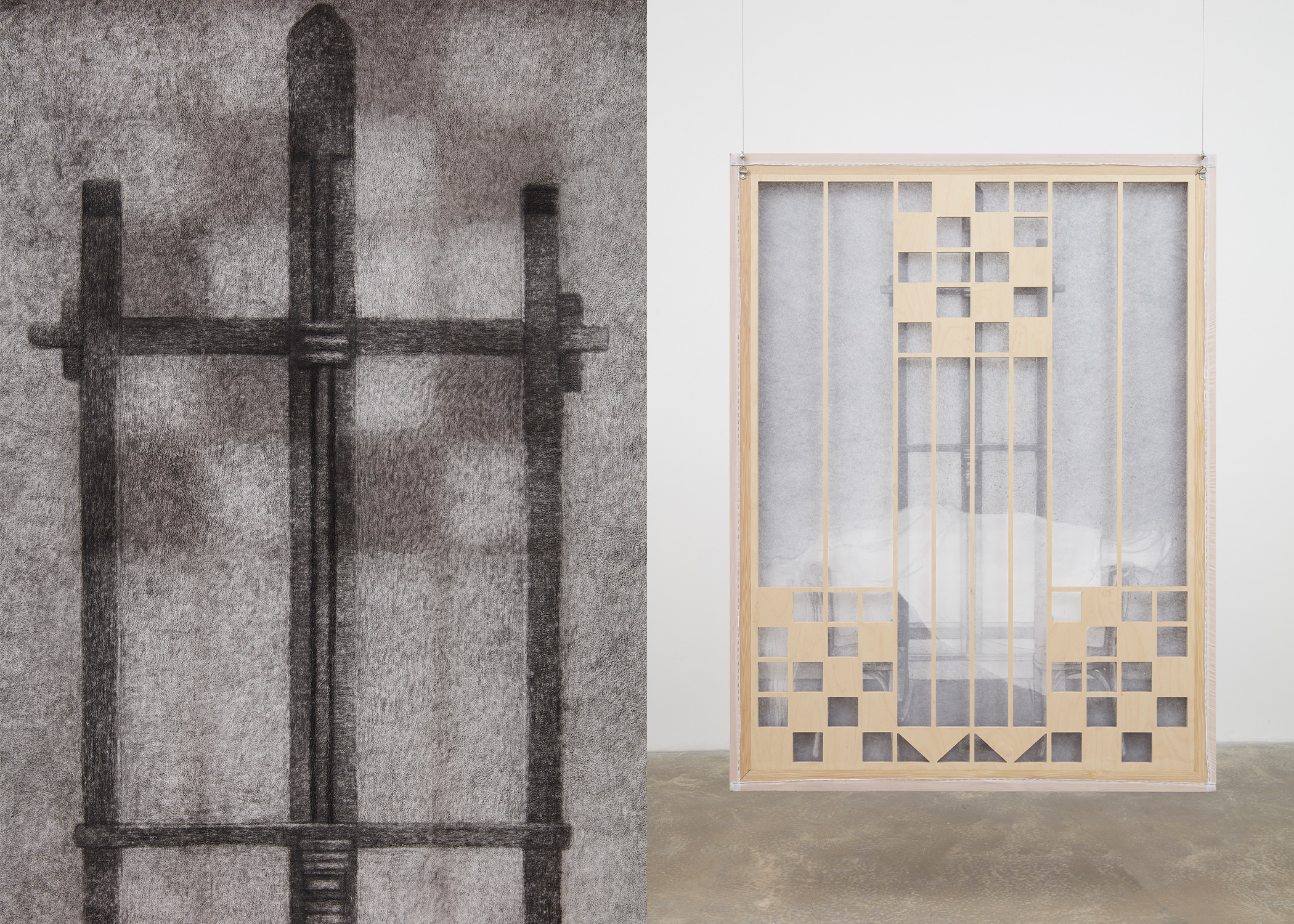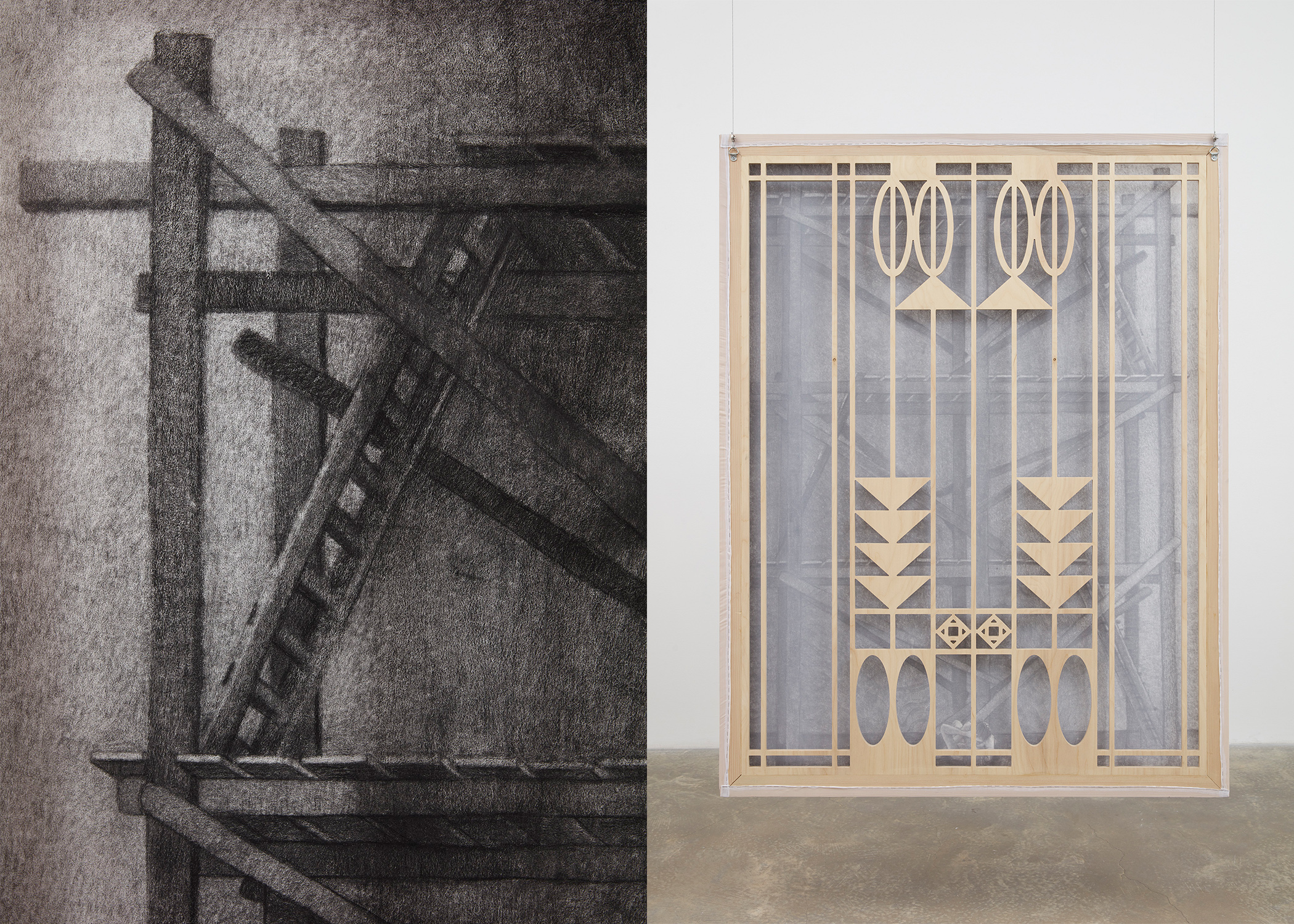 Kim’s spectral paintings are created on translucent silk, revealing the silhouettes of their intricately shaped stretchers on the opposite side. These paintings are suspended from the ceiling alongside carved wooden archways, creating paths to be navigated by viewers, while simultaneously presenting enigmatic images that slip between tangible and obscure. Executed predominately in softly rendered shades of gray with subtle touches of color, they depict human figures in relation to support systems like scaffolding and artist’s easels — structures that function similarly to stretcher bars: skeletal, ghostlike, and often overlooked yet integral to the act of creation.