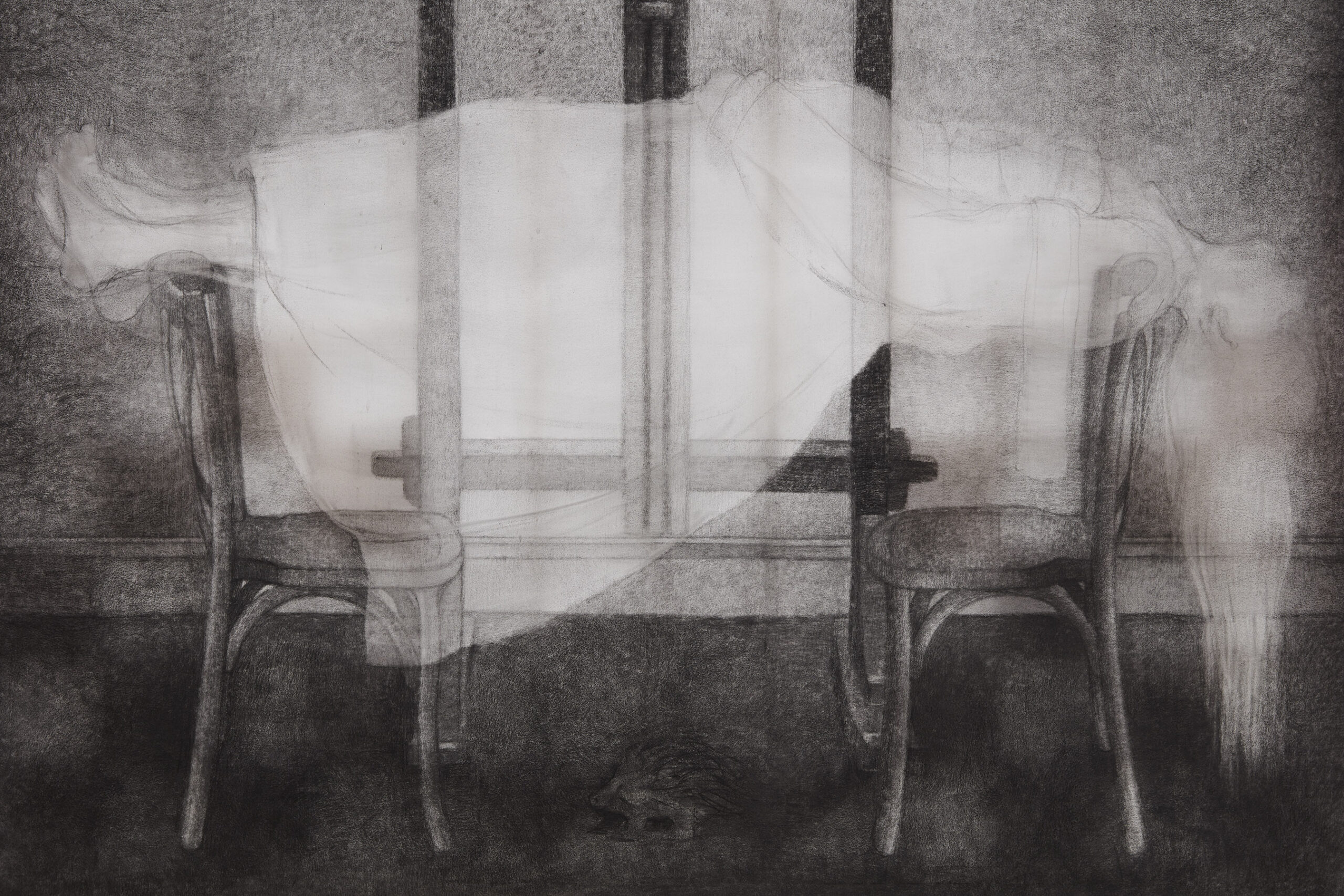 Graphite and charcoal on silk with shaped birch stretcher bars