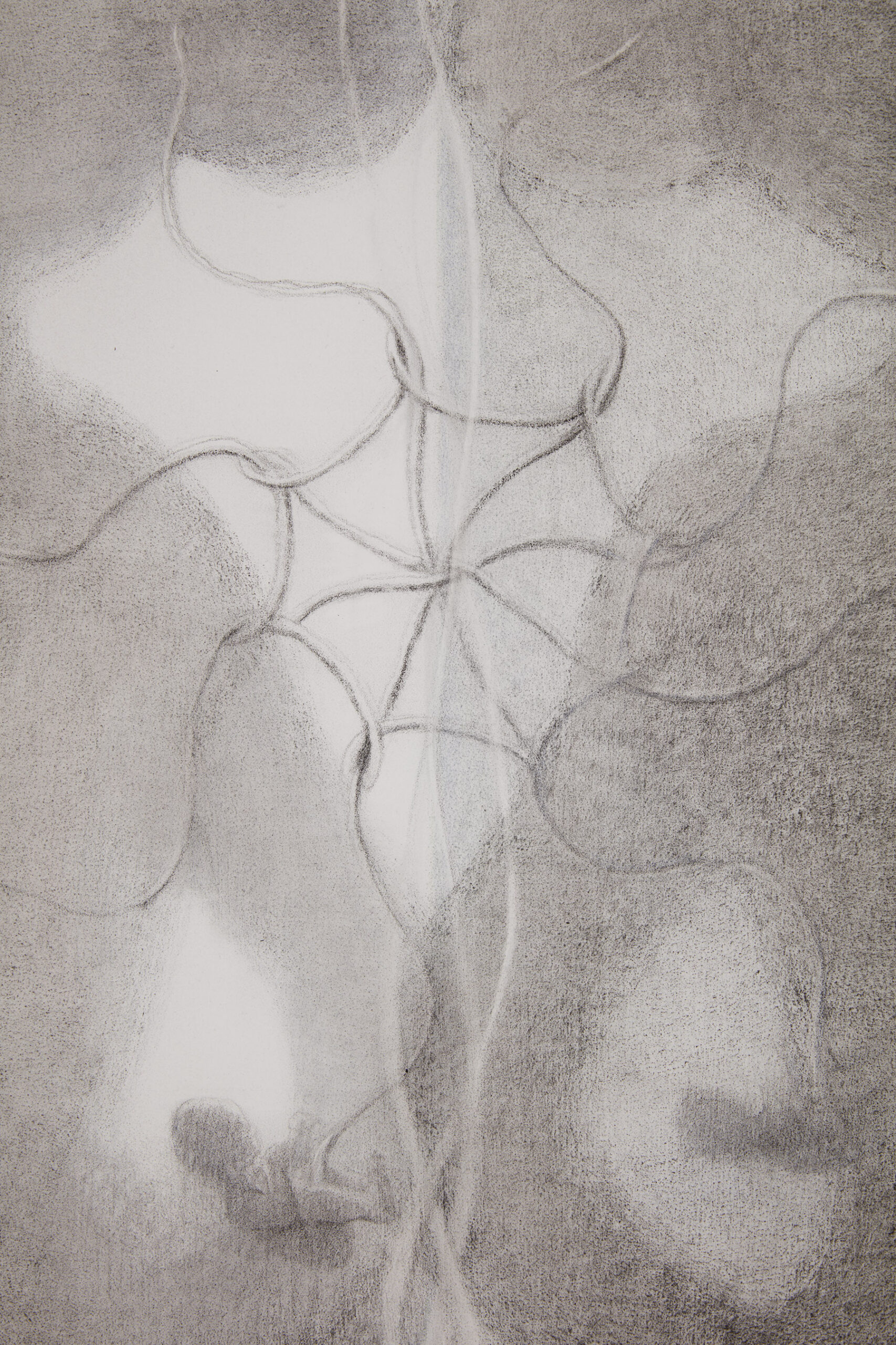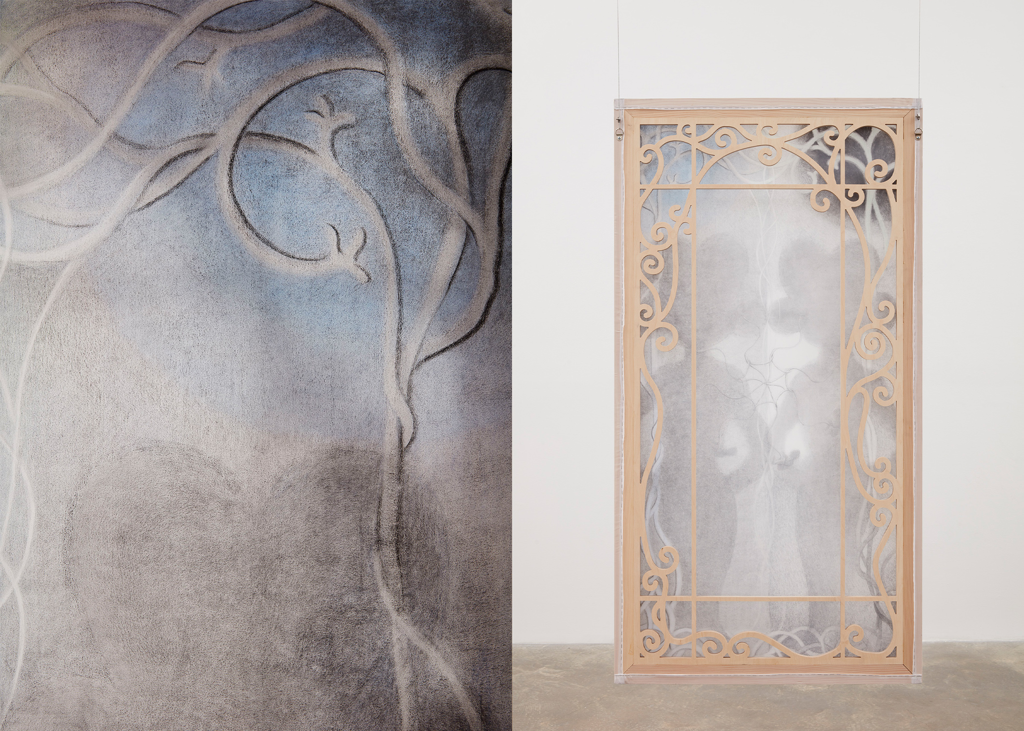 Graphite, charcoal, pastel on silk with shaped birch stretcher bars