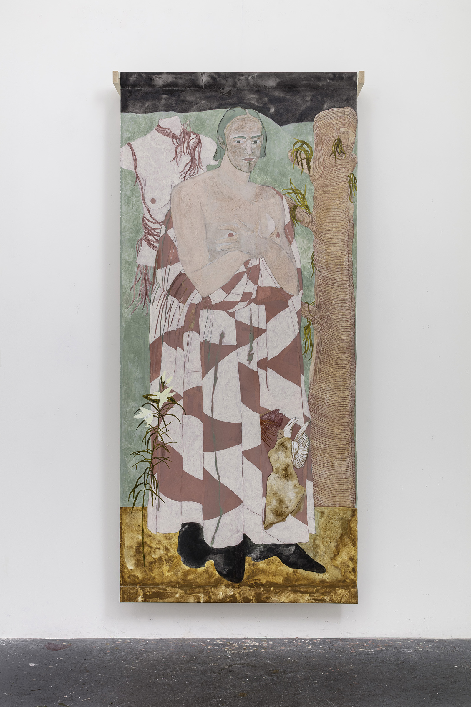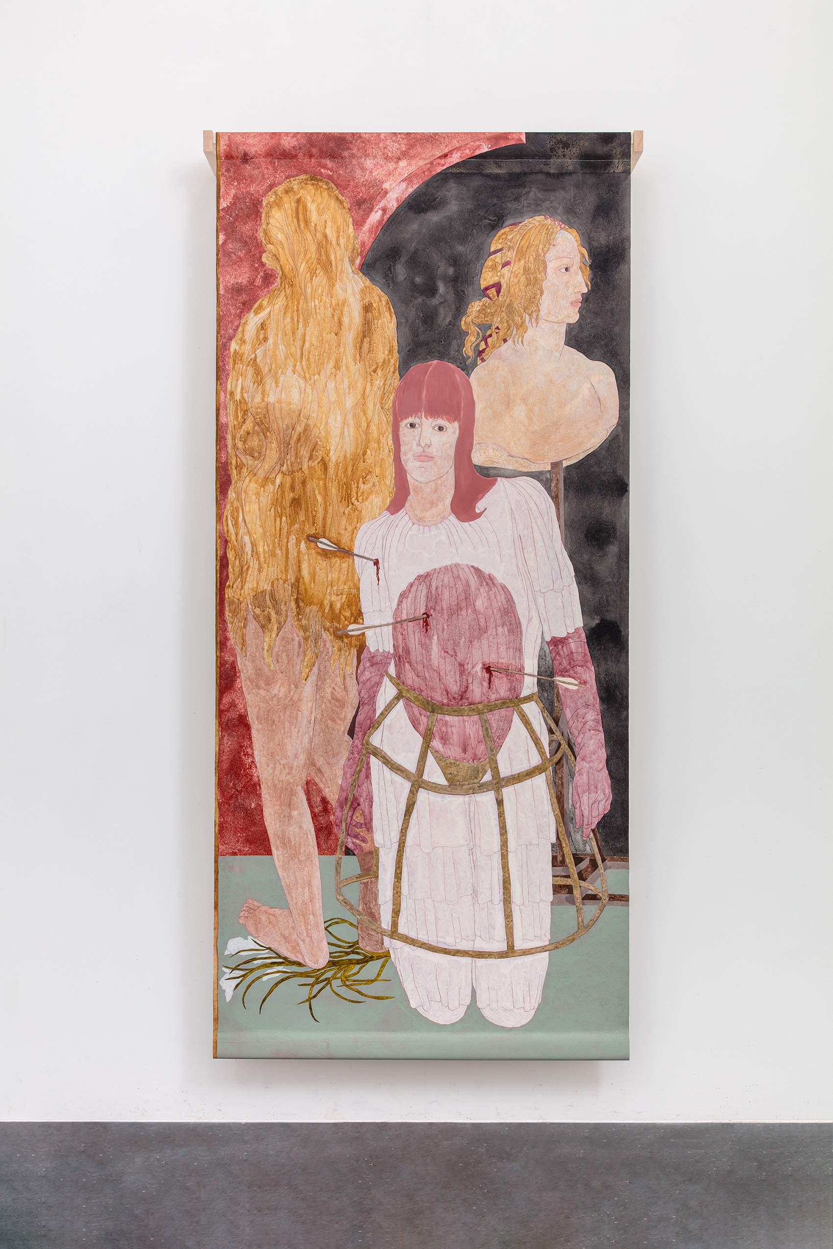 Captivated by Italian illuminated manuscripts, Renaissance paintings, along with medieval narratives and symbolism, Ella Walker transforms art historical iconography to invented, theatrical scenes of love, tragedy, and mystery. Her unstretched, large format canvases combine techniques of painting, drawing, and fresco—incorporating a vast array of mediums including, tempura, gesso, pastel, and ink. Shallow, “stage-like” depths of field are interspersed with flat planes of color that disturb her viewer’s holistic sense of structure and composition. Transforming traditional scenes and spaces into tableaux suffused with drama, romance, mischief, and playfulness, Walker’s work inhabits the enigmatic architecture of a daydream. For the artist, the ritual of painting and the act of dreaming are inextricably bound—merging to create, in Walker’s own words, a “magic realism.”