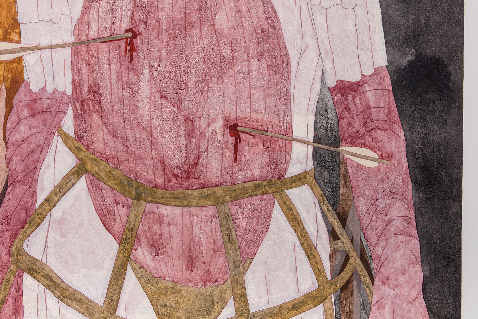 Seemingly describing the events of a nightmare, rather than those of a dream, the selected excerpt highlights the violence inflicted on the central character of Red Painting who kneels with her hands clasped, adorned in small gashes that cover her exposed chest and shoulders, while vivid iron-oxide red pigment used to render drops of blood recall the embellished, dramatized quality of stage makeup. These fictional visions, planted within Walker’s theatrically inclined environments, compel her viewers to imagine a world separate from reality. As the artist states, “I’m drawn to the transformation, the ritual, the ceremony, the party. So, when I’m making a painting, I am thinking about an event, and how I can make a version of an exciting experience.”