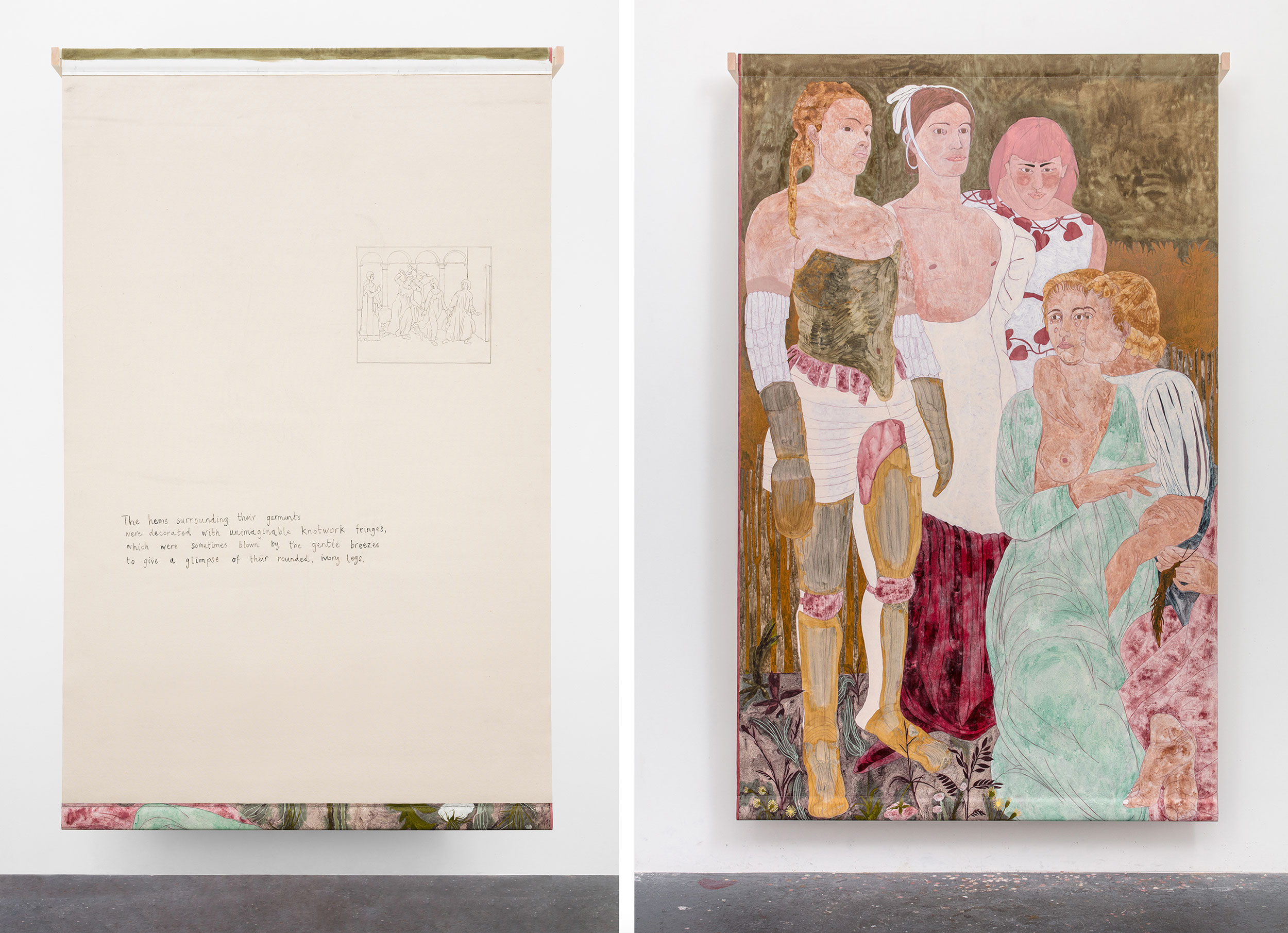 Her images—lighthearted yet unsettling—decisively position Walker’s contemporary perspective within a medieval world through the inclusion of current fashion, and a vibrant color palette. In works like Sacred Conversation Painting (2021), the artist reimagines classical figures and costume, infusing this invented world of the past with satire and contemporary aesthetics. The title of the work is inspired by sacra conversazione, a genre of painting developed in the Italian Renaissance—an era the artist often draws from for its use of color and composition. On the verso of Sacred Conversation Painting, Walker transcribes an excerpt from The Strife of Love in a Dream describing the garments worn by the characters amidst a tense passage of the story, which reads,