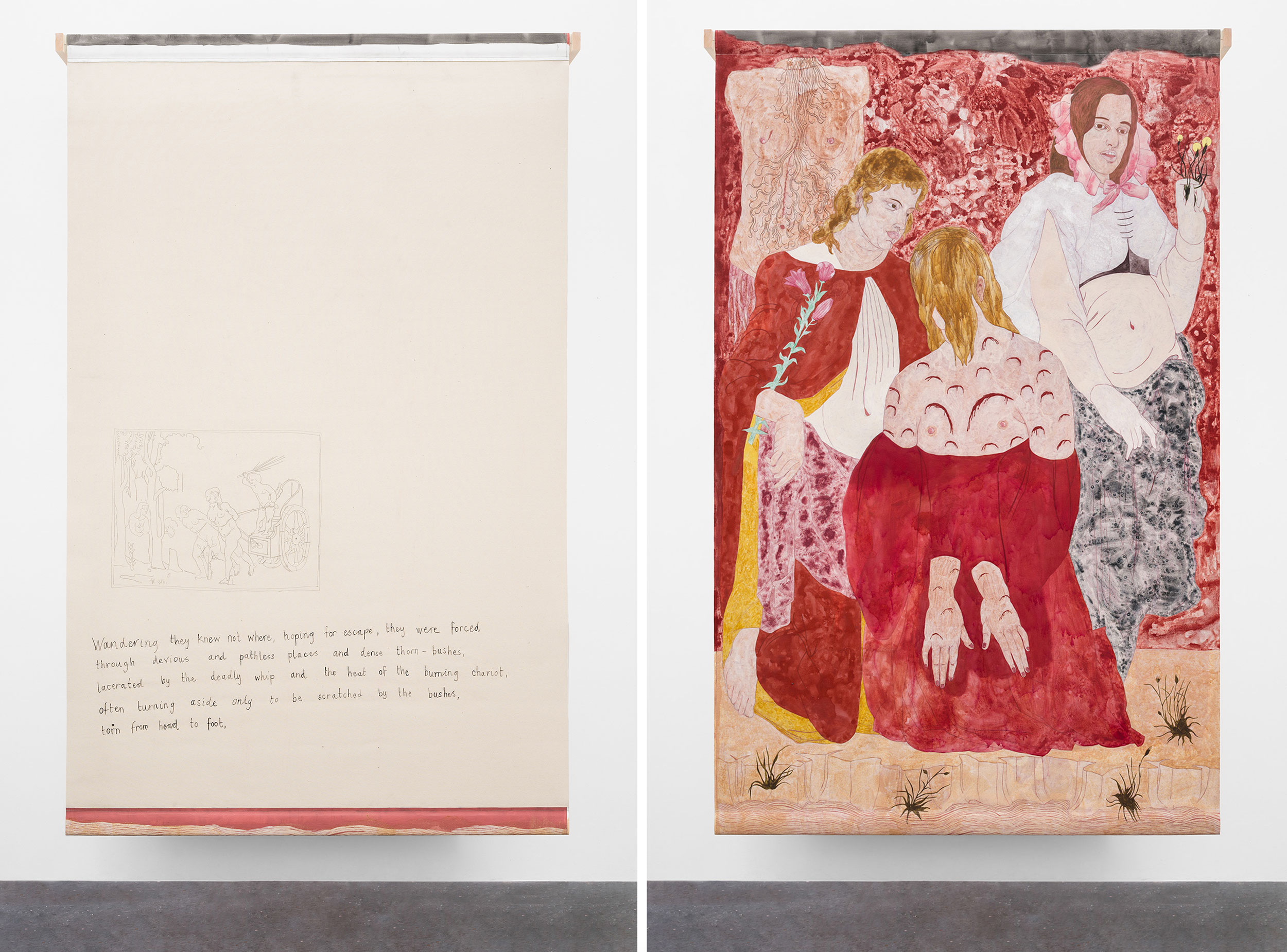 Walker produces dreamscapes that are often physically and spatially impossible. The resulting paintings contain a multitude of exceptionally thin layers of paint, and washes of pure pigment that are applied gradually to yield ethereal veils of color over underpainted outlines. Through her close engagement with allegory in Poliphilo’s journey in The Strife of Love in a Dream, Walker became transfixed by the potential physical, transformative space of dreaming. Red Painting (2021) highlights this fascination with these spaces of the unconscious, as the composition can only exist within an imagined landscape. The referenced text and illustration on the verso of Red Painting, relates to the tearing of flesh as bodies move through this fantasy realm,
