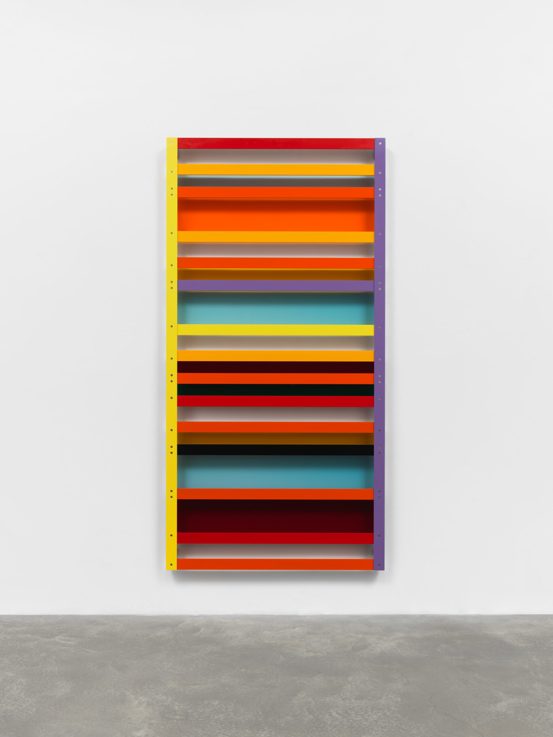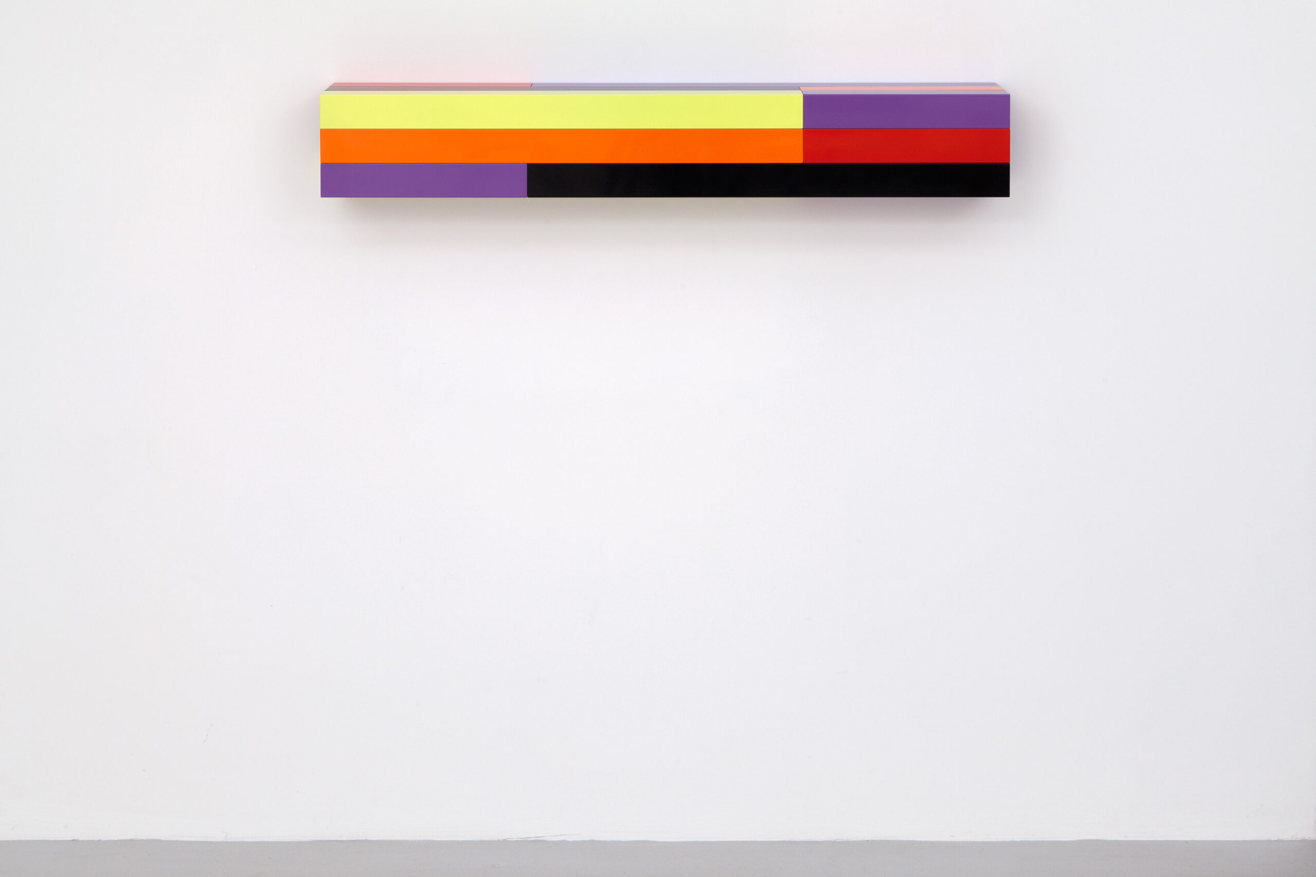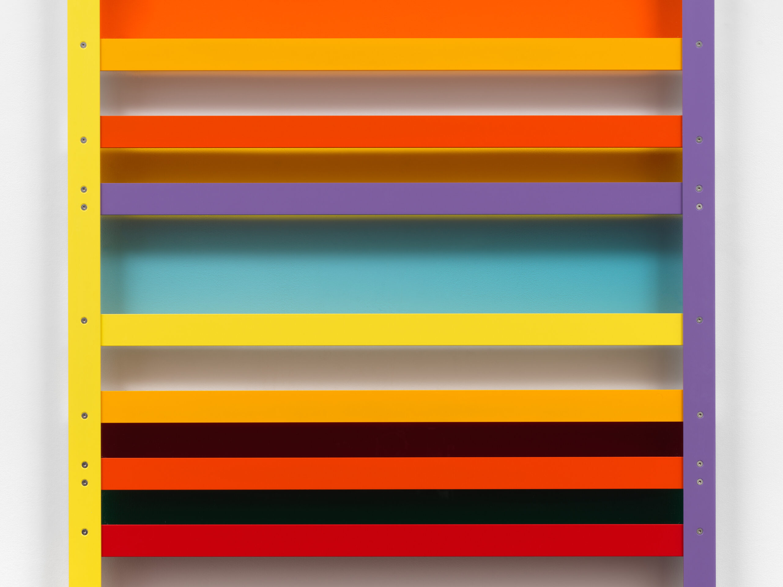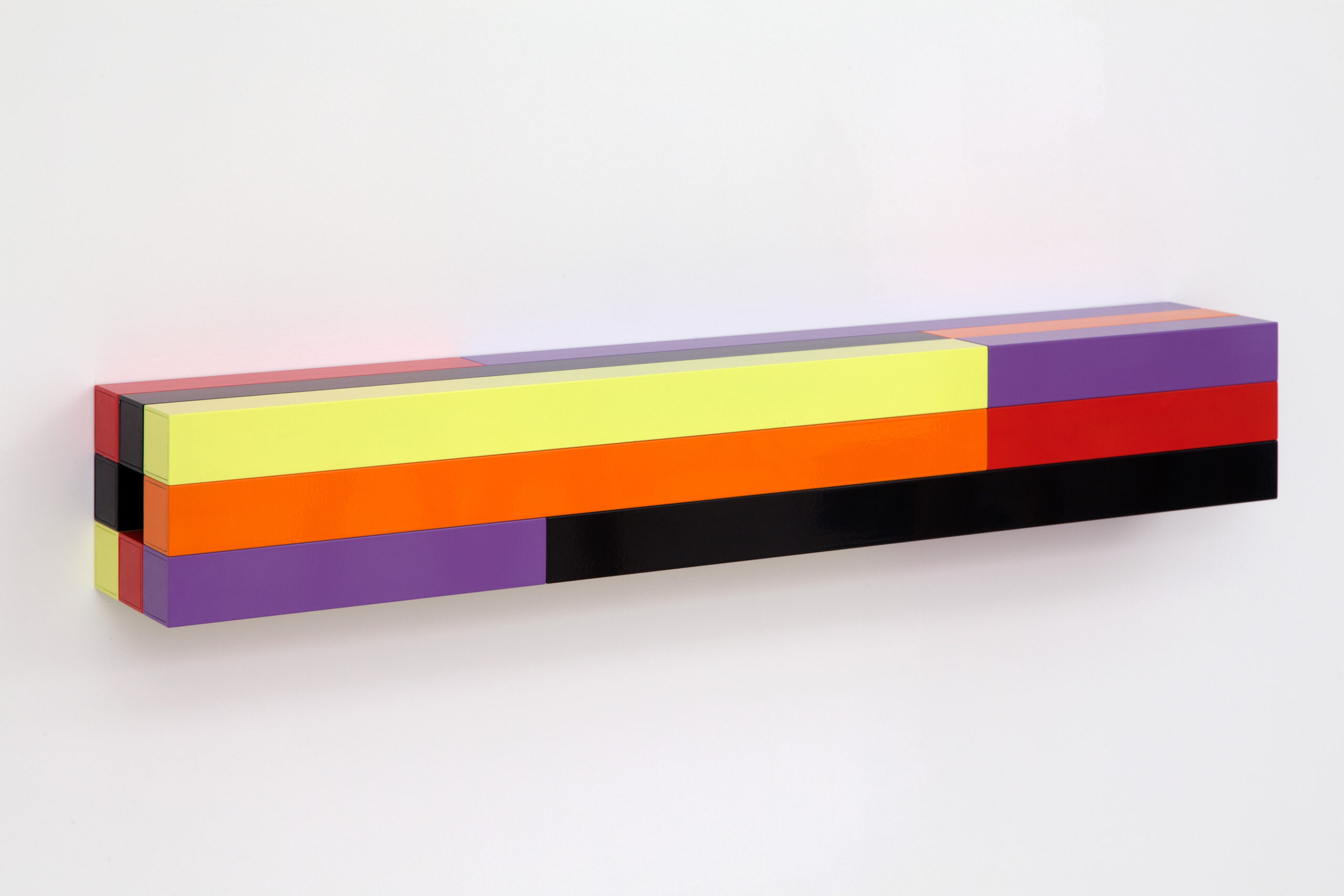 Wall-based works, termed “units,” like Hindered Development (2013), are rectangular abstractions made of joined pieces of vibrant powdered aluminum. The works conform to elements observed in contemporary spaces born from minimalism: clean lines, balanced compositions, emphasis on material, and a lack of adornment.