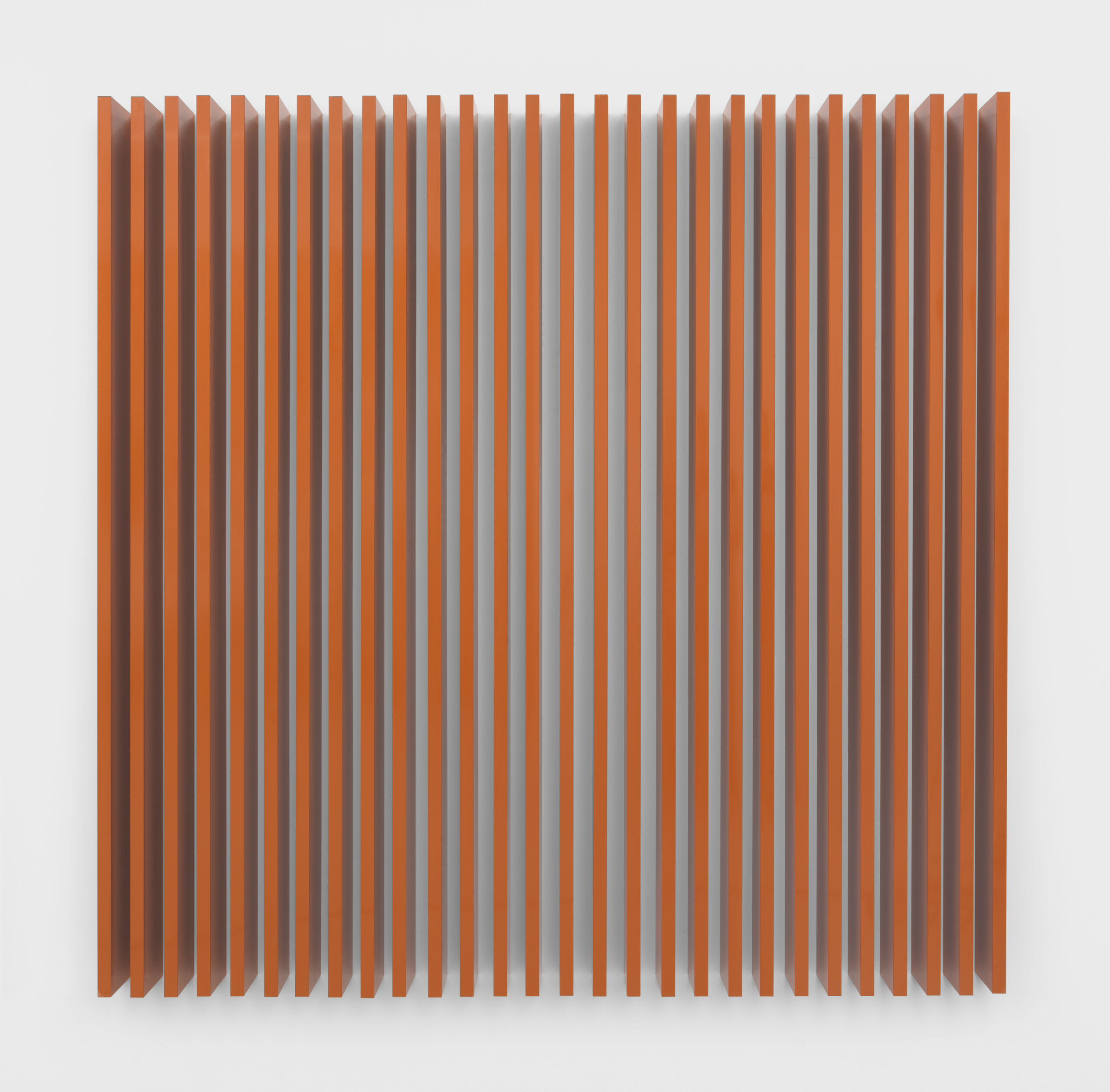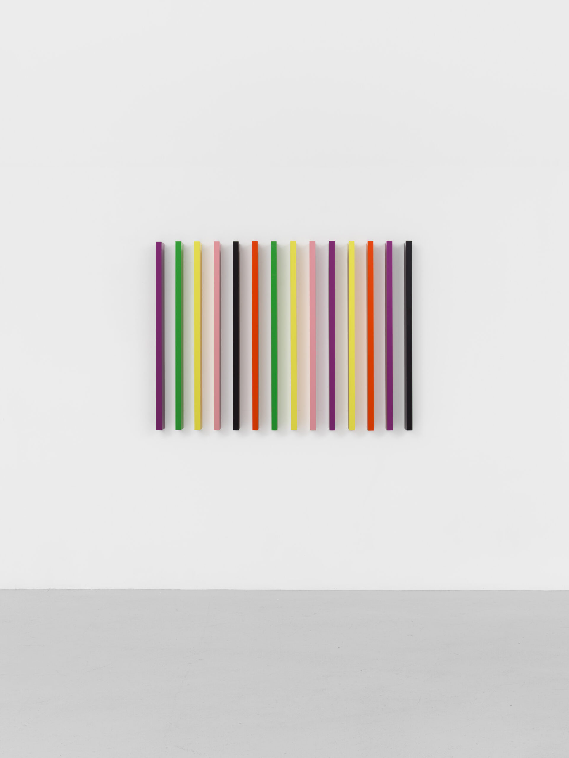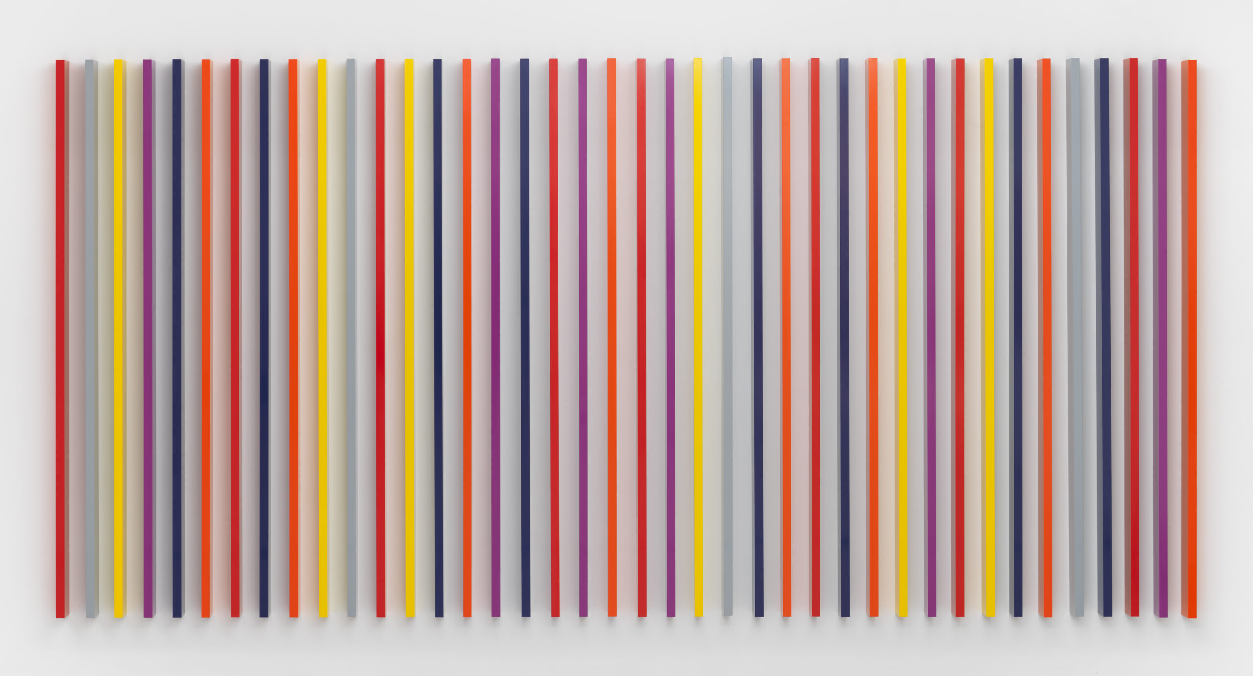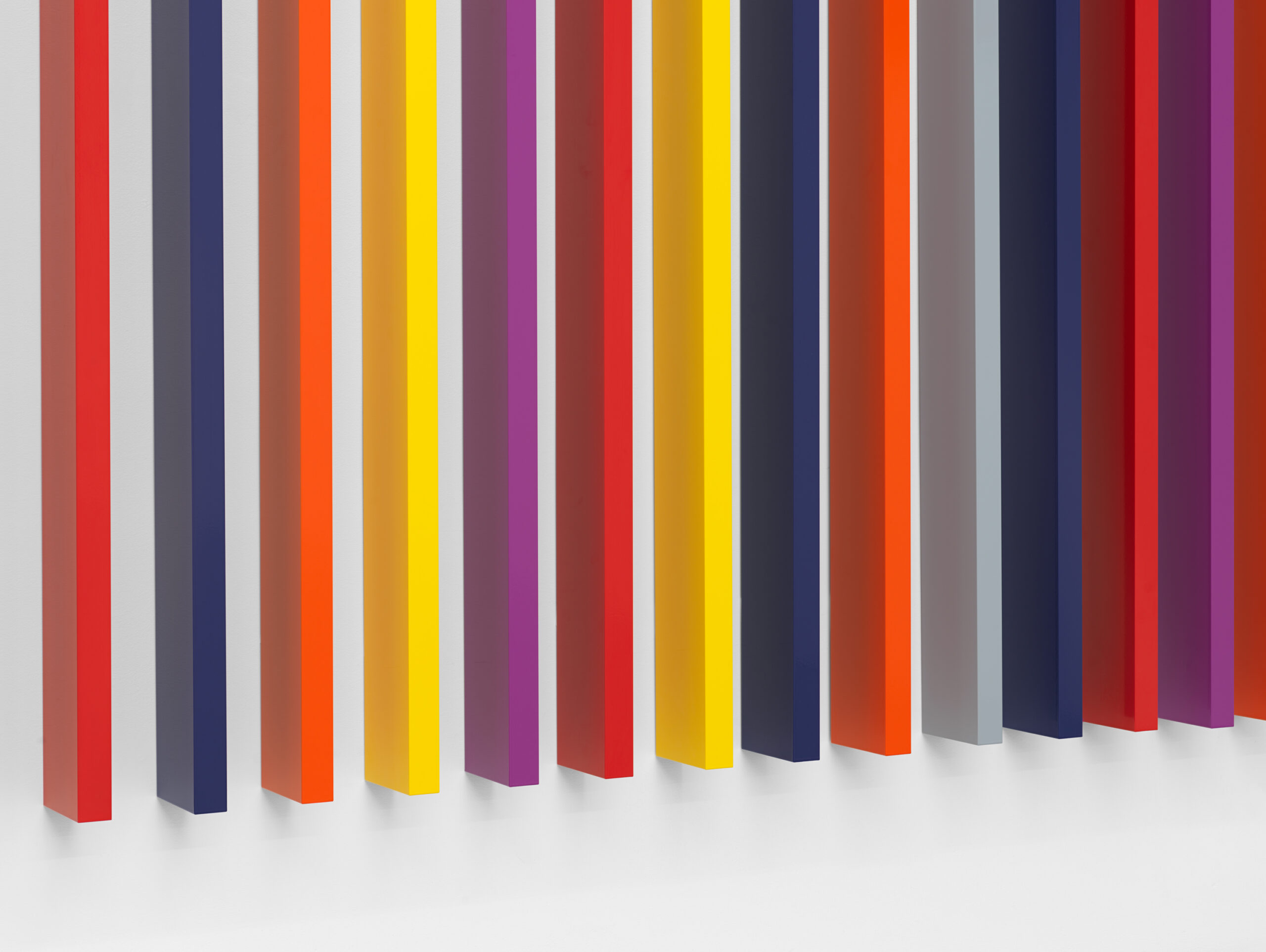 Wall-based works, termed “units,” like Hindered Development (2013), are rectangular abstractions made of joined pieces of vibrant powdered aluminum. The works conform to elements observed in contemporary spaces born from minimalism: clean lines, balanced compositions, emphasis on material, and a lack of adornment.
