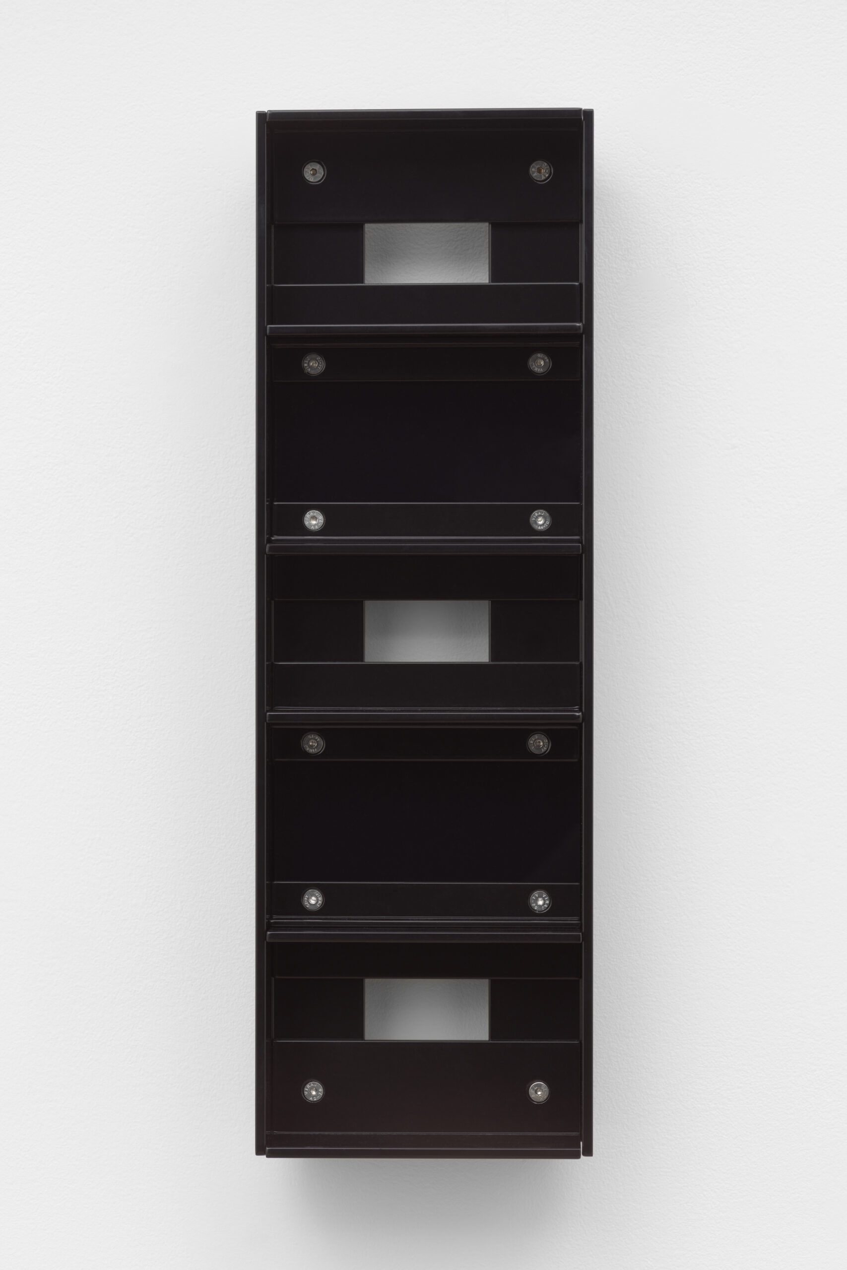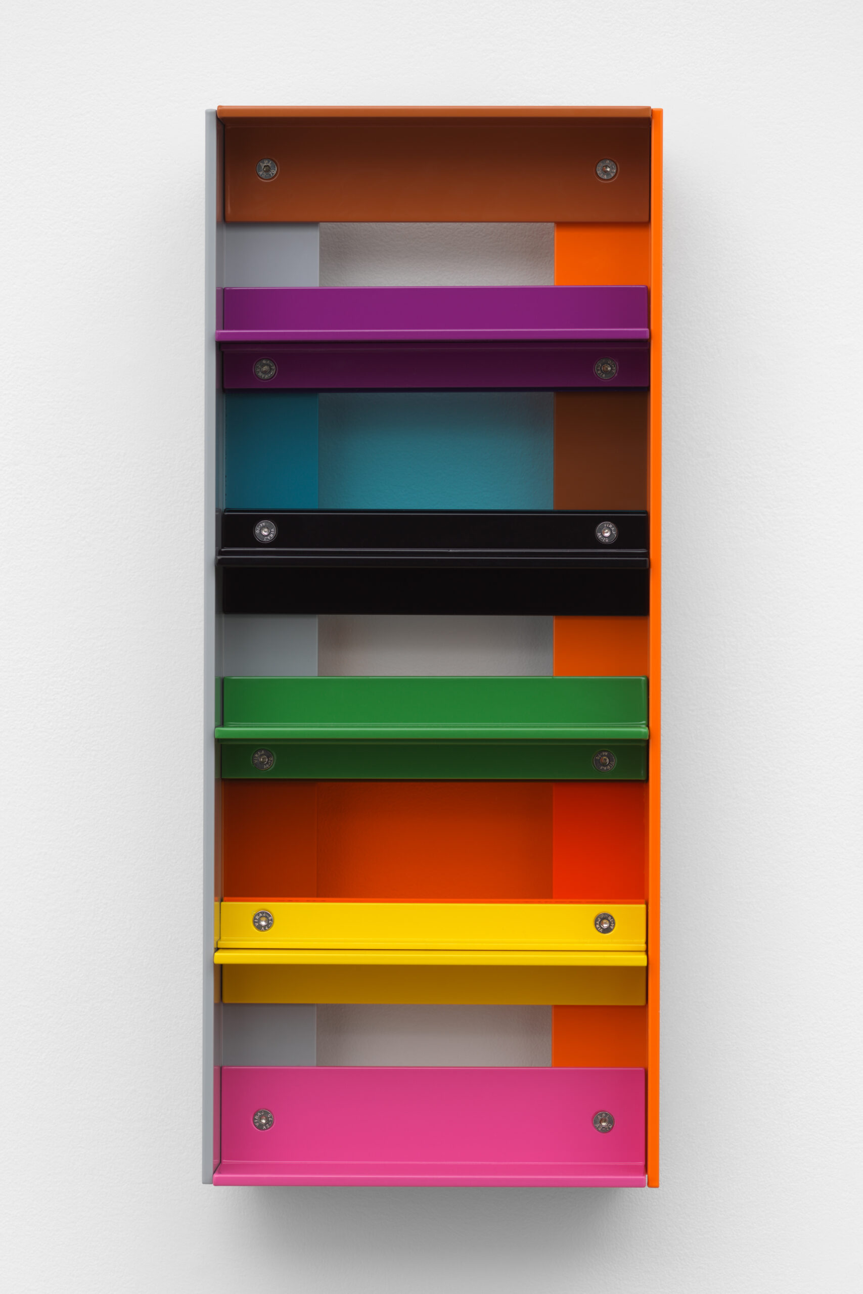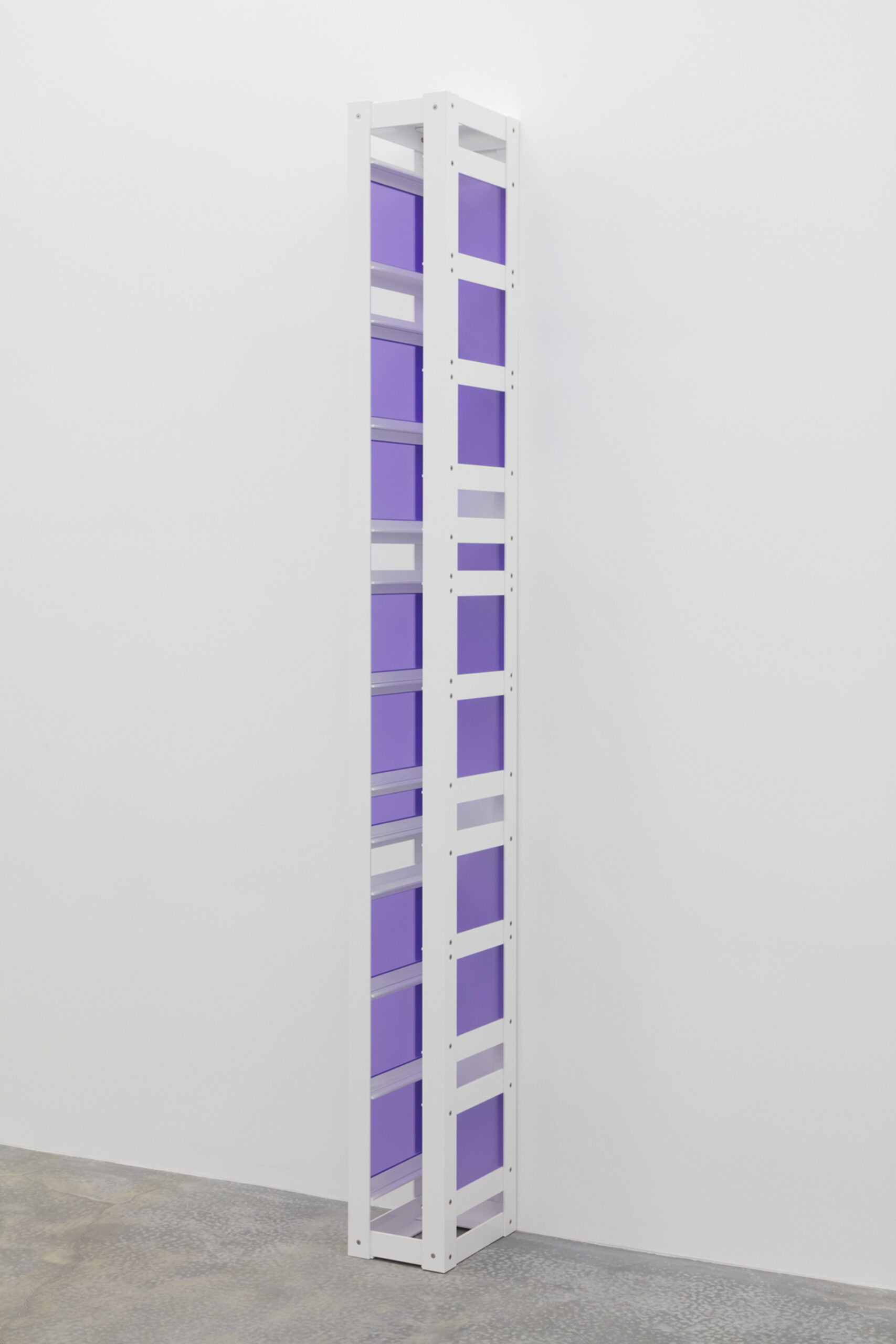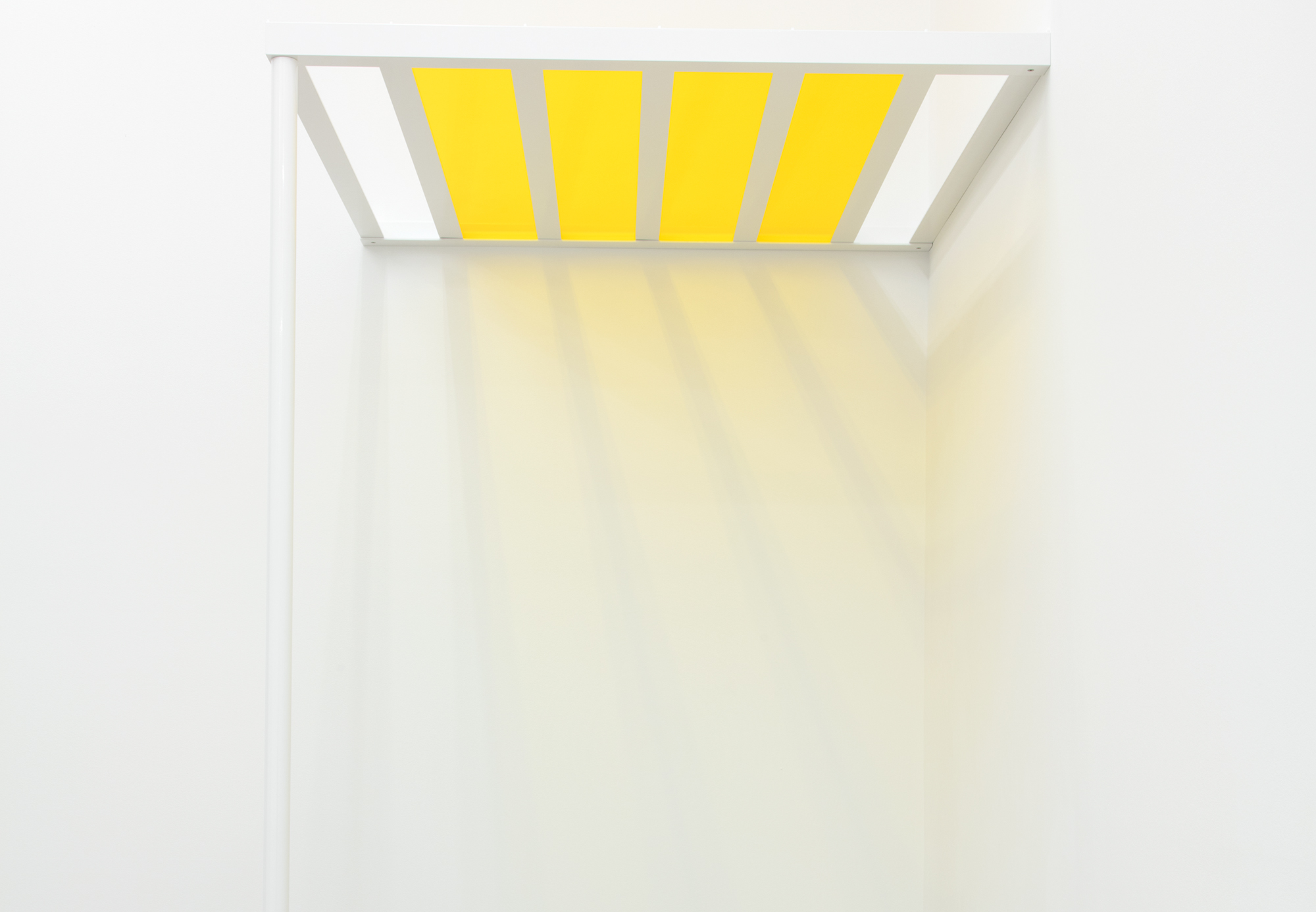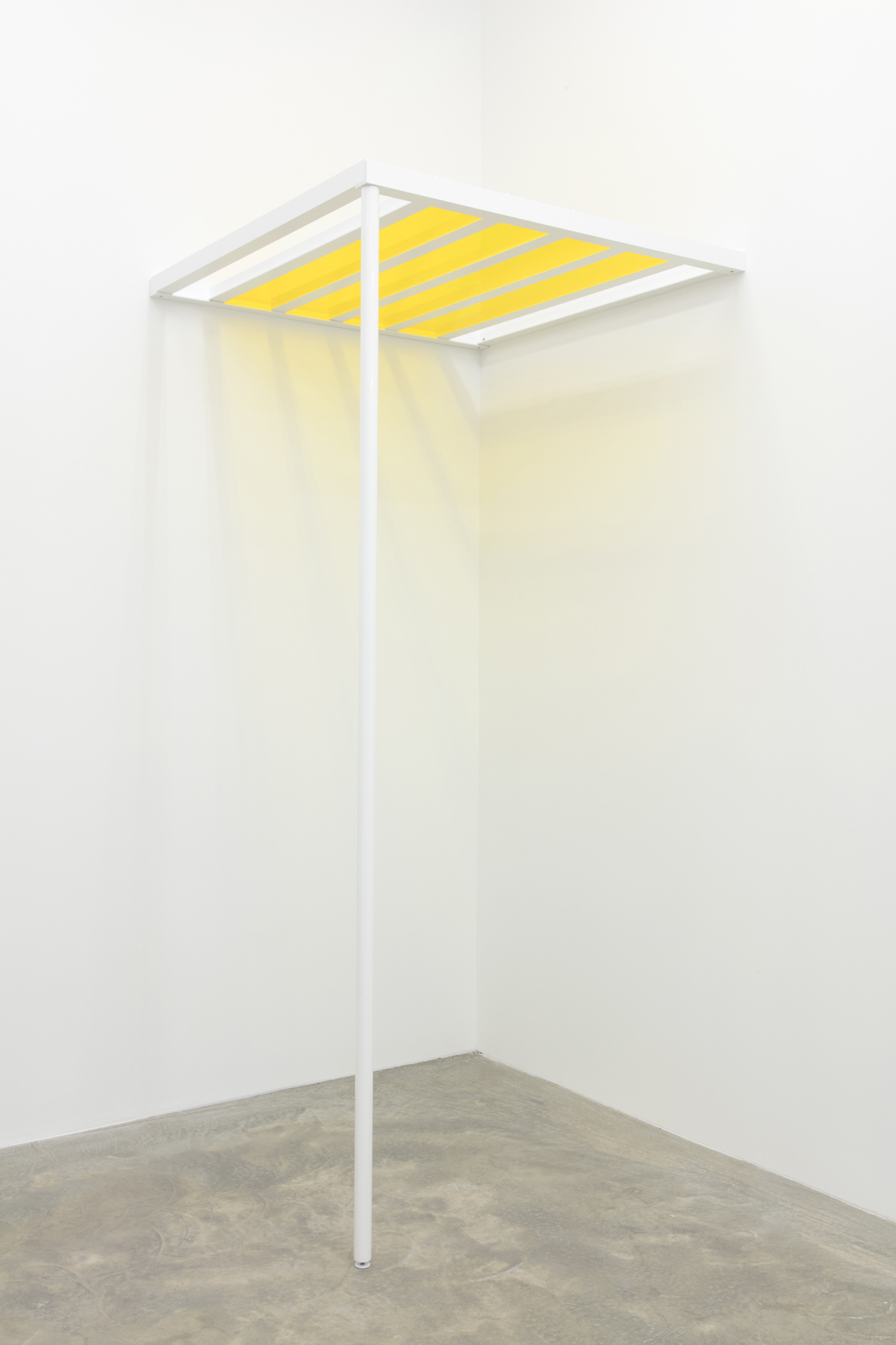 For more than three decades, Gillick has examined behaviors influenced by the built environment. The artist utilizes materials that have forged the visual identity of the constructed world, transforming them into abstractions that examine the tensions between function and aesthetics in applied minimalism and corporate design. No No Place is comprised of a suite of structures produced from Plexiglas and powder-coated aluminum; materials often used in commercial architecture. Aluminum and Plexiglas are building materials heavily associated with the 20th century. Utilized by corporations and militaries alike, they are the mediums of riot shields and McDonald’s signs. For the artist, they are loaded materials from our immediate past.
