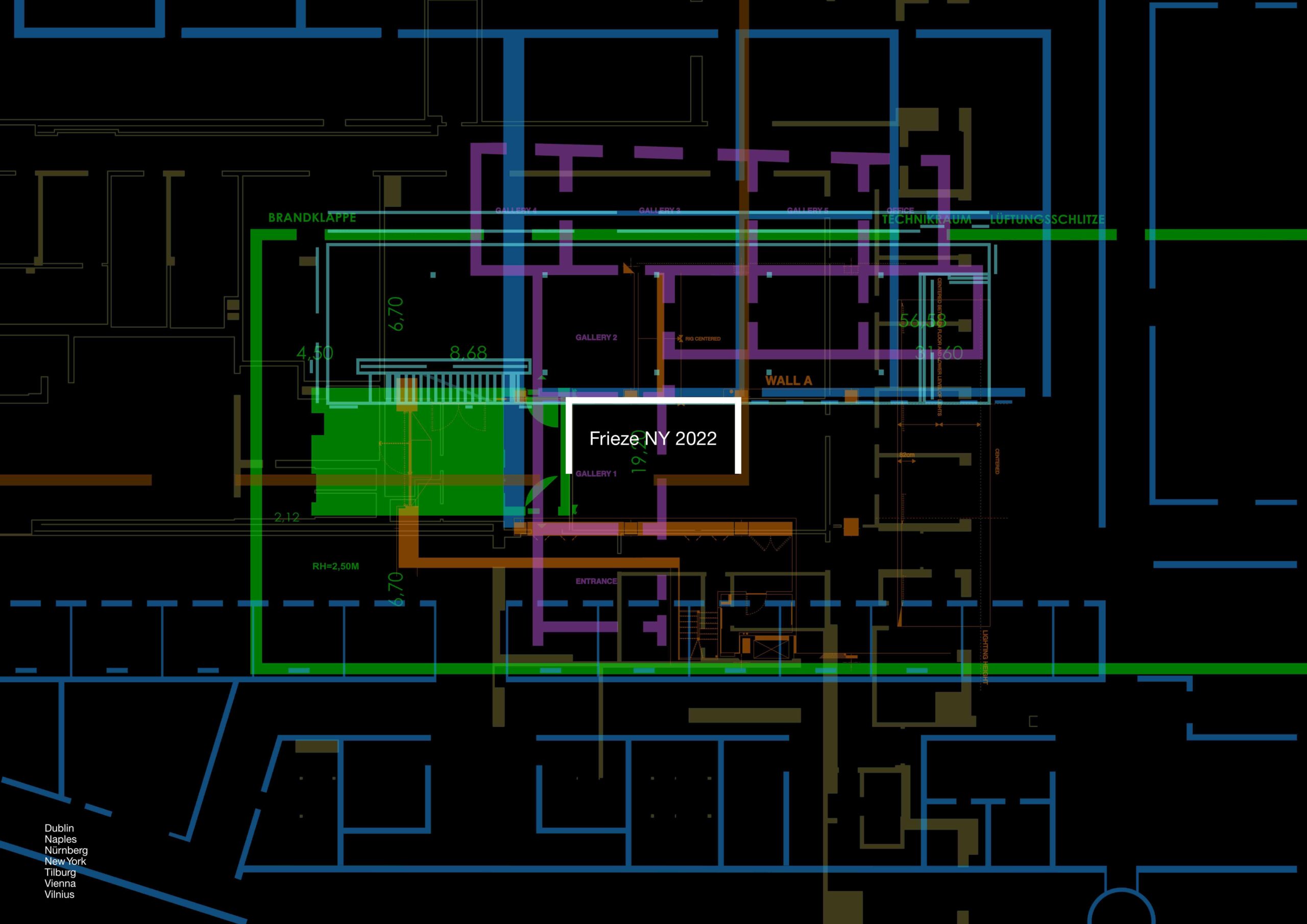 Central to the artist’s practice is an unfixed studio location, in which Gillick conceives of his sculptures in the form of computer renderings often years prior to fabrication. In this way, Gillick’s oeuvre exists in a non-place, where multiple projects are born concurrently from an overlapping collection of concepts—like simultaneously running program windows on a computer screen. For Frieze New York 2022, Gillick has escalated this larger ethos of his practice by aggregating works from contexts spanning more than a decade into a single experience, invoking new parallel realities of coexistence. At the presentation’s core is a collapse of time and location, exemplified by a diagram of bisecting floorplans, either of accomplished or merely conceptualized exhibitions, that houses new work digitally, within.