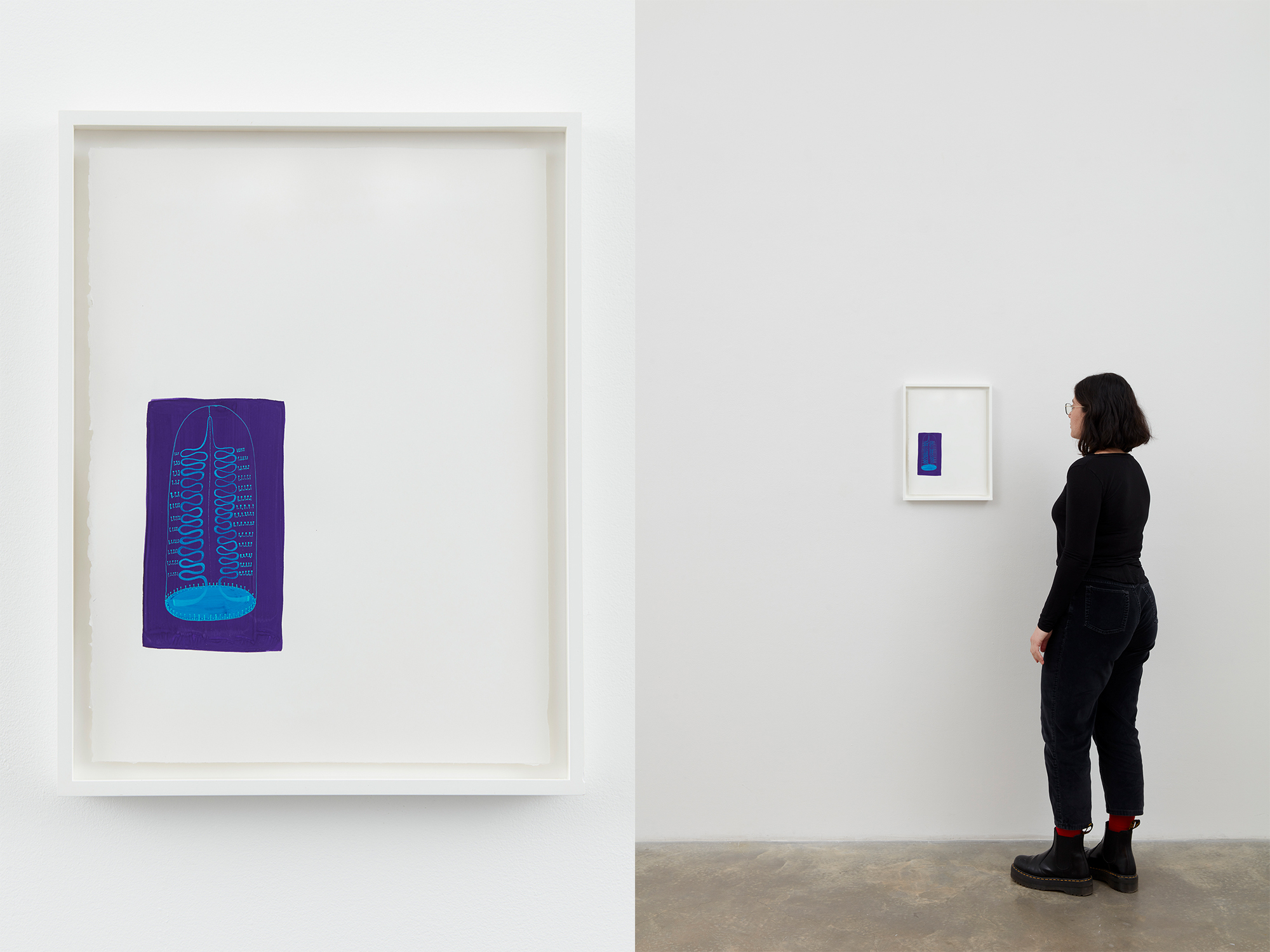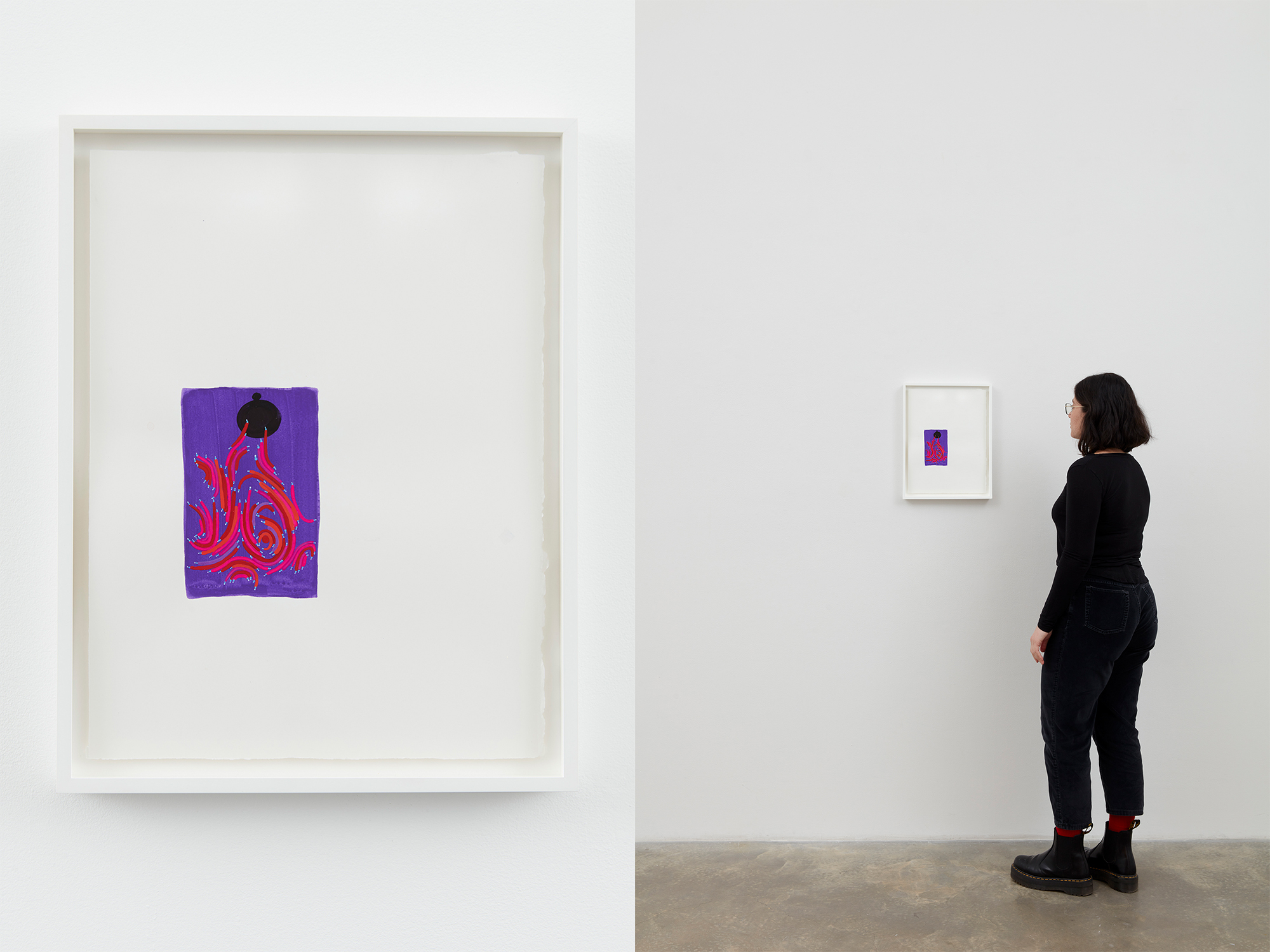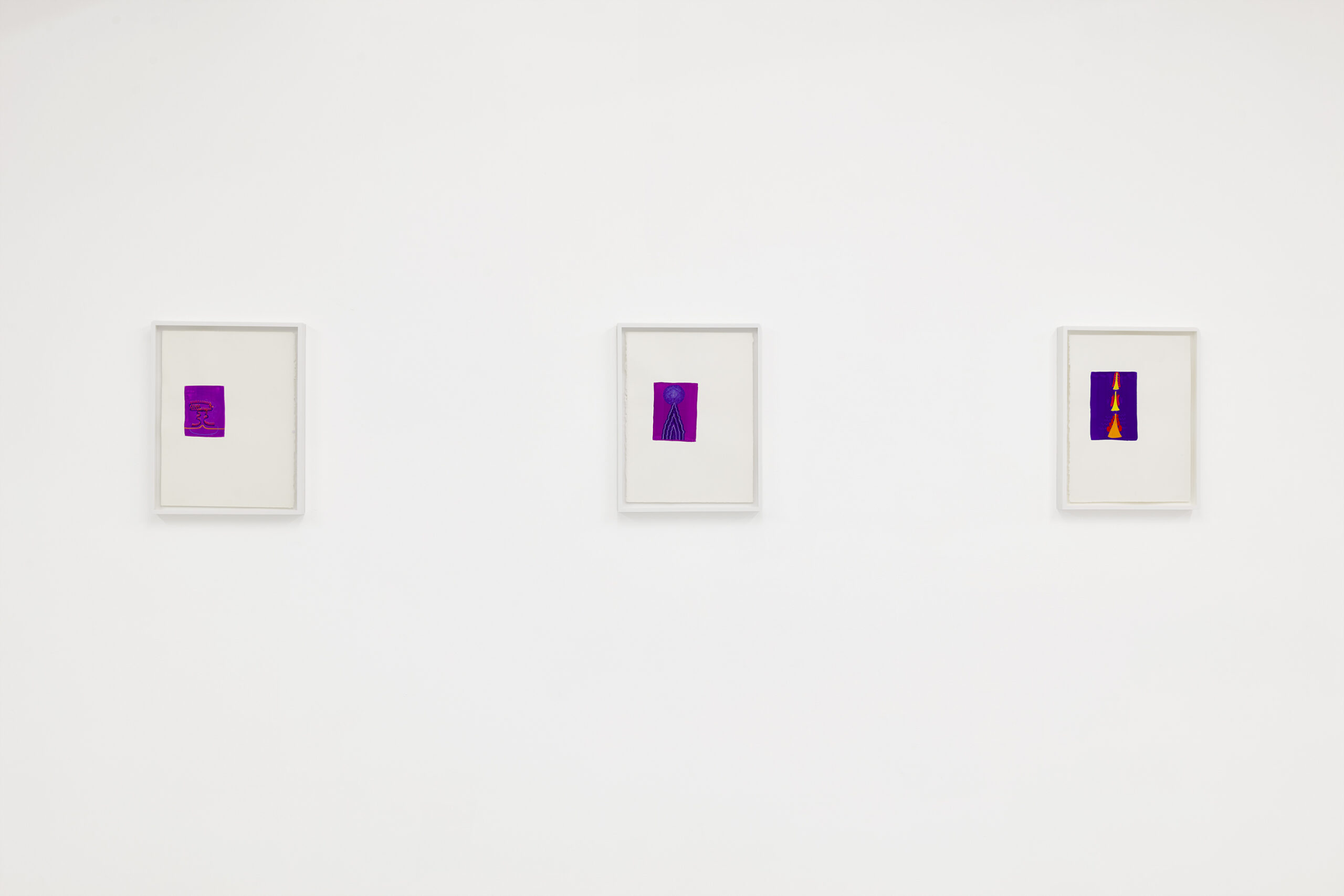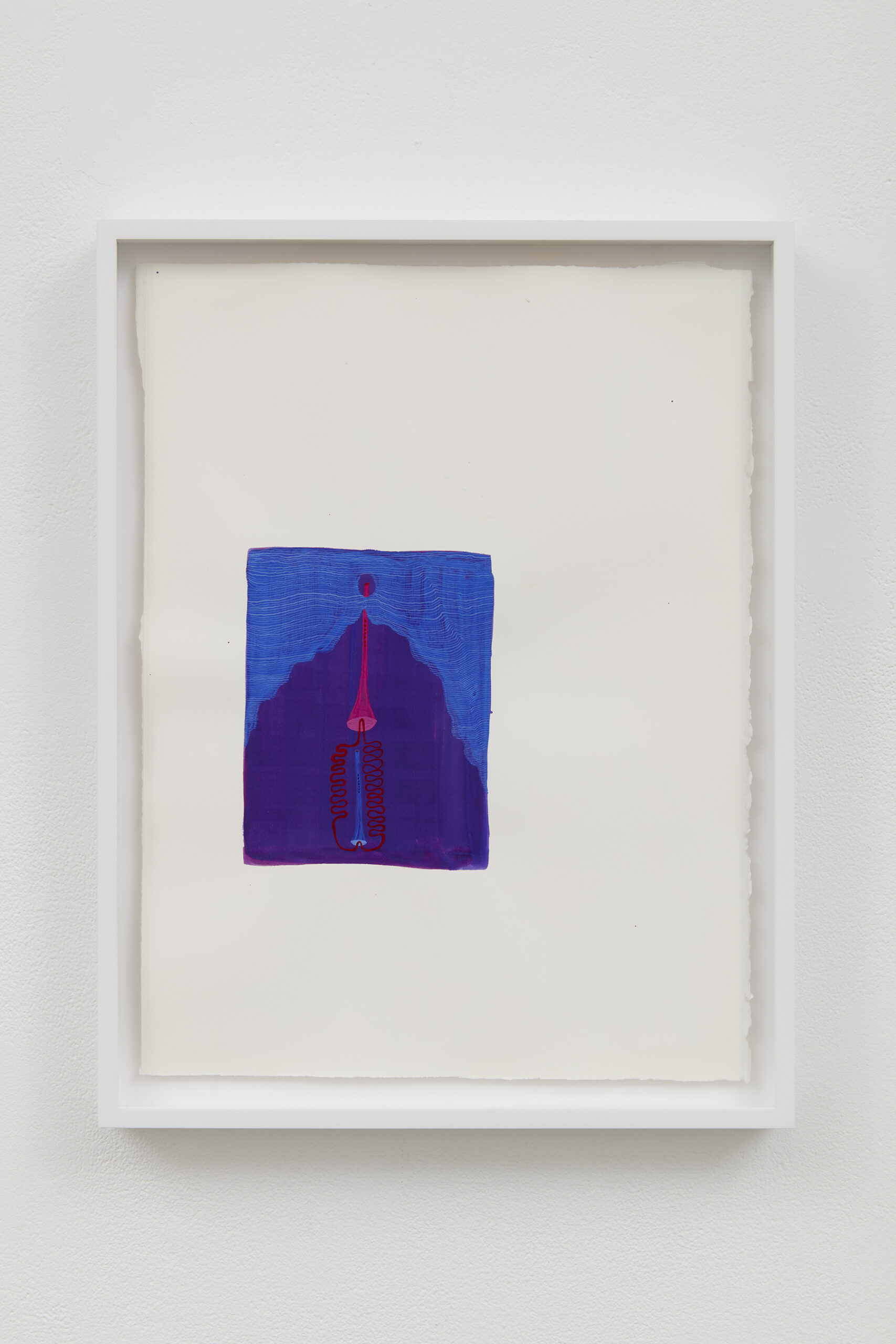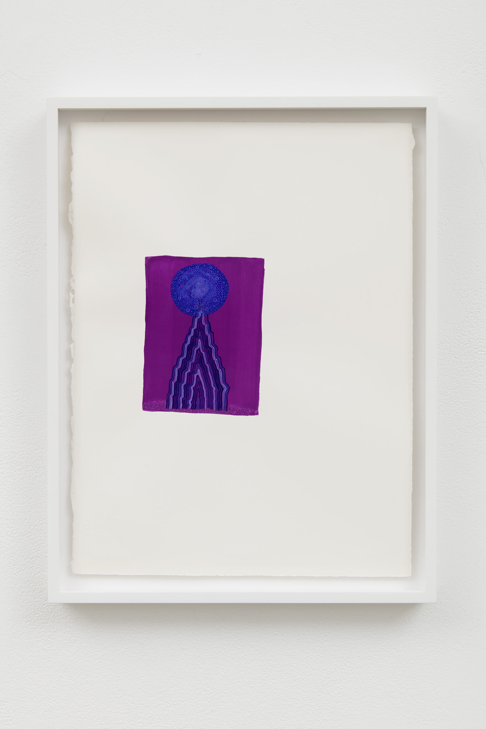 The gouaches on view stem from a suite of one hundred works produced over the course of one hundred sittings in 2014. Working from what he calls “muscle memory,” Ronay painted a series of compact, vibrant compositions in luminous shades of pink and purple. Amorphous forms and weighted curvatures recall the anatomy of a respiratory system and visually inscribe the breathing exercises that ground his daily meditations. Line and form emerge from ritual and repetition, recalling the automatic drawings that are the genesis of Ronay’s sculptural abstractions. Atypical within his practice, the forms within this presentation are bound to paper and were never translated into sculpture. Instead, they remain a uniquely diaristic sampling of the artist’s meditation sessions, which continue to frame his mornings a decade later.