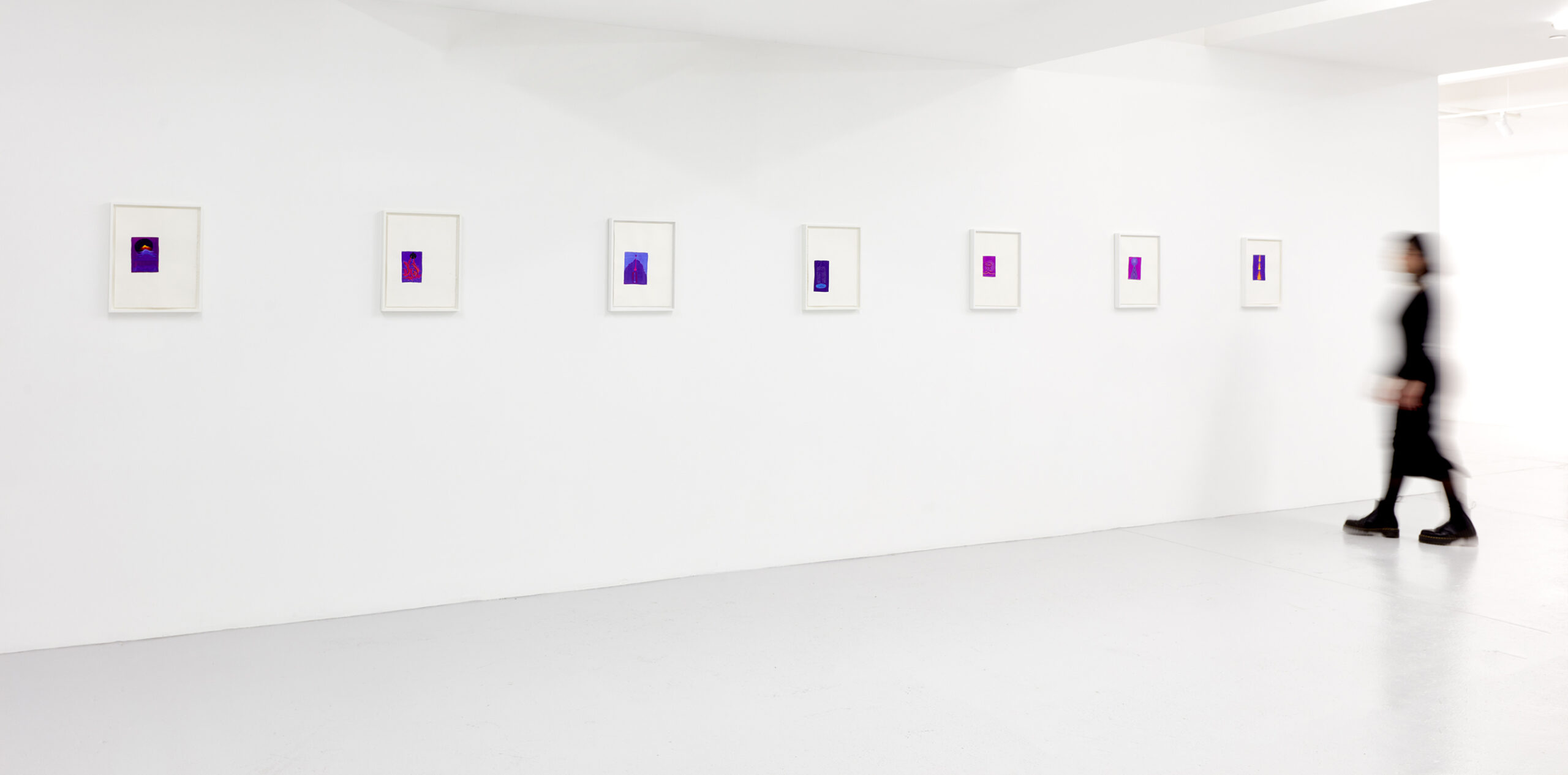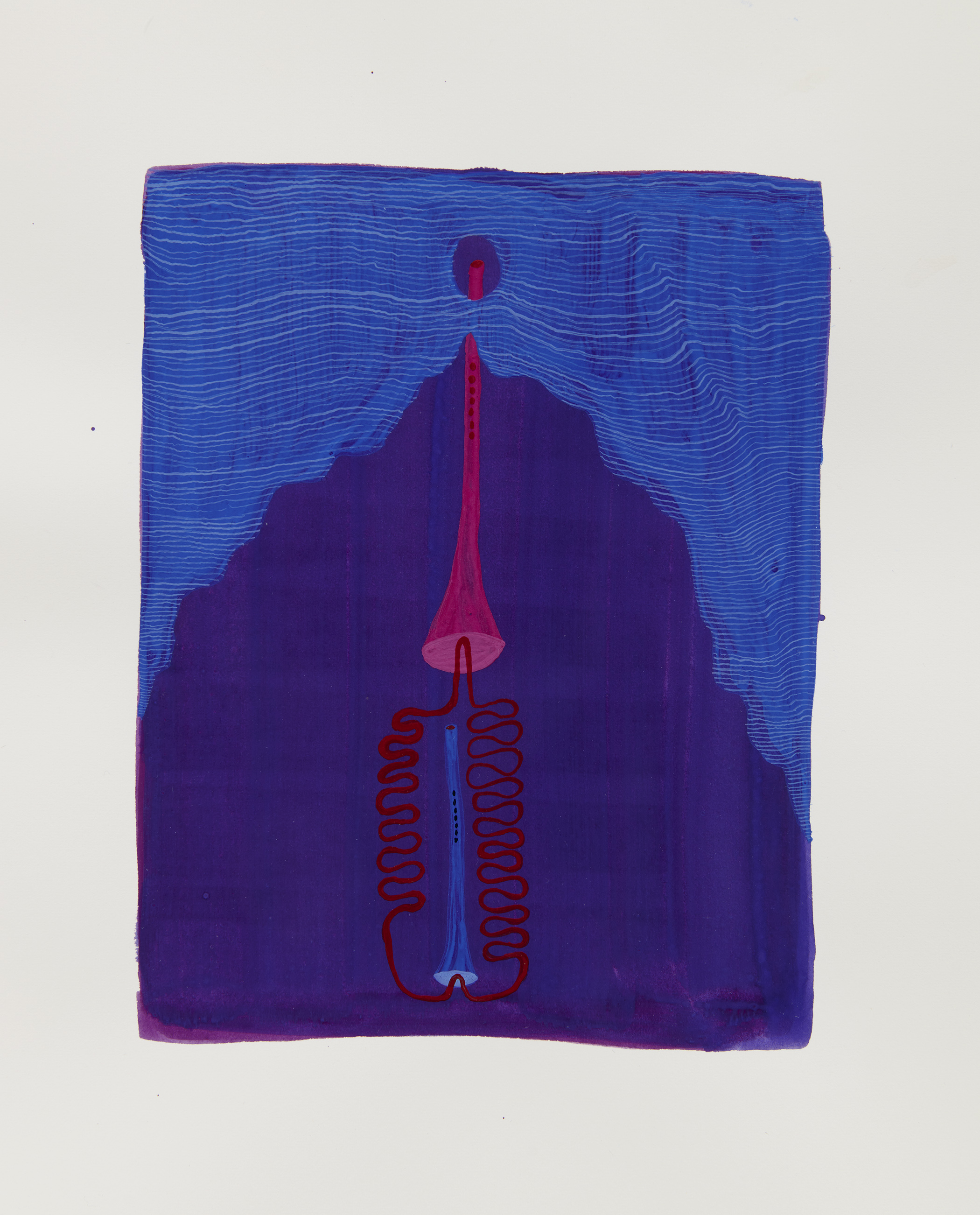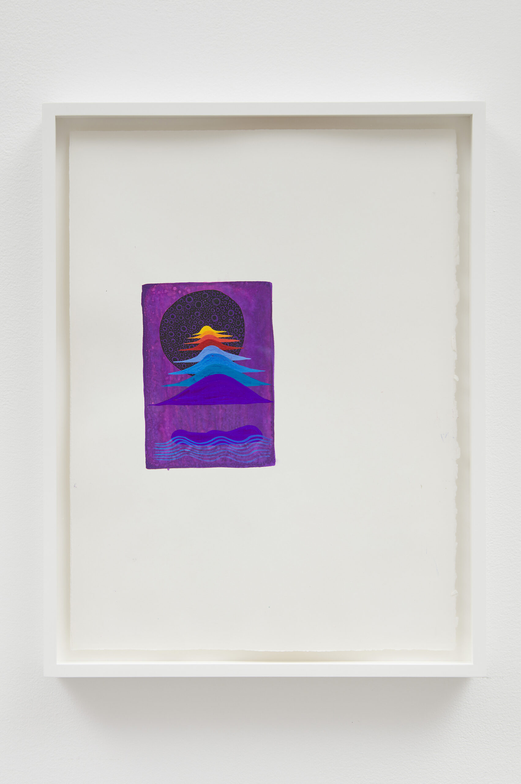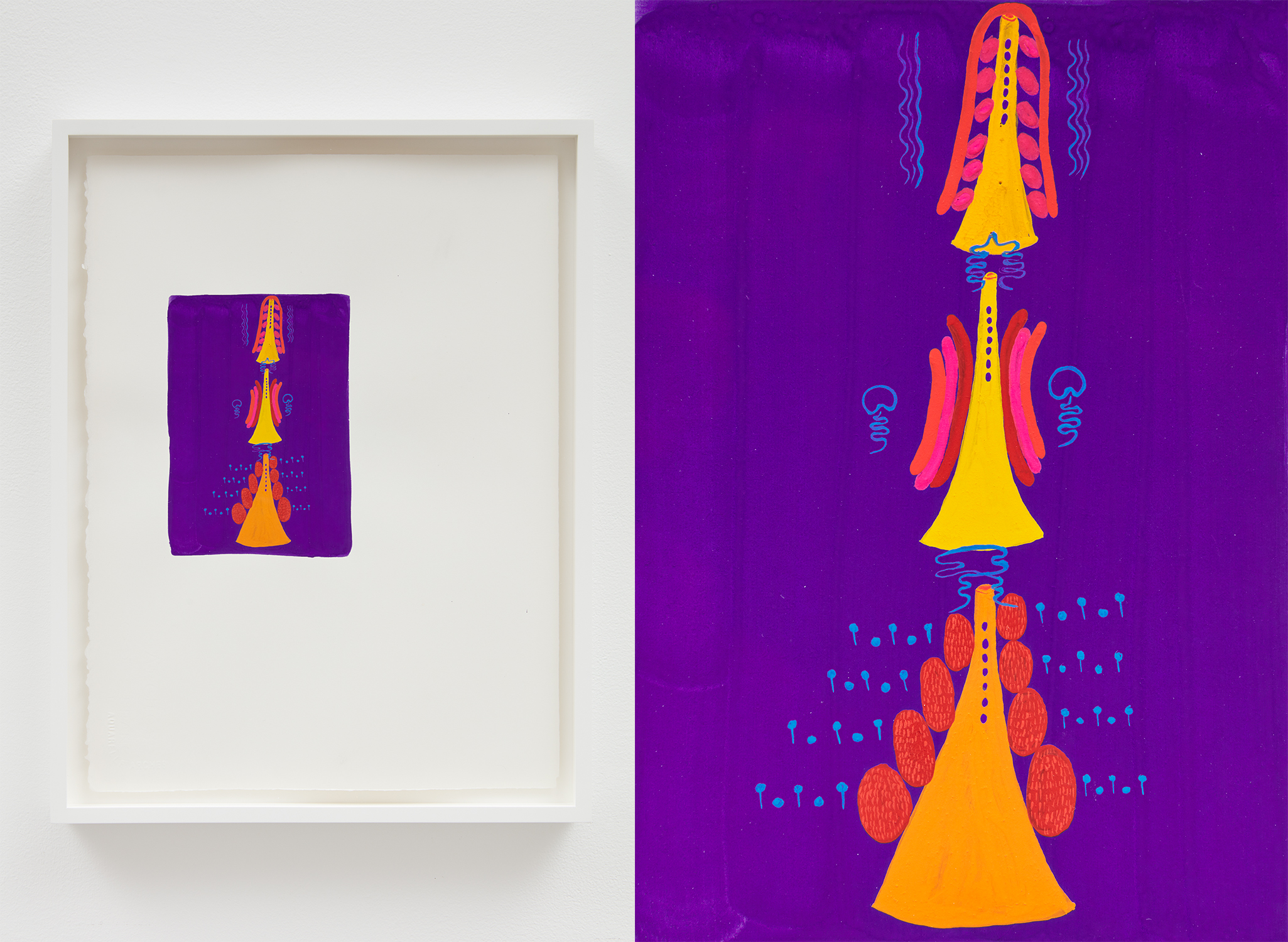 The gouaches on view stem from a suite of one hundred works produced over the course of one hundred sittings in 2014. Working from what he calls “muscle memory,” Ronay painted a series of compact, vibrant compositions in luminous shades of pink and purple. Amorphous forms and weighted curvatures recall the anatomy of a respiratory system and visually inscribe the breathing exercises that ground his daily meditations. Line and form emerge from ritual and repetition, recalling the automatic drawings that are the genesis of Ronay’s sculptural abstractions. Atypical within his practice, the forms within this presentation are bound to paper and were never translated into sculpture. Instead, they remain a uniquely diaristic sampling of the artist’s meditation sessions, which continue to frame his mornings a decade later.