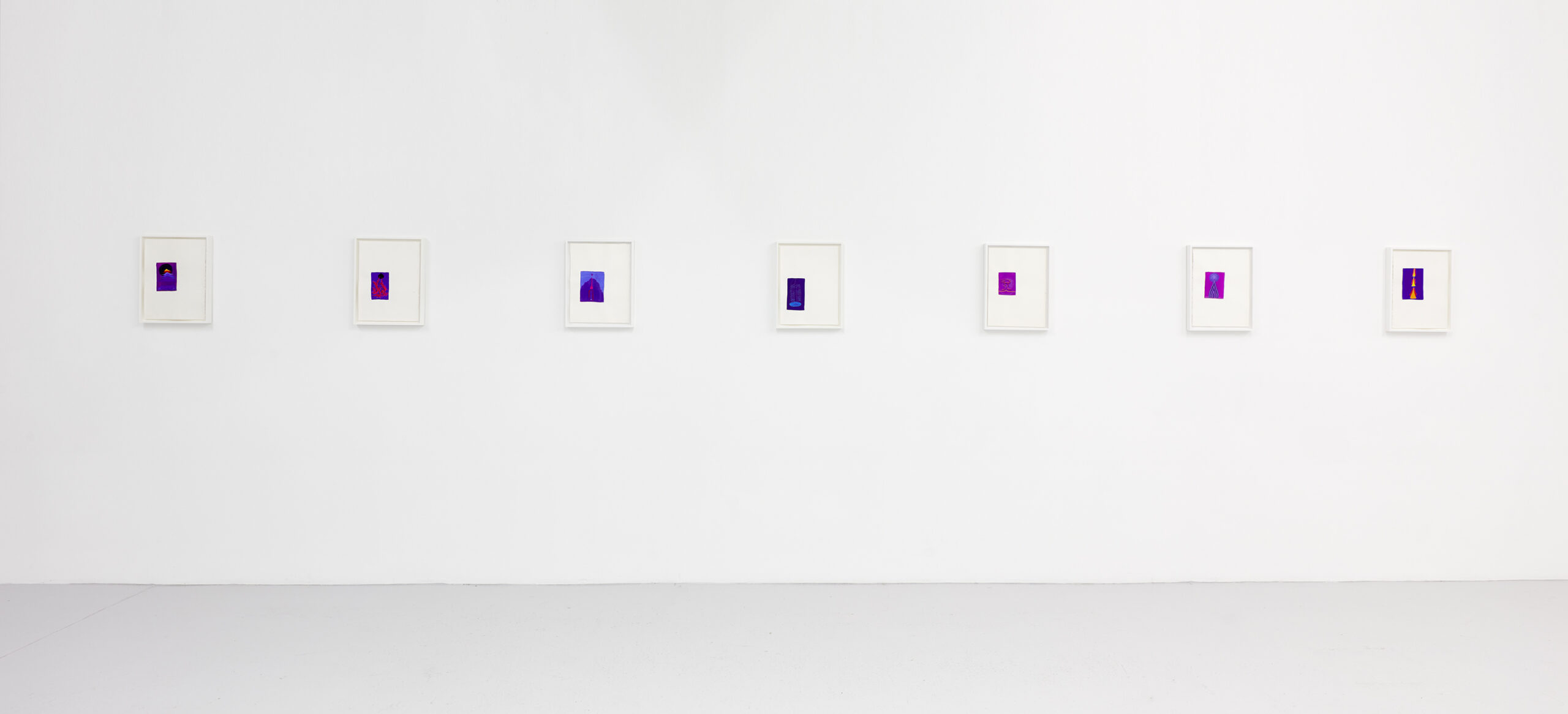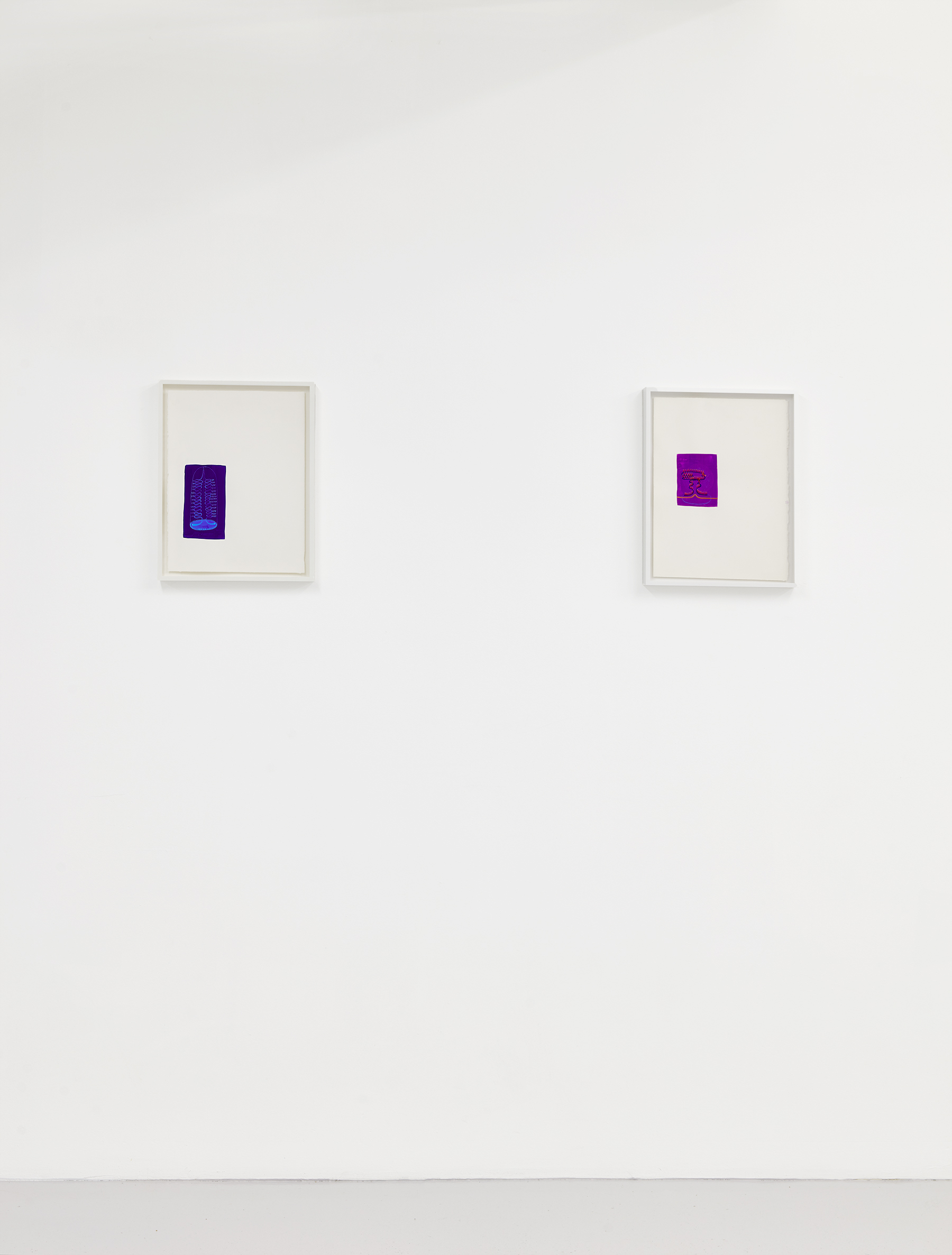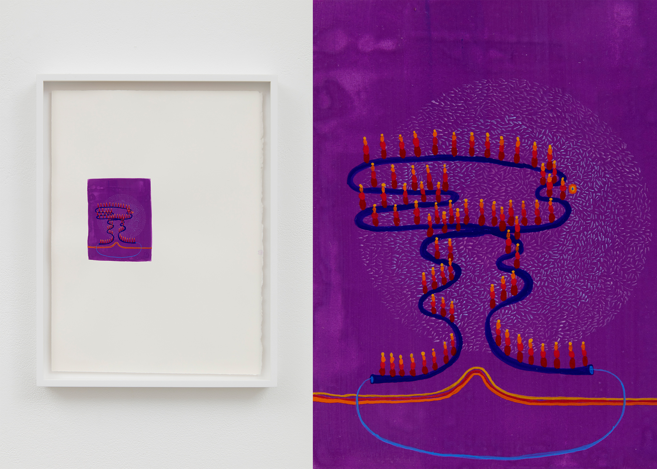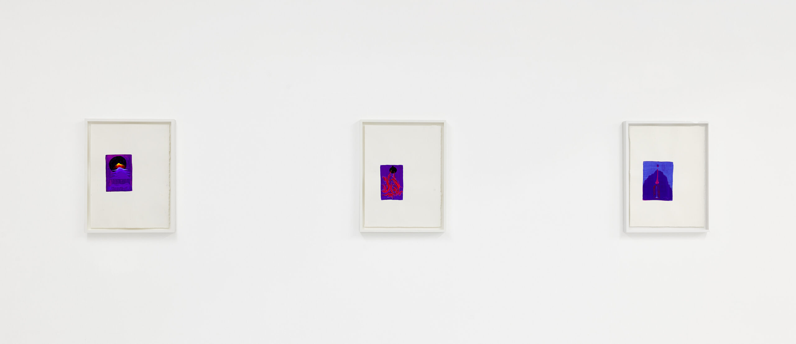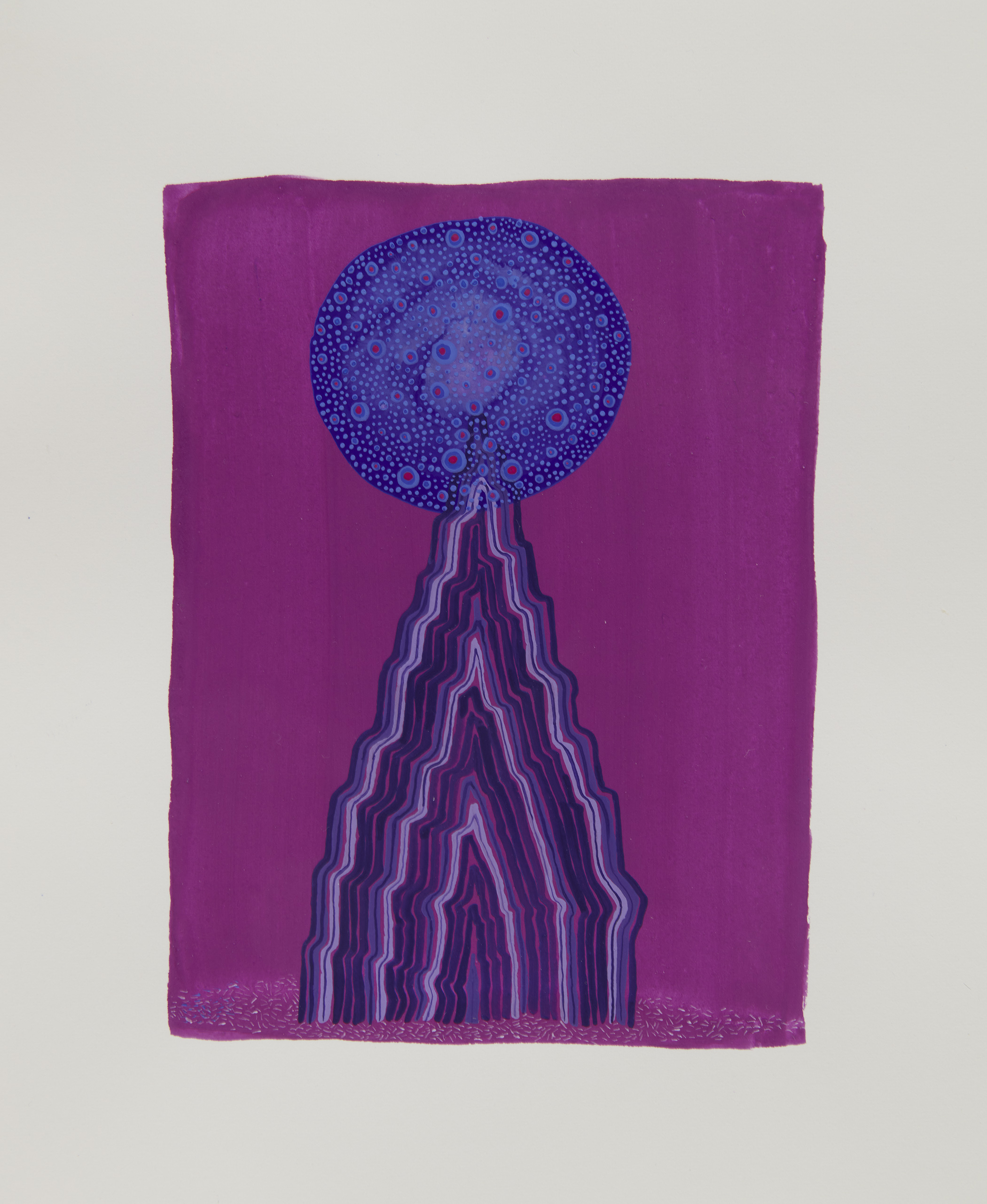 The gouaches on view stem from a suite of one hundred works produced over the course of one hundred sittings in 2014. Working from what he calls “muscle memory,” Ronay painted a series of compact, vibrant compositions in luminous shades of pink and purple. Amorphous forms and weighted curvatures recall the anatomy of a respiratory system and visually inscribe the breathing exercises that ground his daily meditations. Line and form emerge from ritual and repetition, recalling the automatic drawings that are the genesis of Ronay’s sculptural abstractions. Atypical within his practice, the forms within this presentation are bound to paper and were never translated into sculpture. Instead, they remain a uniquely diaristic sampling of the artist’s meditation sessions, which continue to frame his mornings a decade later.