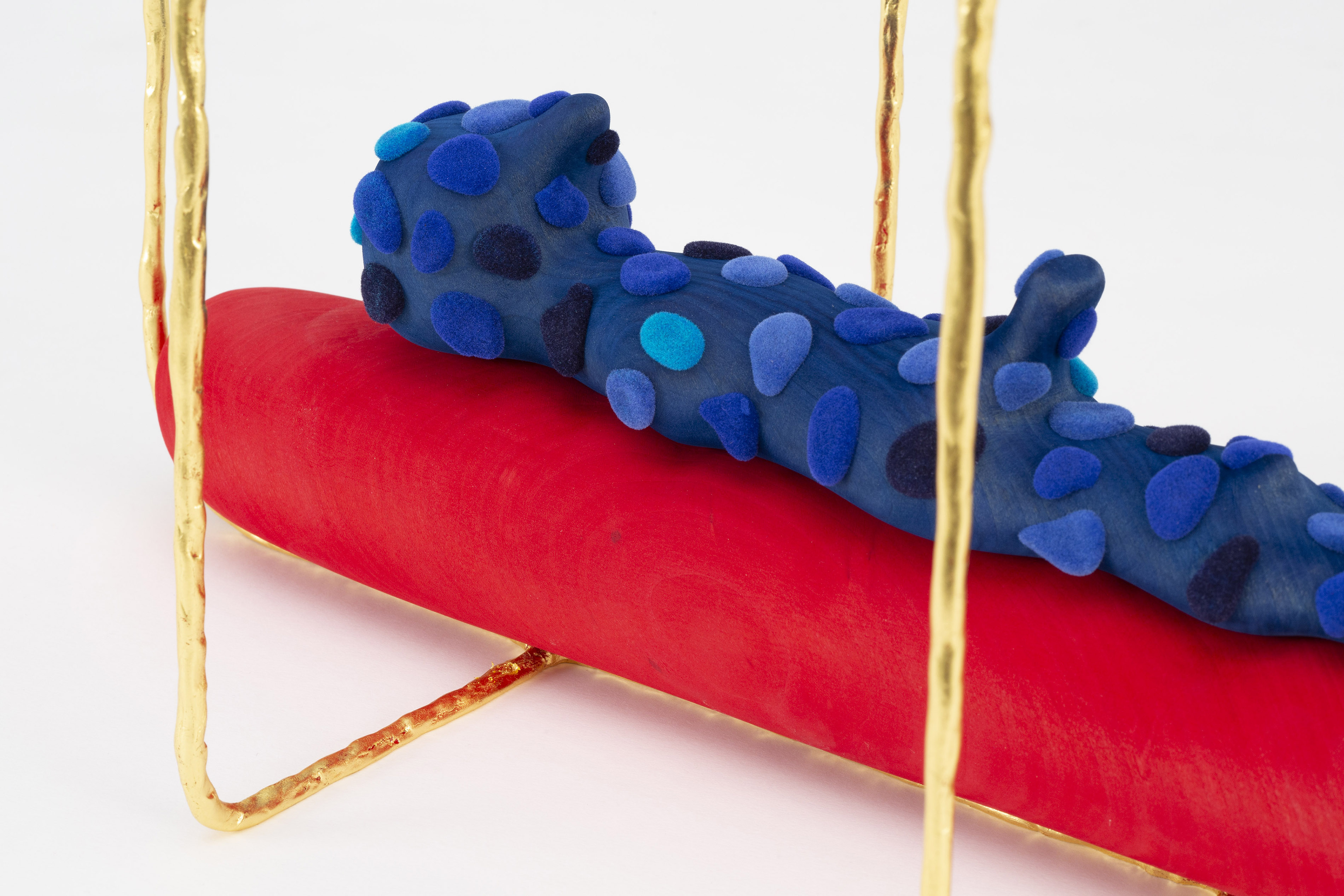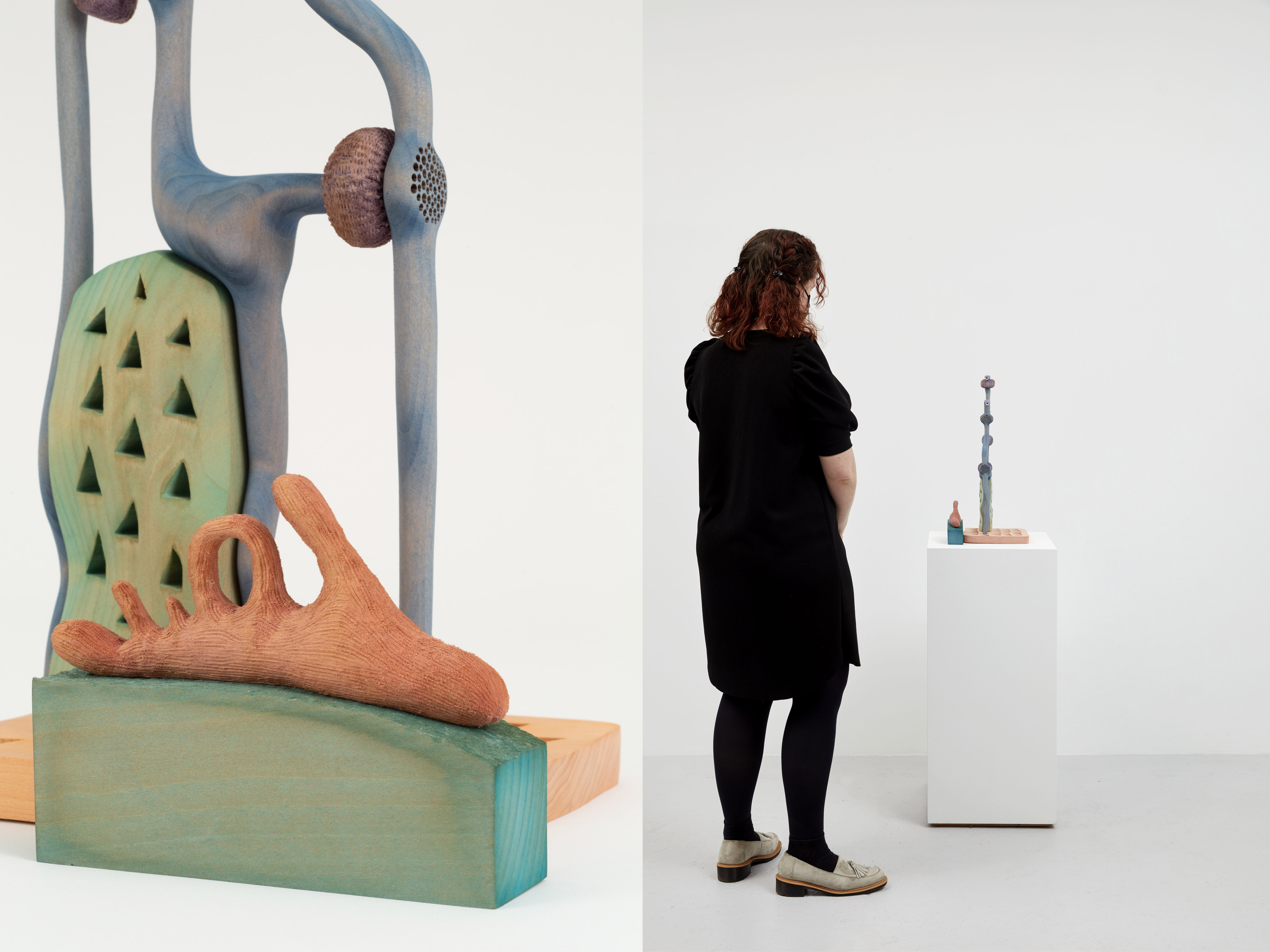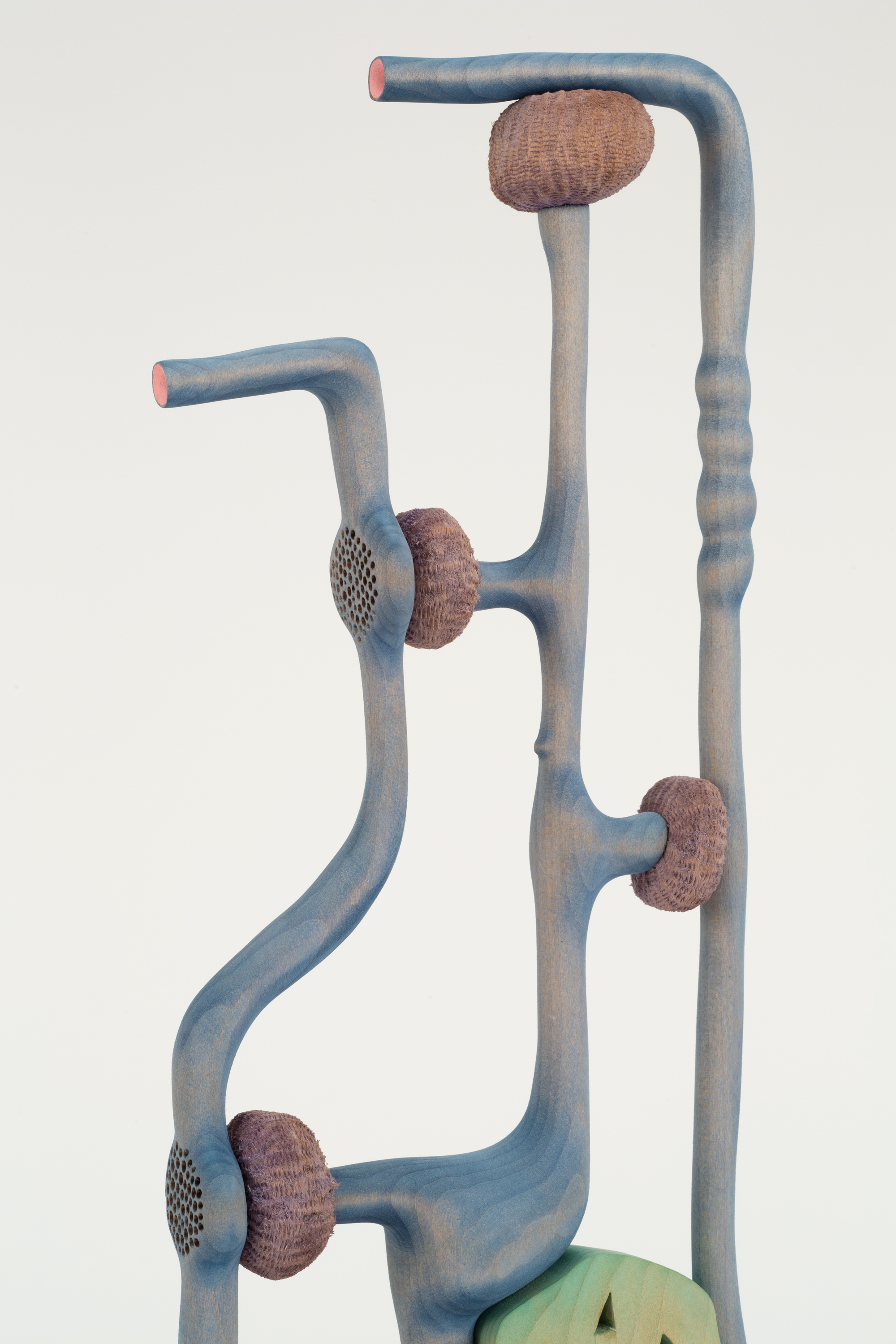 In March of 2020, Ronay turned his focus away from larger-scale sculptures and began to produce more intimately scaled artworks. This shift in focus was an intuitive response to the nationwide COVID-19 lockdowns, which had a strong effect on the ways in which Ronay thought about both making and viewing art. These new artworks require an acute attention to detail and engender a personal, one-on-one experience with the viewer. One of these works, Gemels (2020) seems to grow out of its wooden base; towering pale blue forms rise upward like coral. Looking closely next to the mauve globular inserts, the wood is porous and carved with delicate, tiny holes. Adjacent to the base, a salmon-colored form is revealed to have an almost felt-like texture, created through Ronay’s laborious whittling of the wood.