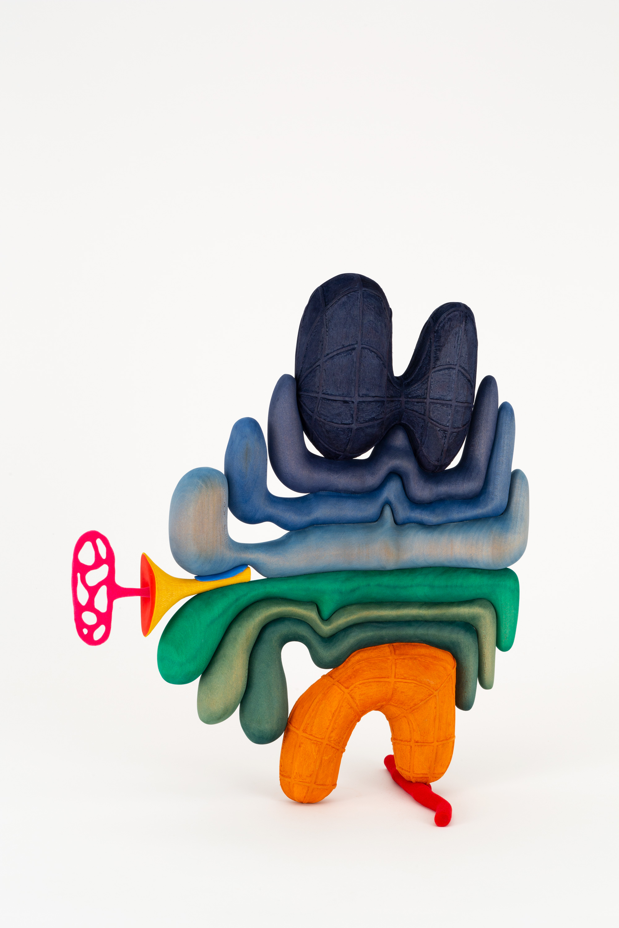 Ronay draws from a myriad of visual references, from modernism and American folk art to fields of biology, ecology, and cybernetics. The most recent work in the presentation, Inner, Outer, Hydro, Tropo, Expo (2021) is comprised of vibrantly colored, undulating forms which seem to radiate in layers from a horizontal axis. A bright pink porous oval extrudes from a yellow, trumpet-shaped addendum, playing with the sculpture’s interior and exterior boundaries.