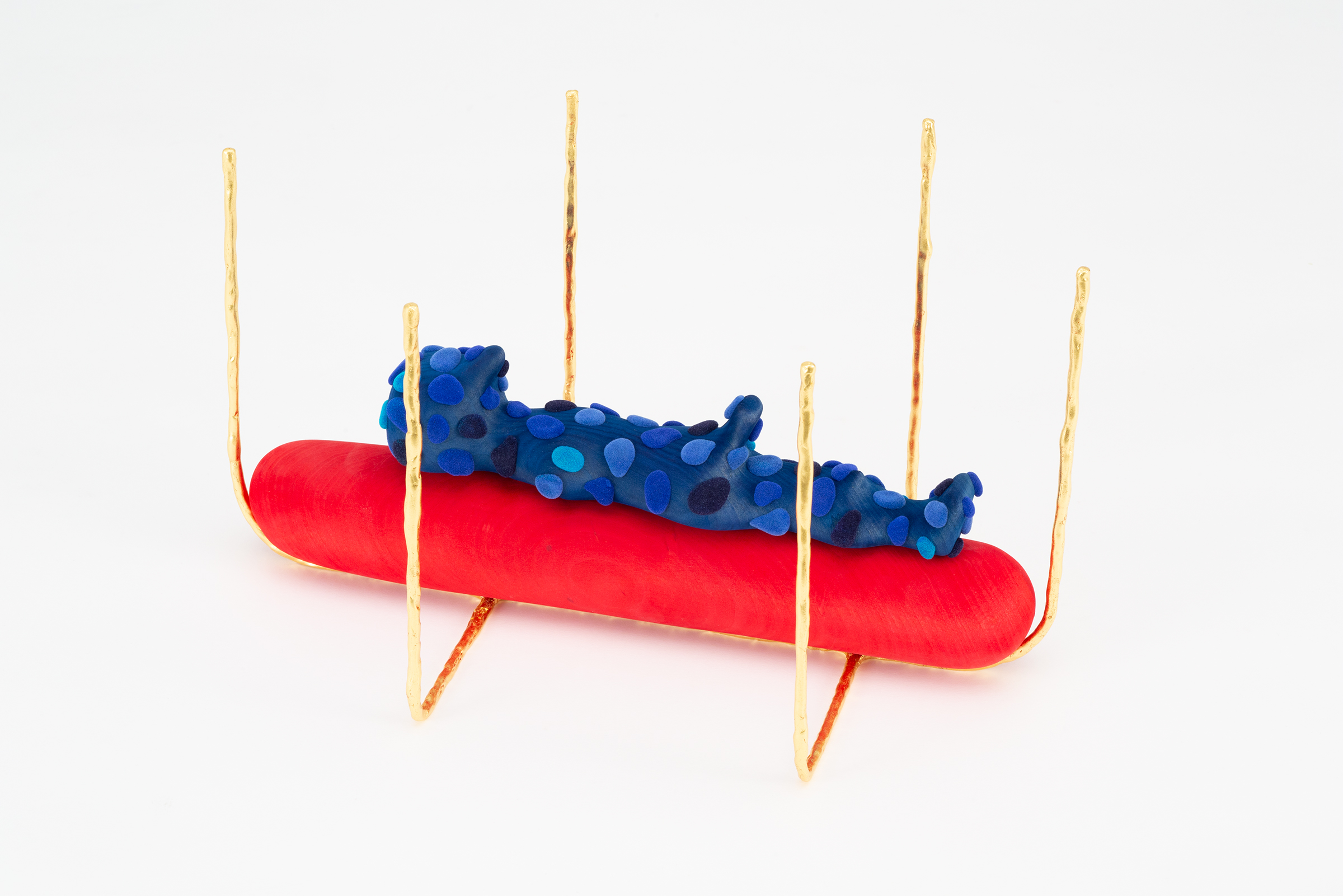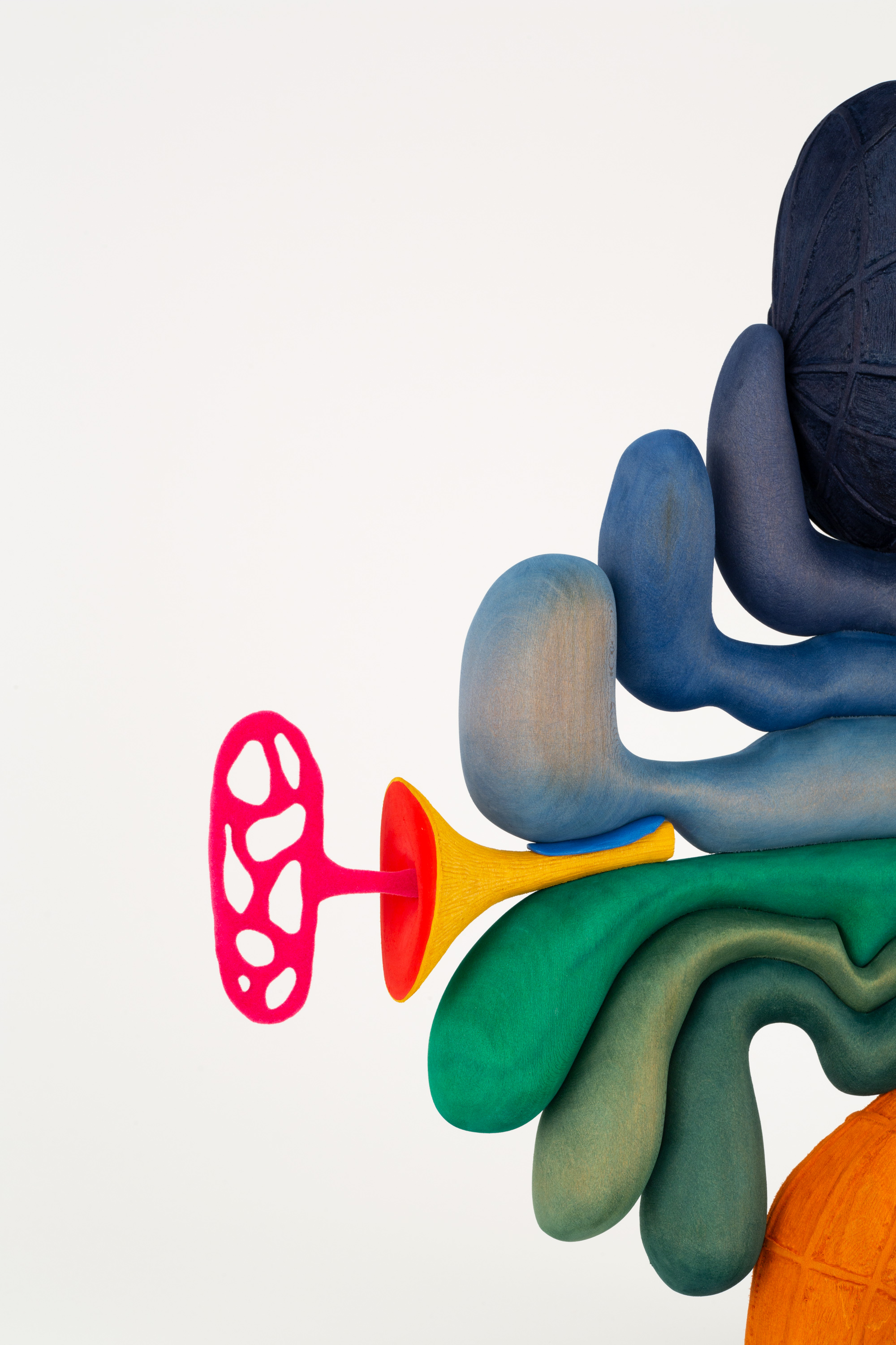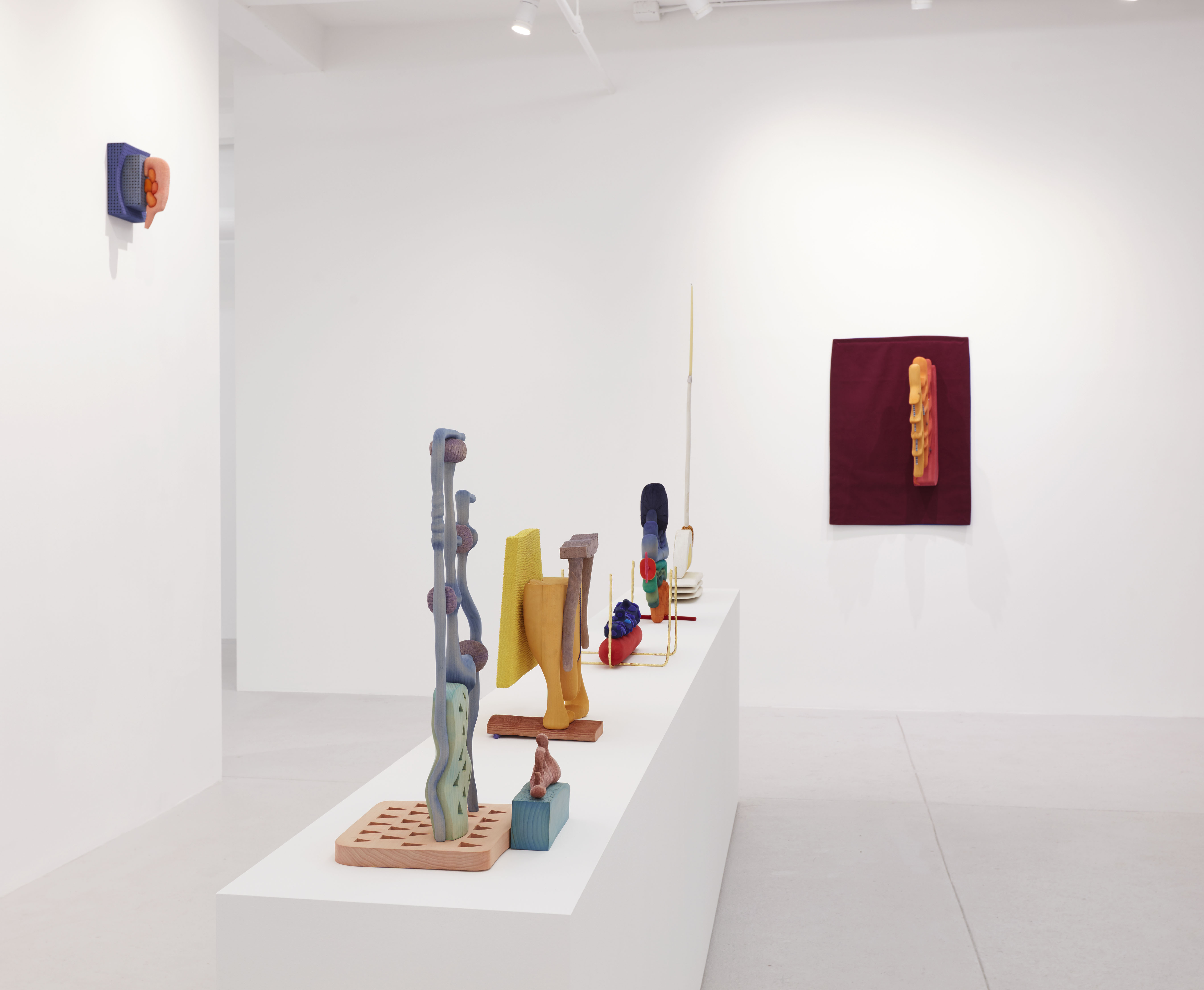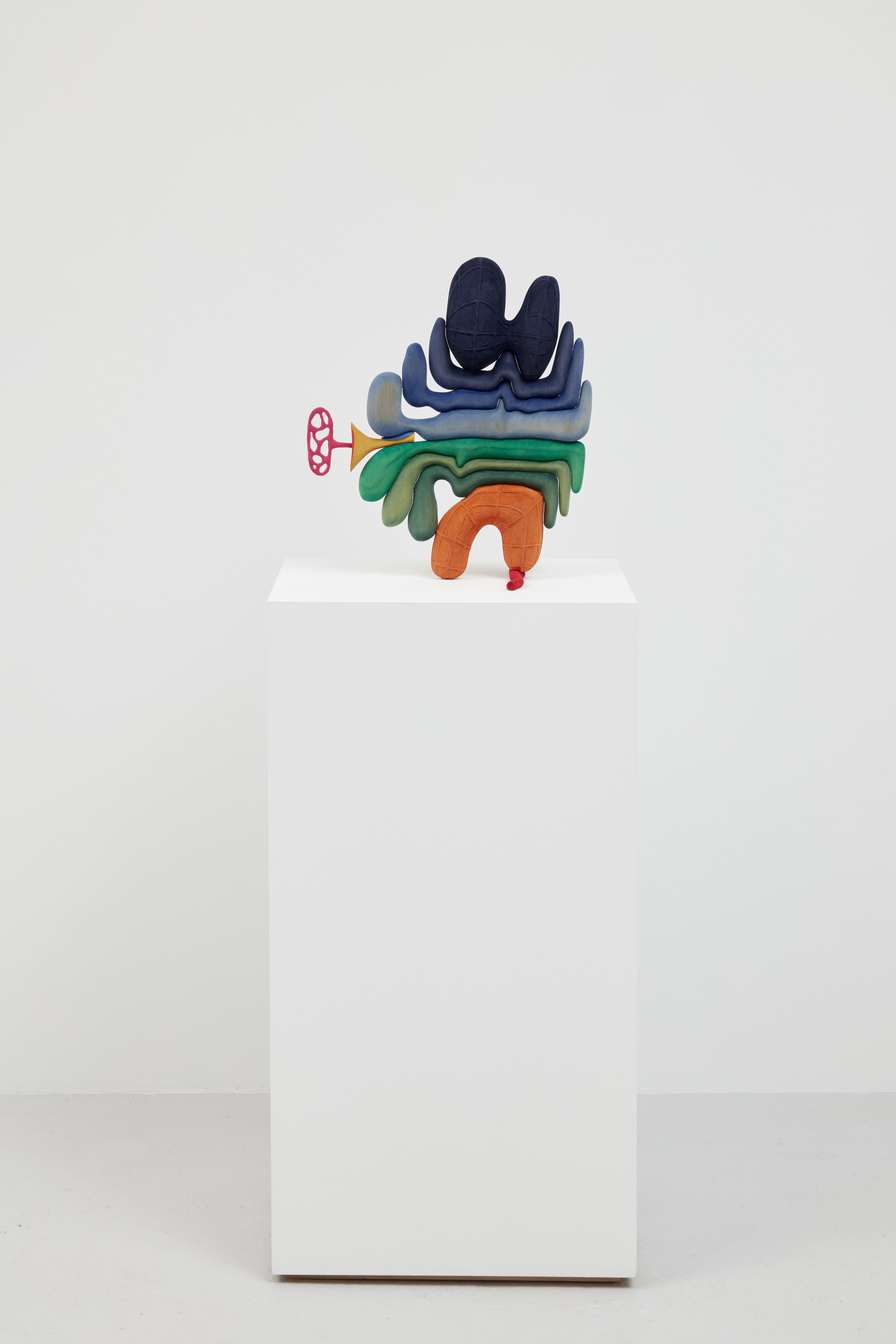 In the center of the room, five colorful sculptures are assembled on a single pedestal, designed in response to the viewing room architecture. Ronay subtracts his artworks by hand from basswood; whittling meticulous textures and carving individual forms that are then sanded and dyed in vibrant hues. Produced in relation to a daily, automatic drawing practice, the resulting sculptures embody surreal forms that oscillate between the organic and the synthetic. Over the years, his creations have continued to offer a window into a fantastical world where the boundaries between the ordinary and the surreal dissolve, encouraging new modes of perception through abstraction and play.