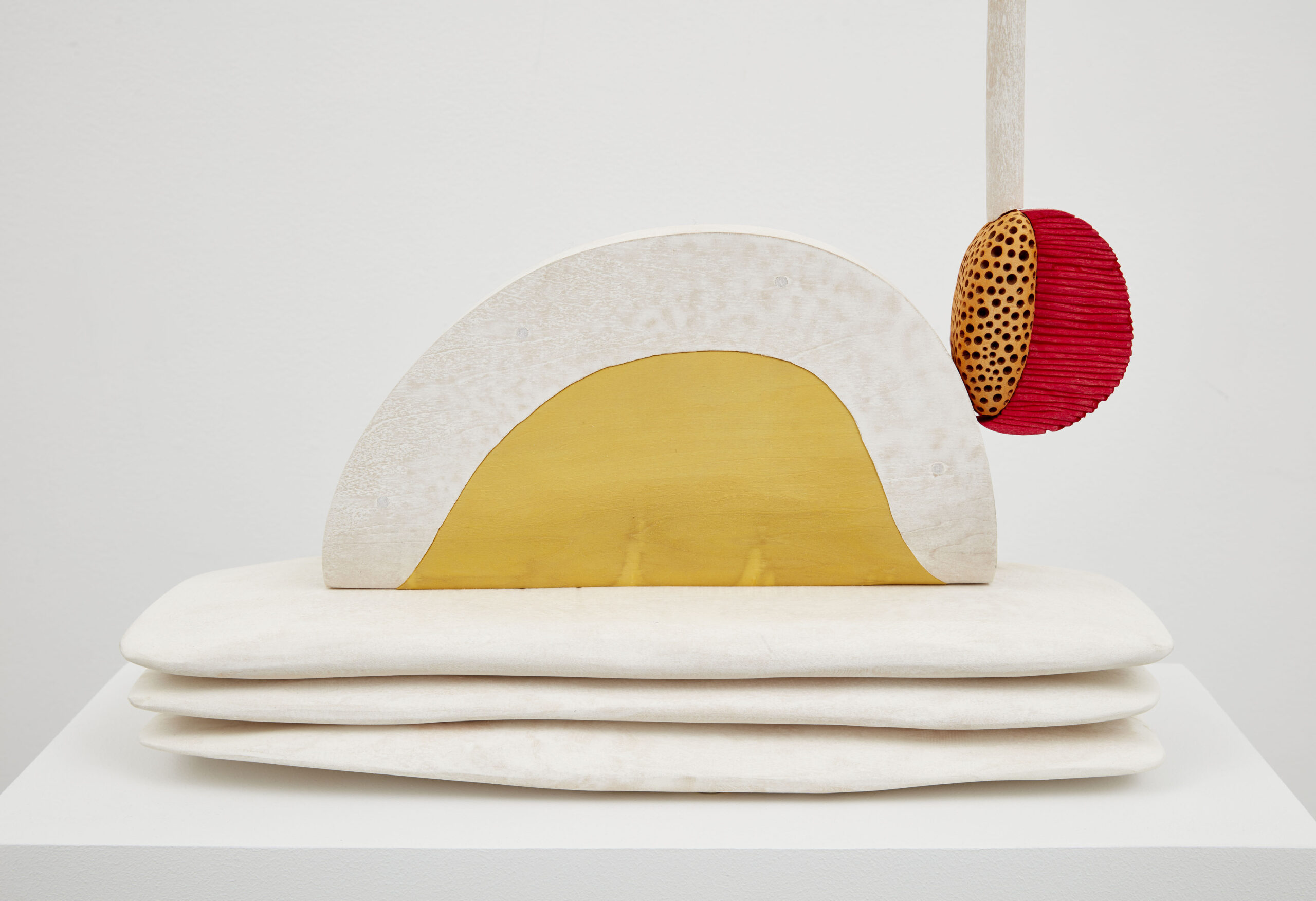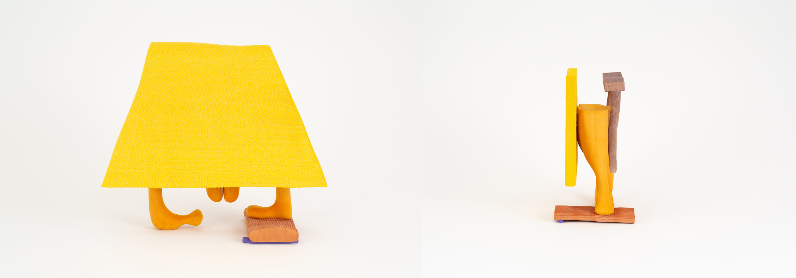 Linen and Leather Membrane (2020) echoes Ronay’s interest in natural phenomena in both form and title, referencing the human processing of organic substances. The sculpture suggests, but ultimately withholds, symmetry. Two marigold leg-like forms anchor the center of the composition. On one side, this symmetry is disrupted by a bright yellow trapezoid which covers much of the sculptural form while in other places basswood inserts tip the balance of the form. Intended to be viewed in the round, the geometrical balance of Linen and Leather Membrane changes from every direction one looks at it – no two angles are the same.