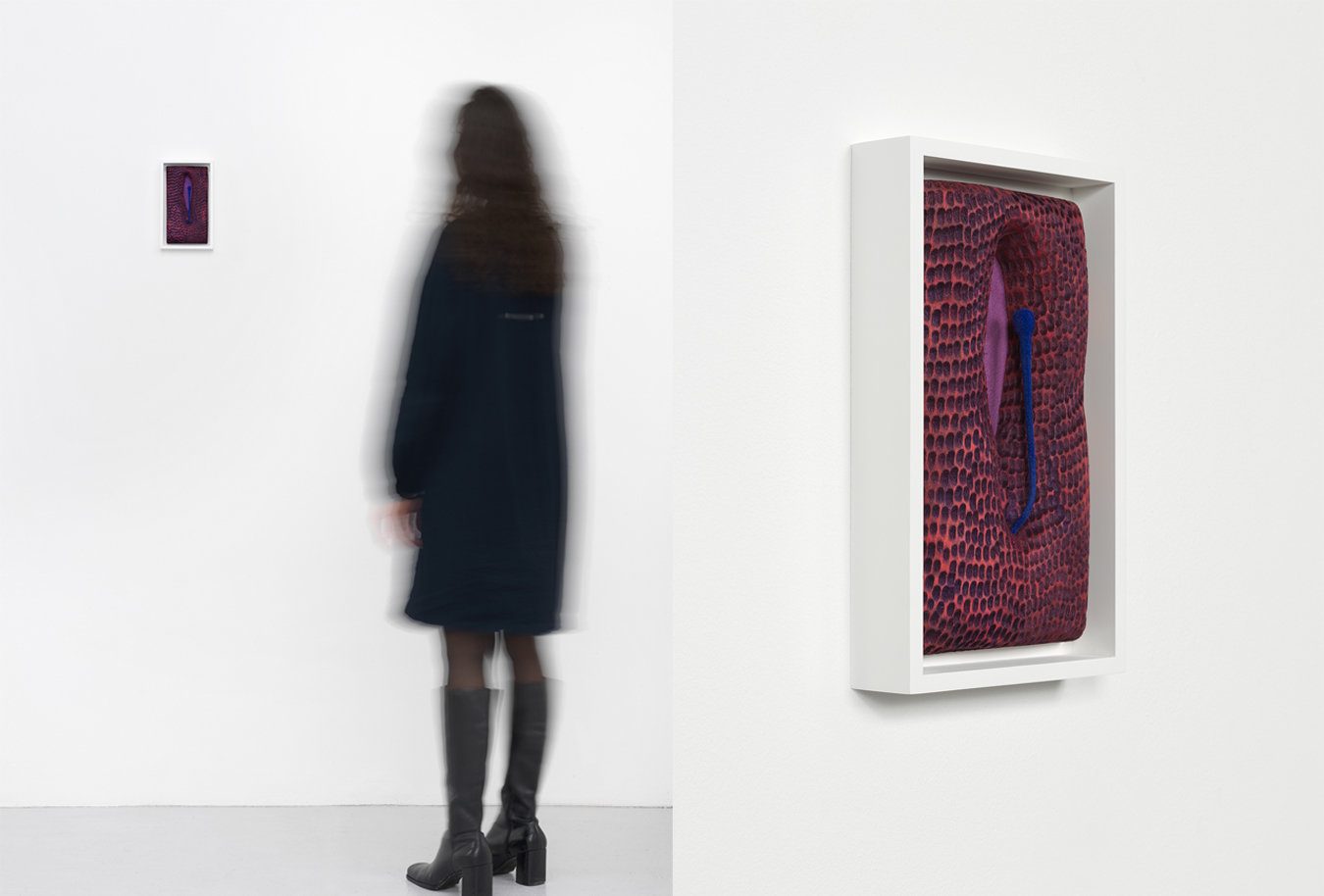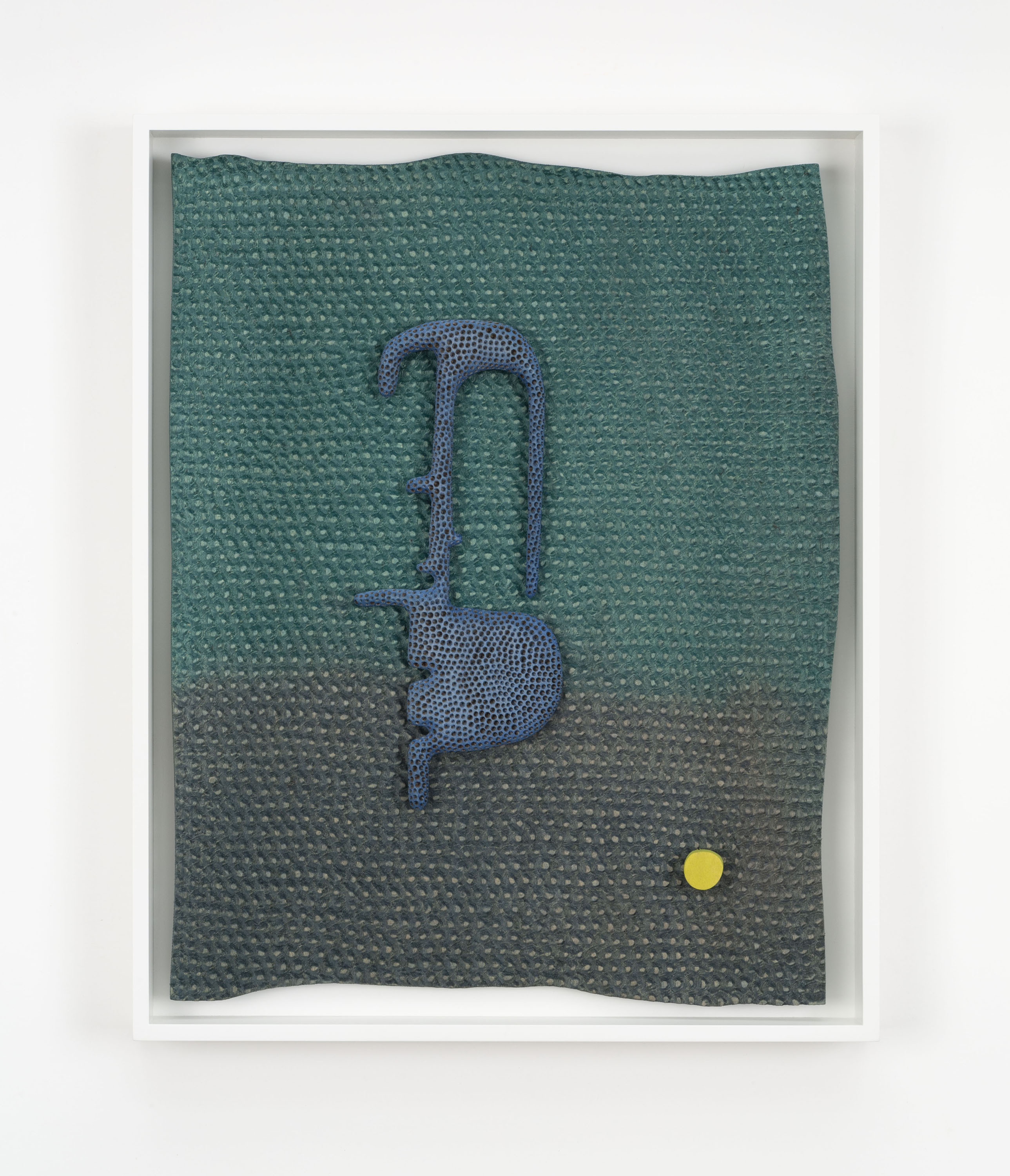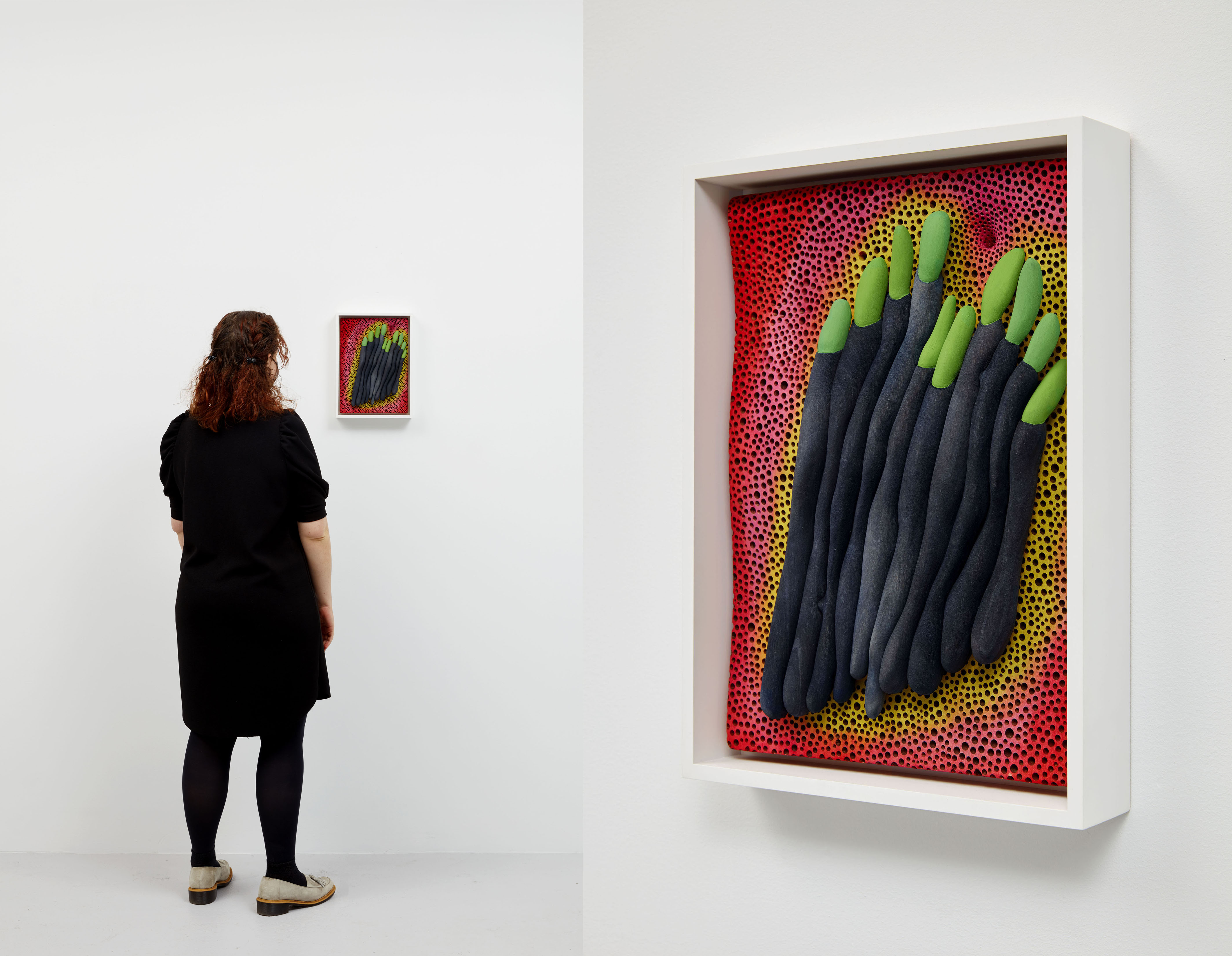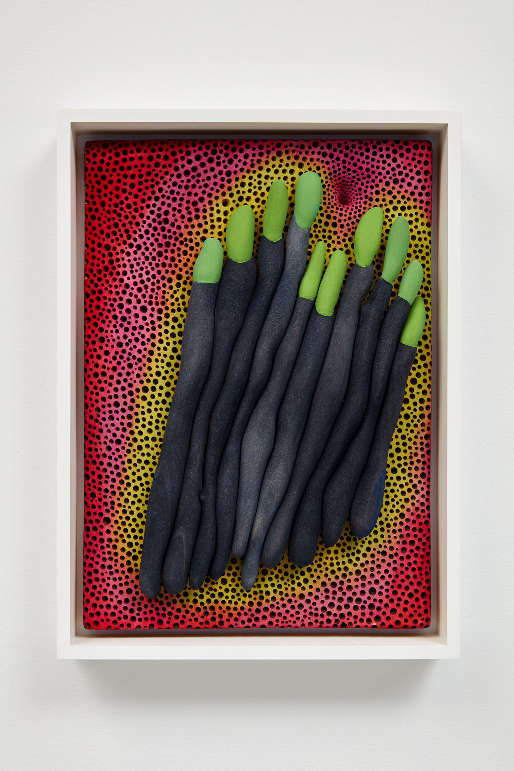 An earlier work, Ancestral Morphogen (2015), echoes Surrealist three-dimensional wall works of artists like Max Ernst or Salvador Dalí. Within the frame, an undulating red and orange background vibrates behind tubular black extremities that are accented by neon green ovular addendums. Together, the center components read as alien fingers, while the technicolor background is pockmarked with black circular indentations, like the markings on a strawberry or a porous moonscape.