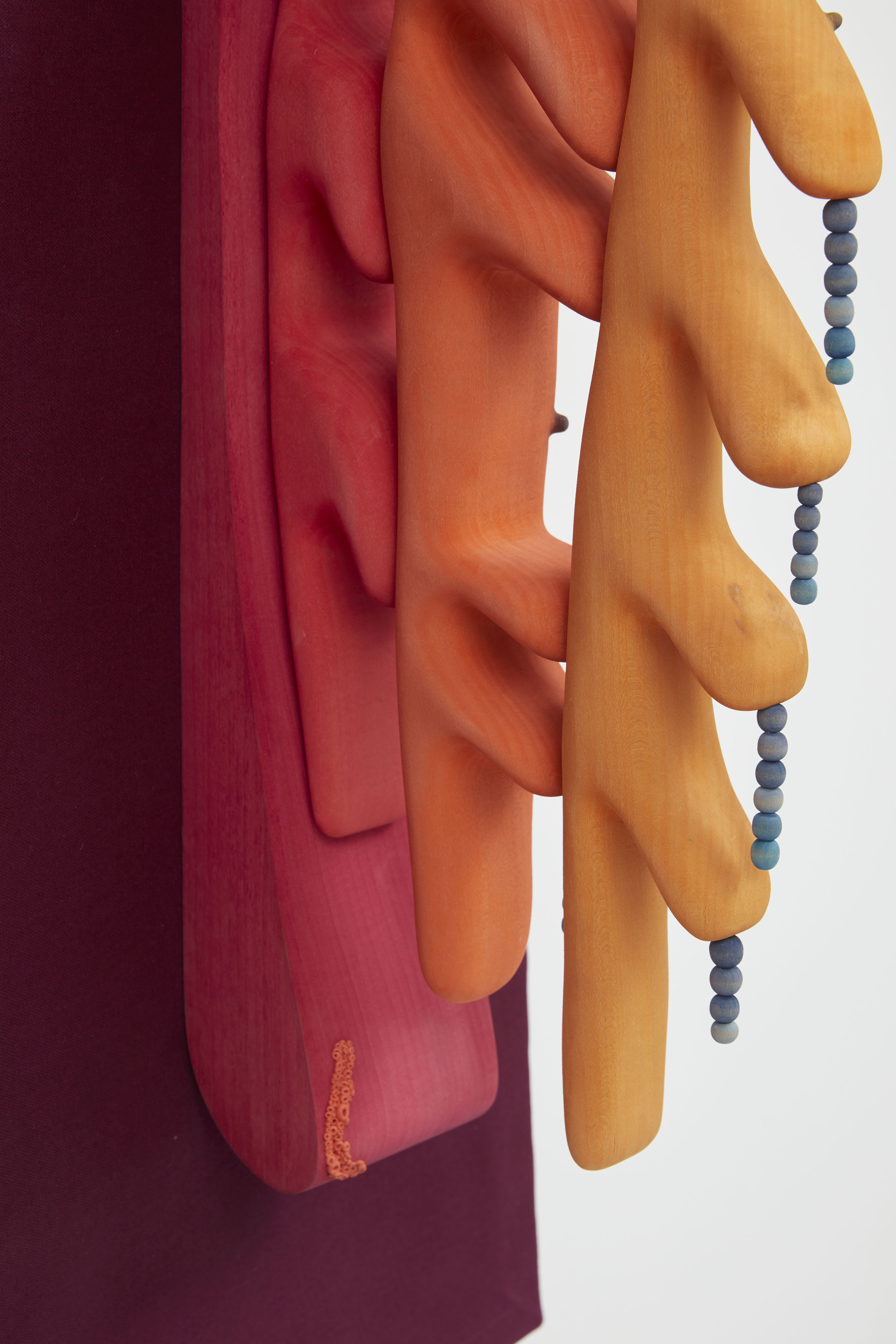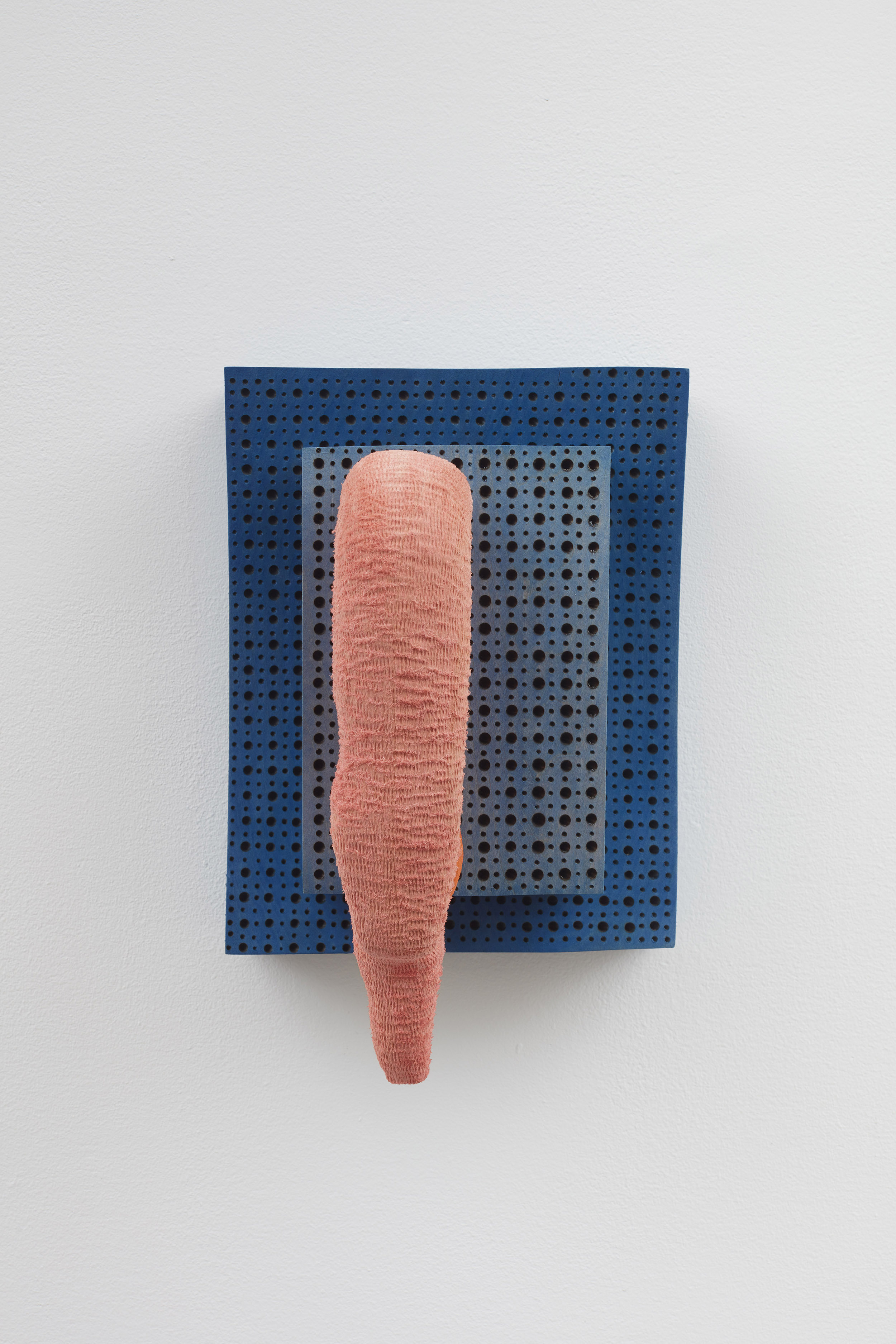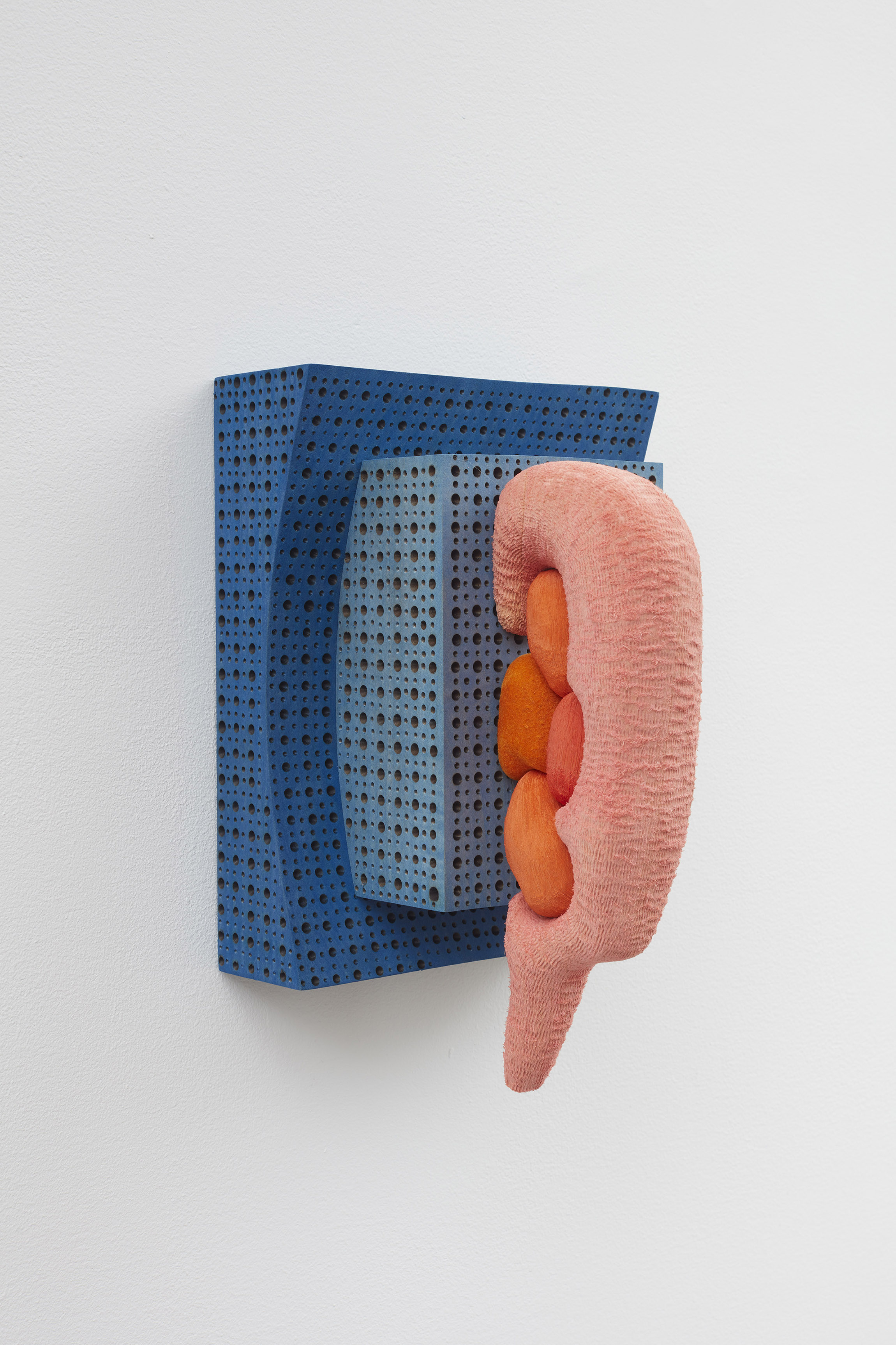 In Doorbell (2019), Ronay renders a phallic protrusion dyed in flesh-like hues, that resembles a human earlobe, organ, or microscopic organism. While the work’s title suggests the intended function of a door knocker, the piece is specifically installed far above eye level - lending the work a comedic quality in its inutility. The tactile basswood and meticulously carved details contrast with Ronay’s playful use color, further pushing the boundaries between the synthetic and organic.