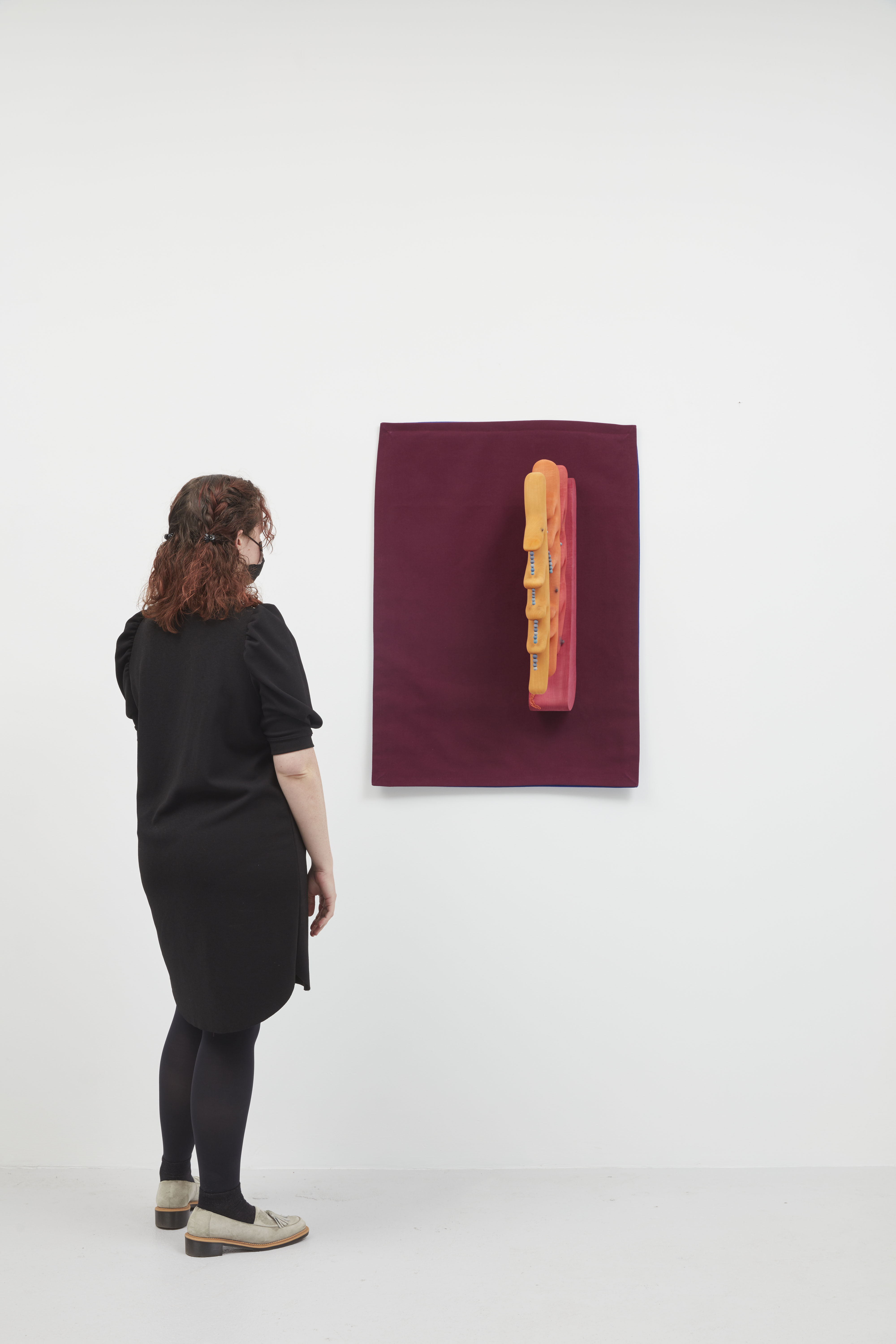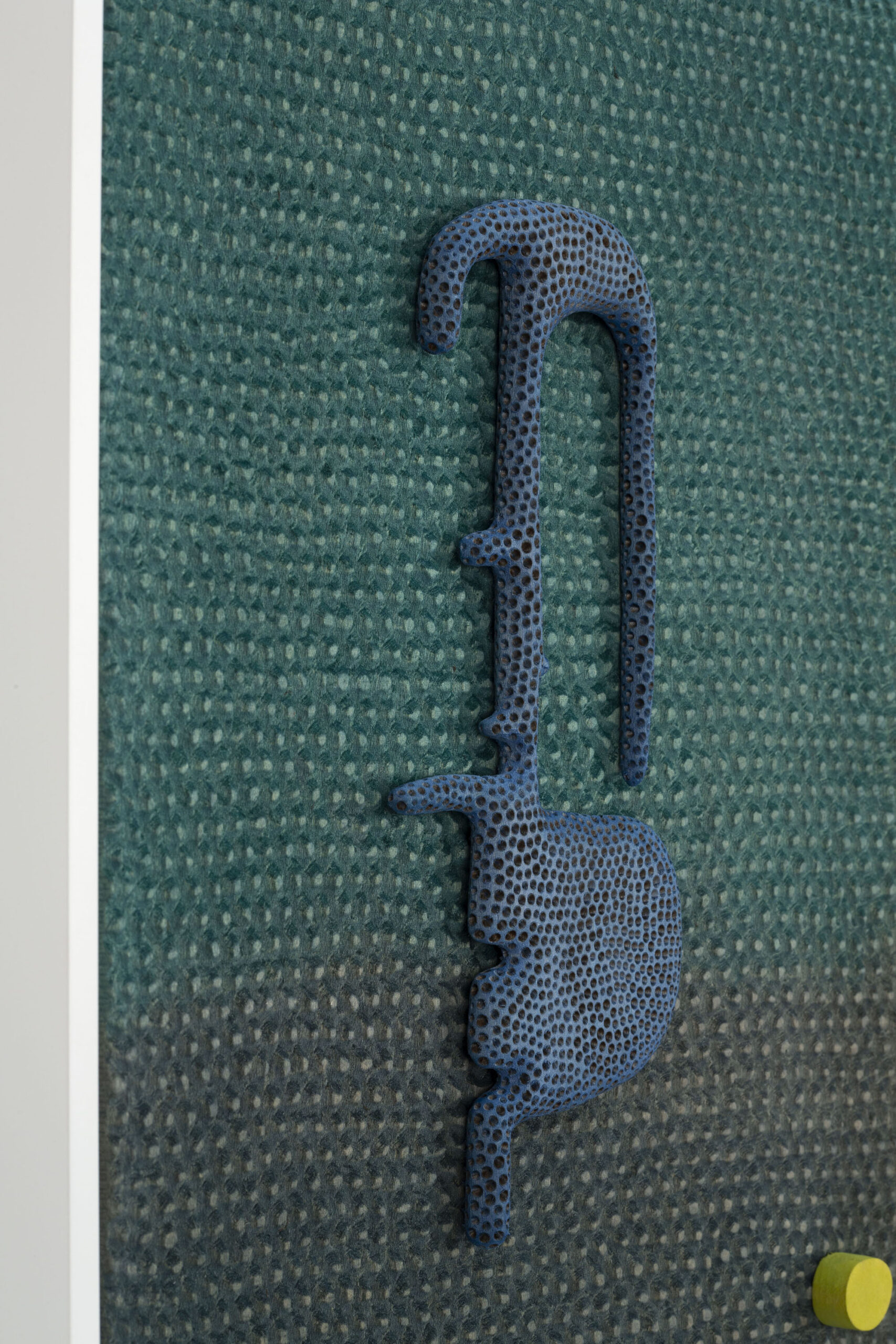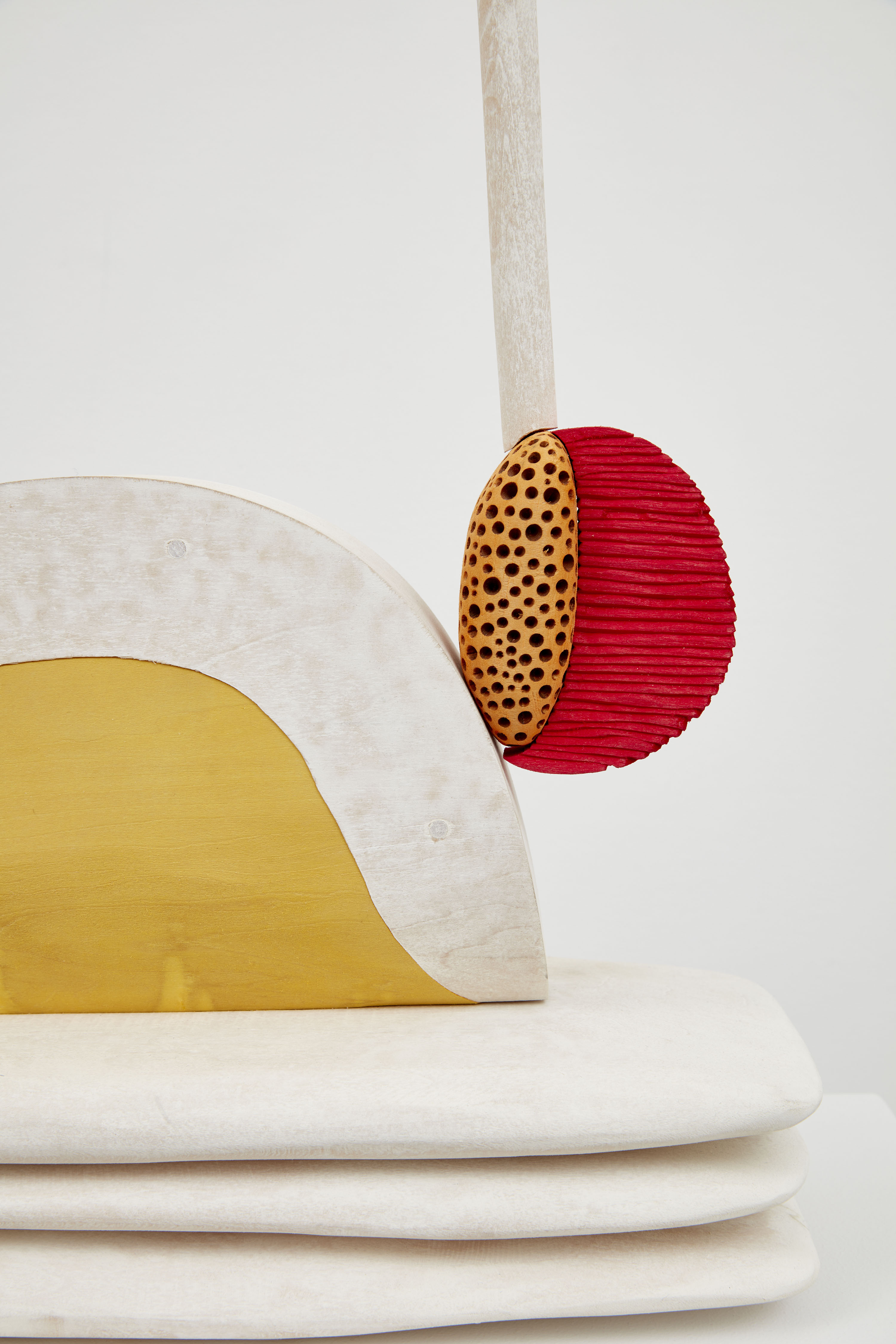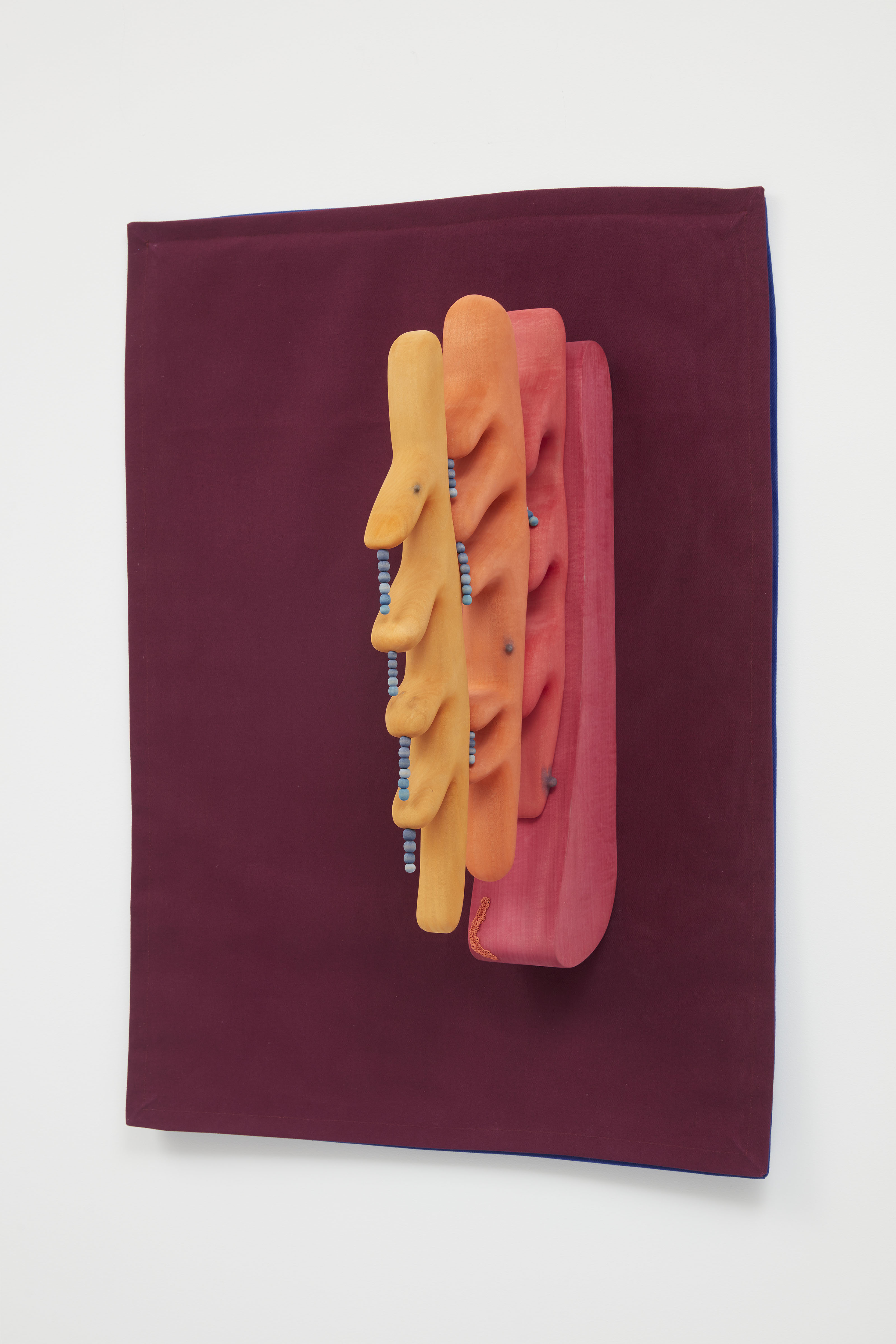 In Doorbell (2019), Ronay renders a phallic protrusion dyed in flesh-like hues, that resembles a human earlobe, organ, or microscopic organism. While the work’s title suggests the intended function of a door knocker, the piece is specifically installed far above eye level - lending the work a comedic quality in its inutility. The tactile basswood and meticulously carved details contrast with Ronay’s playful use color, further pushing the boundaries between the synthetic and organic.
